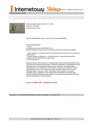 Utworzono: niedziela, 29 styczeń 2017 chemia jubilerska i kleje iglice probiercze X 1_585_c Nazwa produktu: iglice probiercze X 1_585_c Producent: POLSKA Model produktu: 56.30 IGLICA PROBIERCZA 14 Kt ZŁOTO CZERWONE IGLICE PROBIERCZE 1 sztuka do badania proby złota CZERWONE 14 Kt Metoda przybliżona badania złota na kamieniu probierczym Potrzebne produkty : Iglice probiercze / gwiazda probiercza Rysiki zakończone stopem złota o określonej znanej probie Kamień probierczy Najlepsze - o jednolitej barwie i o odpowiedniej twardości , naturalne jak lidyt, radiolaryt oraz czarny agat Ciecze probiercze Badanym stopem złota (wyrobem) , ktorego probę chcemy poznać wykonujemy narys na powierzchni kamienia probierczego. Dobieramy probę iglicy do spodziewanej proby badanego stopu i rownolegle wykonujemy narys. Nanosimy na powstałe ślady niewielką ilość cieczy probierczej, ktorej nadmiar usuwamy (np. bibułą) po upływie odpowiedniego czasu. Porownujemy wizualnie powstałe zmiany koloru narysow badanego stopu z narysami z iglicy. Ciemniejsze ślady świadczą o mniejszej zawartości złota. Uzyskując ten sam odcień koloru stwierdzamy że badany stop posiada probę iglicy Badanie można powtorzyć lub wykonać więcej narysow kilkoma iglicami probierczymi o rożnych probach Cena: 61.50zł z VAT (50.00zł bez VAT) Dostępność: Ten produkt został dodany do sklepu w dniu piątek, 27 styczeń 2017 http://www.arexpol.pl | [email protected] | | Strona 1/1