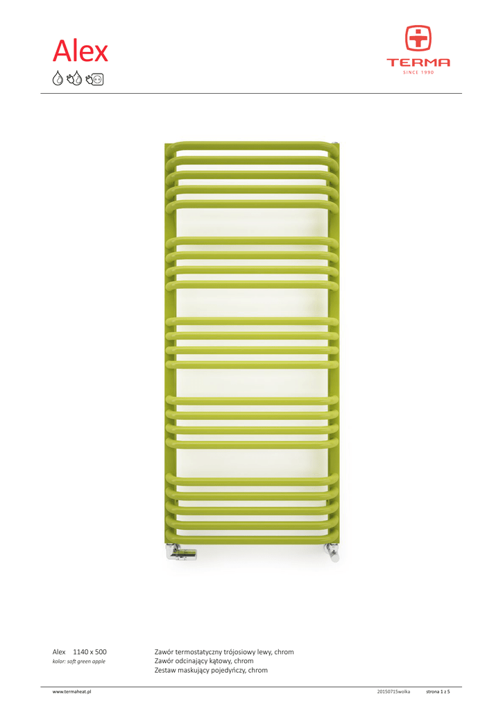 Alex Alex 1140 x 500 kolor: soft green apple www.termaheat.pl Zawór termostatyczny trójosiowy lewy, chrom Zawór odcinający kątowy, chrom Zestaw maskujący pojedyńczy, chrom 20150715wolka strona 1 z 5 Alex projekt: Terma Podłączenia: A ↕ 540÷1580: A ↕ 760÷1580: ahg(f)(u) (s)(e)(b)(r)(q) Grzejniki elektryczne (E)(F) (G)(H) xw Dostępne rozmiary: 3 I 4 I 3 540 x 300 ↕ 540 x 400 ↔ 5 I 4 I 4 I 4 I 5 1140 x 300 ↕ 540 x 500 1140 x 400 ↔ 1140 x 600 4 I 3 I 3 I 4 760 x 400 5 I 4 I 4 I 4 I 4 I 4 I 5 5 I 4 I 4 I 4 I 5 1140 x 500 4 I 3 I 3 I 4 760 x 300 540 x 600 5 I 4 I 4 I 4 I 5 5 I 4 I 4 I 4 I 5 4 I 3 I 3 I 4 3 I 4 I 3 3 I 4 I 3 3 I 4 I 3 760 x 500 760 x 600 5 I 4 I 4 I 4 I 4 I 4 I 5 5 I 4 I 4 I 4 I 4 I 4 I 5 5 I 4 I 4 I 4 I 4 I 4 I 5 1580 x 500 4 I 3 I 3 I 4 1580 x 600 1580 x 700 1580 x 800 Dane techniczne: Ciśnienie robocze: 1,0 MPa Maksymalna temperatura pracy: 95°C g p v A B C1 C2 75|65|20°C 55|45|20°C D E F ↕ ↔ [mm] [mm] [W] [W] [W] [mm] [mm] [mm] [dm³] [kg] 540 540 540 540 760 760 760 760 1140 1140 1140 1140 1580 1580 1580 1580 300 400 500 600 300 400 500 600 300 400 500 600 500 600 700 800 50 50 50 50 50 50 50 50 50 50 50 50 50 50 50 50 270 370 470 570 270 370 470 570 270 370 470 570 470 570 670 770 180 238 299 355 257 330 412 481 362 479 591 711 793 949 1104 1253 99 129 161 190 137 177 220 257 194 257 313 380 425 508 591 670 200 200 300 400 300 300 400 600 400 400 600 800 800 1000 1000 1200 270 370 470 570 270 370 470 570 270 370 470 570 470 570 670 770 355 355 355 355 575 575 575 575 955 955 955 955 1395 1395 1395 1395 94 94 94 94 94 94 94 94 94 94 94 94 94 94 94 94 1,75 2,04 2,32 2,60 2,46 2,85 3,25 3,65 3,78 4,41 5,03 5,65 6,90 7,75 8,60 9,45 3,57 4,21 4,85 5,49 4,95 5,85 6,74 7,64 7,56 8,97 10,38 11,79 14,17 16,09 18,01 19,93 www.termaheat.pl Kod produktu Kod konfiguracji s. 4 WGALE054030 WGALE054040 WGALE054050 WGALE054060 WGALE076030 WGALE076040 WGALE076050 WGALE076060 WGALE114030 WGALE114040 WGALE114050 WGALE114060 WGALE158050 WGALE158060 WGALE158070 WGALE158080 20150715wolka strona 2 z 5 Alex SX Z1 G1/2" Z1 Z1 G1/2" C2 G1/2" 45 G1/2" G1/2" C2 C2 G1/2" G1/2" C1 2 x G1/2" G1/2" 22 xx G1/2" 45 SX SX G1/2" 45 45 G1/2" B C1 C1 D Z8 2 x G1/2" G1/2" DD C1 G1/2" G1/2" G1/2" 22 xx G1/2" 45 E A Z8 Z8 45 BB F E A 5 C1 C1 F 5 120 120 120 30 2 2 30 A – wysokość B – szerokość C1-C5 – rozstaw podłączeń D – rozstaw konsol w poziomie E – rozstaw konsol w pionie, F – odległość od osi dolnej konsoli do dolnej krawędzi kolektora Kolektor: Profil: 30 30 22 30 22 www.termaheat.pl 20150715wolka strona 3 z 5 Alex W tabelach przy kartach technicznych produktów umieszczone są kody produktów, które dostarczają podstawowych informacji o produktach. W celu doprecyzowania właściwości produktu kody produktów należy uzupełnić o pełny kod konfiguracji. Kod konfiguracji należy umieścić w ciągu znaków po kodzie produktu jak w przykładzie poniżej: Budowa kodu konfiguracji grzejnika c.o. WGALE054030 K916SX KOD KARTOTEKI (umieszczony w tabeli przy produkcie) KOD KONFIGURACJI (uzupełniany ręcznie) Konfiguracja K 916 SX kod opakowania kod koloru kod podłączenia K - karton Budowa kodu konfiguracji grzejnika elektrycznego z czynnikiem grzewczym. WLALE054030 K916E1DRYM KOD KARTOTEKI (umieszczony w tabeli przy produkcie) KOD KONFIGURACJI (uzupełniany ręcznie) Konfiguracja K 916 E1 DRY M kod opakowania kod koloru kod podłączenia kod grzałki kod typu kabla grzałki K - karton Proszkowy podkład cynkowy C – kod proszkowego podkładu cynkowego uzupełniany jest w kodzie nietypowości. WLALE054030 K916SX C www.termaheat.pl kod nietypowości 20150715wolka strona 4 z 5 Alex Legenda Cr Grzejnik dostępny także w wersji chromowanej. Grzejnik dostępny w wersji c.o. Grzejnik przystosowany do pracy jako grzejnik c.o. z podłączoną grzałką elektryczną. Grzejnik dostępny w wersji elektrycznej z przewodem grzejnym lub z czynnikiem grzewczym i grzałką. Produkt fabrycznie przetestowany i gotowy do użytku. Podstawowy wariant podłączenia grzejnika. Ikona wskazuje sposób zasilania oraz powrotu wody w danym podłączeniu oraz umiejscowienie wkładki termostatycznej oraz grzałki, jeśli istnieje możliwość ich zamontowania. Typ podłączenia opcjonalnego dla danego grzejnika. Moc grzejnika elektrycznego lub sugerowana moc grzałki przeznaczonej do grzejnika c.o. Waga. Pojemność. www.termaheat.pl 20150715wolka strona 5 z 5