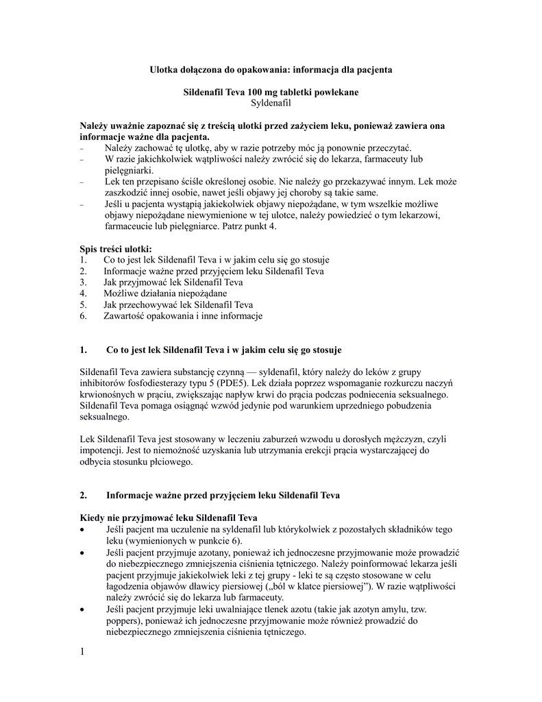 Ulotka dołączona do opakowania: informacja dla pacjenta Sildenafil Teva 100 mg tabletki powlekane Syldenafil Należy uważnie zapoznać się z treścią ulotki przed zażyciem leku, ponieważ zawiera ona informacje ważne dla pacjenta. Należy zachować tę ulotkę, aby w razie potrzeby móc ją ponownie przeczytać. W razie jakichkolwiek wątpliwości należy zwrócić się do lekarza, farmaceuty lub pielęgniarki. Lek ten przepisano ściśle określonej osobie. Nie należy go przekazywać innym. Lek może zaszkodzić innej osobie, nawet jeśli objawy jej choroby są takie same. Jeśli u pacjenta wystąpią jakiekolwiek objawy niepożądane, w tym wszelkie możliwe objawy niepożądane niewymienione w tej ulotce, należy powiedzieć o tym lekarzowi, farmaceucie lub pielęgniarce. Patrz punkt 4. Spis treści ulotki: 1. Co to jest lek Sildenafil Teva i w jakim celu się go stosuje 2. Informacje ważne przed przyjęciem leku Sildenafil Teva 3. Jak przyjmować lek Sildenafil Teva 4. Możliwe działania niepożądane 5. Jak przechowywać lek Sildenafil Teva 6. Zawartość opakowania i inne informacje 1. Co to jest lek Sildenafil Teva i w jakim celu się go stosuje Sildenafil Teva zawiera substancję czynną — syldenafil, który należy do leków z grupy inhibitorów fosfodiesterazy typu 5 (PDE5). Lek działa poprzez wspomaganie rozkurczu naczyń krwionośnych w prąciu, zwiększając napływ krwi do prącia podczas podniecenia seksualnego. Sildenafil Teva pomaga osiągnąć wzwód jedynie pod warunkiem uprzedniego pobudzenia seksualnego. Lek Sildenafil Teva jest stosowany w leczeniu zaburzeń wzwodu u dorosłych mężczyzn, czyli impotencji. Jest to niemożność uzyskania lub utrzymania erekcji prącia wystarczającej do odbycia stosunku płciowego. 2. Informacje ważne przed przyjęciem leku Sildenafil Teva Kiedy nie przyjmować leku Sildenafil Teva Jeśli pacjent ma uczulenie na syldenafil lub którykolwiek z pozostałych składników tego leku (wymienionych w punkcie 6). Jeśli pacjent przyjmuje azotany, ponieważ ich jednoczesne przyjmowanie może prowadzić do niebezpiecznego zmniejszenia ciśnienia tętniczego. Należy poinformować lekarza jeśli pacjent przyjmuje jakiekolwiek leki z tej grupy - leki te są często stosowane w celu łagodzenia objawów dławicy piersiowej („ból w klatce piersiowej”). W razie wątpliwości należy zwrócić się do lekarza lub farmaceuty. Jeśli pacjent przyjmuje leki uwalniające tlenek azotu (takie jak azotyn amylu, tzw. poppers), ponieważ ich jednoczesne przyjmowanie może również prowadzić do niebezpiecznego zmniejszenia ciśnienia tętniczego. 1 Ciężkie choroby serca lub wątroby. Niedawno przebyty udar lub zawał serca oraz w przypadkach niskiego ciśnienia tętniczego krwi. Dziedziczne zmiany degeneracyjne siatkówki, takie jak zwyrodnienie barwnikowe siatkówki (retinitis pigmentosa). Jeśli u pacjenta stwierdzono kiedykolwiek utratę wzroku w wyniku niezwiązanej z zapaleniem tętnic przedniej niedokrwiennej neuropatii nerwu wzrokowego. Ostrzeżenia i środki ostrożności Przed rozpoczęciem przyjmowania leku Sildenafil Teva należy omówić to z lekarzem, farmaceutą lub pielęgniarką w przypadku: Niedokrwistości sierpowatokrwinkowej (nieprawidłowość dotycząca czerwonych ciałek krwi), białaczki (choroba nowotworowa krwi), szpiczaka mnogiego (choroba nowotworowa szpiku kostnego). Jeśli u pacjenta stwierdzono anatomiczne zniekształceniu prącia lub chorobę Peyroniego. Dolegliwości ze strony serca. W tym przypadku lekarz powinien ocenić czy stan serca pozwala na dodatkowy wysiłek, jaki wiąże się z aktywnością seksualną. Choroby wrzodowej lub zaburzeń krzepnięcia (jak hemofilia); Jeśli wystąpi nagłe pogorszenie widzenia lub nagła utrata wzroku, należy przerwać stosowanie leku Sildenafil Teva i natychmiast skontaktować się z lekarzem. Leku Sildenafil Teva nie należy stosować jednocześnie z innymi stosowanymi doustnie lub miejscowo rodzajami terapii zaburzeń wzwodu. Leku Sildenafil Teva nie należy stosować jednocześnie z terapiami tętniczego nadciśnienia płucnego (TNP) z zastosowaniem syldenafilu ani innymi inhibitorami PDE5. Leku Sildenafil Teva nie należy przyjmować, jeśli nie stwierdzono zaburzeń erekcji. Sildenafil Teva nie jest lekiem przeznaczonym dla kobiet. Specjalne uwagi dotyczące pacjentów z zaburzeniami czynności nerek lub wątroby Pacjenci z zaburzeniami czynności nerek lub wątroby powinni poinformować o tym lekarza. Lekarz może zadecydować o zastosowaniu mniejszej dawki leku Sildenafil Teva. Dzieci i młodzież Leku Sildenafil Teva nie należy stosować u osób w wieku poniżej 18 lat. Sildenafil Teva a inne leki Należy powiedzieć lekarzowi lub farmaceucie o wszystkich lekach przyjmowanych przez pacjenta obecnie lub ostatnio, a także o lekach, które pacjent planuje przyjmować. Sildenafil Teva może wykazywać interakcje z niektórymi lekami, zwłaszcza stosowanymi w leczeniu bólu w klatce piersiowej. W przypadku pogorszenia się stanu zdrowia, wymagającego natychmistowej pomocy medycznej, należy poinformować lekarza, farmaceutę lub pielęgniarkę o zażyciu leku Sildenafil Teva oraz godzinie jego zażycia. Nie należy przyjmować leku Sildenafil Teva jednocześnie z innymi lekami, bez zalecenia lekarza. Nie należy stosować leku Sildenafil Teva jeśli pacjent przyjmuje leki z grupy azotanów ponieważ ich jednoczesne stosowanie może prowadzić do niebezpiecznego zmniejszenia ciśnienia 2 tętniczego. Należy zawsze poinformować lekarza, farmaceutę lub pielęgniarkę, jeśli pacjent przyjmuje azotany, które są stosowane w leczeniu dławicy piersiowej („ból w klatce piersiowej”). Nie należy stosować leku Sildenafil Teva jeśli pacjent przyjmuje leki uwalniające tlenek azotu (takie jak azotyn amylu), ponieważ ich jednoczesne stosowanie również może powodować niebezpieczne zmniejszenie ciśnienia tętniczego. W przypadku przyjmowania leków z