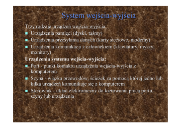 System wejścia-wyjścia Trzy rodzaje urządzeń wejścia-wyjścia: Urządzenia pamięci (dyski, taśmy) Urządzenia przesyłania danych (karty sieciowe, modemy) Urządzenia komunikacji z człowiekiem (klawiatury, myszy, monitory) Urządzenia systemu wejścia-wyjścia: Port - punkt kontaktu urządzenia wejścia-wyjścia z komputerem Szyna - wiązka przewodów, ścieŜek za pomocą której jedno lub kilka urządzeń komunikuje się z komputerem Sterownik - układ elektroniczny do kierowania pracą portu, szyny lub urządzenia System wejścia-wyjścia Programowe składowe podsystemu we-wy: Moduły wejścia-wyjścia, moduły sterujące - tworzą interfejs dostępu podsystemu we-wy do urządzeń Obsługa wejścia-wyjścia w jądrze systemu wywo łania systemowe wejścia-wyjścia Sterowanie urządzeniami wejścia-wyjścia Przekazywanie poleceń z procesora do sterownika: Sterownik posiada rejestry do pamiętania danych i sygnałów sterujących. Procesor pisze i czyta do rejestrów w sterowniku. Procesor posiada specjalne rozkazy do pisania i czytania portów, Operacje we-wy odbywają się w pamięci - rejestry są odwzorowywane w przestrzeni adresowej procesora. W komputerach IBM PC zastosowane są obydwie metody: Dla kontrolera grafiki - ekran odwzorowany w pamięci Dla portów szeregowych - rejestry we-wy i bufory Port wejścia-wyjścia Typowy port składa się z czterech rejestrów o długości 1-4 B kaŜdy: Stan (czytane przez procesor: zakończenie wykonywania polecenia, dostępność bajtu do czytania, błąd urządzenia) Sterowanie (zapisywane przez procesor: rozpoczęcie polecenia, zmiana trybu pracy urządzenia) Dane wejściowe (czytane przez procesor dane właściwe) Dane wyjściowe (zapisywane przez procesor dane dla urządzenia) Układ FIFO - „magazyn pośredni” - buforuje dane, których komputer lub urządzenie nie moŜe w danej chwili odebrać. Odpytywanie Do uzgadniania pomiędzy procesorem a urządzeniem w prostym schemacie producent-konsument wystarczą dwa bity: od strony procesora bit gotowości polecenia w rejestrze pleceń - sygnalizujący kompletne polecenie dla urządzenia od strony urządzenia bit zajętości (w rejestrze stanu), sygnalizujący Ŝe urządzenie jest zajęte pracą. Kolejność działań przy uzgadnianiu: Procesor realizuje aktywne czekanie, dopó dopóki bit zaję zajętoś tości jest ustawiony Procesor ustawia bit pisania i wpisuje bajt danych do rejestru danych danych wy. Procesor ustawia bit gotowoś gotowości polecenia Sterownik ustawia bit zaję zajętoś tości po zauwaŜ zauwaŜeniu bitu gotowoś gotowości polecenia Sterownik czyta rejestr poleceń poleceń, rozpoznaje polecenie pisania. Czyta bajt danych z rejestru i wykonuje na urzą urządzeniu operację operację wejś wejściacia-wyjś wyjścia Sterownik czyś czyści bit gotowoś gotowości polecenia, bit błedu, edu, a na koń końcu bit zaję zajętoś tości I tak dla kaŜdego bajtu danych Przerwania Jeś Jeśli urzą urządzenie jest rzadko gotowe do dział działania, odpytywanie staje się się nieefektywne ( procesor wię większość kszość czasu poś poświę więca na aktywne czekanie. Mechanizm przerwań: procesor ma końcówkę (nóŜkę) badającą stan linii zgłaszania przerwań po wykonaniu kaŜdego rozkazu. Jeśli procesor wykryje wystąpienie przerwania, to wykonuje operacje zachowania stanu bieŜącego procesu i przechodzi do procedur obsługi przerwań. Po wykonaniu niezbędnych operacji procesor wraca do wykonywania przerwanego zadania W nowoczesnych architekturach komputerów moŜliwa zaawansowana obsługa przerwań: - opóźnianie obsługi przerwania podczas działań krytycznych, - maskowanie przerwań (dwie linie przerwań - maskowalna i niemaskowalna) - przerwania wielopoziomowe o róŜnym priorytecie Bezpośredni dostęp do pamięci Jest uŜywany w celu uniknięcia transmisji bajt-po-bajcie (zwanego programowanym wejściem-wyjściem) dla urządzeń transmitujących wielkie ilo ści danych (np dysk), co oszczędza wiele cykli procesora Wiele procedur związanych z transmisją jest wtedy wykonywana przez specjalizowany procesor - sterownik bezpośredniego dostępu do pamięci (DMA controller) Przed rozpoczęciem transmisji w trybie DMA, procesor zapisuje w pamięci blok sterujący DMA (wskaźnik do źródła, adres docelowy, liczba bajtów do przesłania), następnie przesyła do sterownika DMA adres tego bloku i przechodzi do wykonywania innych prac. Sterownik DMA wykonuje transmisję, przejmując w tym czasie sterownie szyną pamięci. Procesor nie ma wtedy dostępu do pamięci, ale moŜe korzystać z cache i rejestrów. UŜytkowy interfejs we-wy Moduły sterujące - wewnętrznie dostosowane są do konkretnych urządzeń, a zewnętrznie udostępniają pewien standardowy interfejs standaryzacja pomaga producentom sprzętu tworzyć sterowniki do własnych urządzeń, widziane przez „obce” systemy operacyjne Systemy muszą umoŜliwiać instalację sterowników do nowego sprzętu RóŜnice między urządzeniami we-wy Urządzenie znakowe - przesyła bajty (znaki) z osobna jeden za drugim (terminal) Urządzenie blokowe - przesyła jednorazowo całe bloki (dysk) Dostęp sekwencyjny - dane przesyłane kolejno w sposób uporządkowany (modem) Dostęp swobodny - moŜna mieć dostęp do danych w róŜnych miejscach, niekoniecznie kolejno (CD-ROM) Przesyłanie synchroniczne - taktowane zegarem (taśma) przesyłanie asynchroniczne - w nieokreślonych chwilach czasu, sterowane startem i stopem (klawiatura) Urządzenie dzielone - przez kilka procesów (dysk) Wyłączne - tylko dla jednego uŜytkownika (taśma) Szybkość działania - od B/s do GB/s Kierunek przesyłania - czytanie, pisanie lub czytanie i pisanie Urządzenia sieciowe Sieciowe wejście-wyjście róŜni się znacznie od dyskowego, pod względem wydajności i adresowania Interfejs gniazda (socket) - aplikacje umoŜliwiają tworzenie gniazda, połączenie lokalnego gniazda ze zdalnym adresem, nasłuchiw