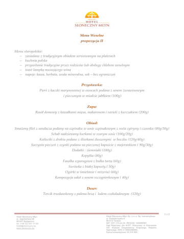Menu Weselne propozycja II Menu staropolskie: zasiadane z tradycyjnym obiadem serwowanym na platerach kuchnia polska przywitanie tradycyjne przez rodziców lub obsługę chlebem weselnym toast lampką musującego wina napoje: kawa, herbata, woda mineralna, sok – bez ograniczeń Przystawka: Pierś z kaczki marynowanej w owocach podana z sosem żurawinowym i pieczonym w miodzie jabłkiem (100g) Zupa: Rosół domowy z kawałkami mięsa, makaronem i ravioli z kurczakiem (200g) Obiad: Smażony filet z sandacza podany na szpinaku w sosie szpinakowym z nuta cytryny i czosnku (80g/30g) Schab nadziewany kurkami w szarym sosie (100g/20g) Kotleciki z drobiu podane z śliwkami duszonymi w boczku (120g/40g) Soczysta pieczeń z szynki podana na pieczonej kapuście z majerankiem ( 90g/30g) Dodatki : ziemniaki (100g) Kopytka (80g) Fasolka szparagowa z bułka tartą (60g) Surówka z białej kapusty.( 50g) Ogórki w śmietanie ( mizeria) (60g) Kompozycja sałat z sosem szczypiorkowym ( 40g) Deser: Torcik truskawkowy z palona bezą i lodem czekoladowym (120g) Hotel Słoneczny Młyn ul. Jagiellońska 96 85-027 Bydgoszcz tel. (+48 52) 561 31 60 [email protected] www.sloneczny.eu Hotel Słoneczny Młyn Sp. z o. o. Sp. komandytowa ul. Świętokrzyska 6 96-515 Teresin NIP: 837-173-24-34 REGON: 140808593 Sąd Rejonowy dla M.ST. Warszawy w Warszawie XIV Wydział Gospodarczy Krajowego Rejestru Sądowego, KRS nr 0000268895, Suma komandytowa 18 210 500 1z2 Bufet zimny: Łosoś wędzony marynowany w białym winie z limonkami Szynka z jajkiem na sosie tatarskim (50g) Tatar wołowy (40g) Majoneziki z dorsza (40g) Karkówka pieczona w czerwonym winie i wędzonych śliwkach (40g) Schab pieczony podany z musem chrzanowym i sosem malinowym (40g) Pasztet pieczony w cieście (40g) Deska Pieczeni staropolskich ( szynka, rostbef w winie, karkówka)( 100g) Sałatka z fasolki i jajek na zielonych sałatach (50g) Sałatka śledziowa z buraczkami i jajkiem ( śledź pod pierzynką )( 50g) Sałatka z feta i sosem ze świeżej bazylii (40g) Słodki Bufet: Platery owoców sezonowych (150g) Dania serwowane po północy do wyboru: Barszcz z pasztecikiem (200g) Zupa gulaszowa z nutą papryki i pomarańczy (180g) Proponowana cena za 1 osobę: 210,00 zł Hotel Słoneczny Młyn ul. Jagiellońska 96 85-027 Bydgoszcz tel. (+48 52) 561 31 60 [email protected] www.sloneczny.eu Hotel Słoneczny Młyn Sp. z o. o. Sp. komandytowa ul. Świętokrzyska 6 96-515 Teresin NIP: 837-173-24-34 REGON: 140808593 Sąd Rejonowy dla M.ST. Warszawy w Warszawie XIV Wydział Gospodarczy Krajowego Rejestru Sądowego, KRS nr 0000268895, Suma komandytowa 18 210 500 2z2