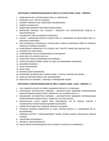 SPOTKANIA Z PROJEKTODAWCAMI W DNIU 25 LUTEGO GODZ. 18:00 – OBSZAR I 1. 2. 3. 4. 5. 6. 7. 8. 9. 10. 11. 12. 13. 14. 15. 16. 17. 18. 19. 20. 21. 22. ROZBUDOWA PĘTLI AUTOBUSOWEJ PRZY UL. WIERTNICZEJ. PARKOWE ULICE- 1M2 DLA DRZEWA. REMONT PARKINGU PRZY CMENTARZU WILANOWSKIM. ŻŁOBEK DLA MALUCHA. MIĘDZYPOKOLENIOWA PRACOWNIA MODELARSKA. BEZPIECZNE PRZEJŚCIA DLA PIESZYCH I PRZEJAZDY DLA ROWERZYSTÓW WZDŁUŻ AL. RZECZYPOSPOLITEJ. CAŁOROCZNY TENIS NA ŚWIEŻYM POWIETRZU. SCHODY – BEZPIECZNE ZEJŚCIE ZE SKARPY PRZY UL. SARMACKIEJ DO PRZYSTANKU PRZY UL. KRÓLOWEJ MARYSIEŃKI. GRA PLANSZOWA INTEGRUJĄCA, STYMULUJĄCA FUNKCJE POZNAWCZE OSÓB PO UDARACH MÓZGU/Z CHOROBĄ OTĘPIENIA. UDAR MÓZGU? DEMENCJA? O CO CHODZI, JAK Z TYM ŻYĆ? BOIMY SIĘ! SZKOLIMY SIĘ! INTERNET DLA WSZYSTKICH. USPRAWNIENIE RUCHU ROWEROWEGO W WILANOWIE. MAPY MSI, CZYLI PROSTO DO CELU. ŁAWKI PRZY ŚCIEŻCE ROWEROWEJ DO POWSINA I. DZIEŃ ŻYCZLIWOŚCI WOBEC KOBIET W CIĄŻY DLA MIESZKANEK WILANOWA. WILANÓW W RÓŻACH. ROLKI W WILANOWIE. SKATE PARK. RÓWNA ŚCIEŻKA ROWEROWA. NIEWIDOMI SĄ WŚRÓD NAS I RAZEM Z NAMI – II EDYCJA. DOTKNIJ WILANOWA. KOSZE NA ODPADKI WZDŁUŻ ALEI WILANOWSKIEJ. BIBLIOTEKA DLA SENIORA – MÓWIĄCE I POWIĘKSZONE KSIĄŻKI SPOTKANIA Z PROJEKTODAWCAMI W DNIU 1 MARCA GODZ. 18:00 – OBSZAR I, II 1. PLAC ZABAW DLA DZIECI W PARKU LINEARNYM WZDŁUŻ UL. KLIMCZAKA. 2. ODCZARUJMY MATEMATYKĘ! SOROBAN – MATEMATYCZNE NARZĘDZIE WSPOMAGAJĄCE WSZECHSTRONNY ROZWÓJ DZIECI. WARSZTATY DLA UCZNIÓW KLAS 1-3. 3. ODCZARUJMY MATEMATYKĘ! SOROBAN – MATEMATYCZNE NARZĘDZIE WSPOMAGAJĄCE WSZECHSTRONNY ROZWÓJ DZIECI. WARSZTATY DLA NAUCZYCIELI. 4. REWITALIZACJA PLACU ZABAW PRZY PRZEDSZKOLU NR 56 WESOŁE KUBUSIE Z PLENEROWYM, DYDAKTYCZNYM KĄCIKIEM MUZYCZNYM. 5. OGRÓD DESZCZOWY PRZY URZĘDZIE DZIELNICY WILANÓW. 6. WYMIANA SŁUPKÓW PARKOWYCH W CIĄGU PIESZYM WZDŁUŻ UL. SOBIESKIEGO DO AL. WILANOWSKIEJ. 7. POPRAWA ESTETYKI I FUNKCJONALNOŚCI TERENU WOKÓŁ KANAŁU WOLICKIEGO WZDŁUŻ HLONDA. 8. ZADASZONE PIASKOWNICE I. 9. SPACER AL. RZECZYPOSPOLITEJ. 10. ZAKUP DRONA WYKRYWAJĄCEGO DYM ZE ŚMIECI PALONYCH W KOMINKACH. OBSZAR II 11. 12. 13. 14. 15. 16. 17. 18. 19. 20. 21. ŻŁOBEK DLA MALUCHA. WIATY NA PRZYSTANKACH LATOSZKI I ZAKAMAREK. REWITALIZACJA UL. GRATYNY – NAŁOŻENIE NAKŁADKI ASFALTOWEJ. POKAZ SZARŻY HUSARII. ILUMINACJA BUDYNKU. WRZUTNIA NA KSIĄŻKI – FILIA W POWSINIE BIBLIOTEKI PUBLICZNEJ W DZIELNICY WILANÓW M.ST. WARSZAWY. ZAKUP DRONA WYKRYWAJĄCEGO DYM ZE ŚMIECI PALONYCH W KOMINKACH. ORGANIZACJA CYKLU SPOTKAŃ AUTORSKICH „WĘDRÓWKI LITERACKIE” W BIBLIOTECE PUBLICZNEJ W DZIELNICY WILANÓW M. ST. WARSZAWY. DOPOSAŻENIE GIMNAZJUM NR 116 W SPRZĘT SPORTOWY. ZADASZONE PIASKOWNICE. KULTURALNY WILANÓW – ZNACZY TEŻ CZYSTY WILANÓW. SPOTKANIA Z PROJEKTODAWCAMI W DNIU 3 MARCA GODZ. 18:00 – OBSZAR II 1. ZACZAROWANY LAS. 2. BUDOWA CHODNIKA WZDŁUŻ UL. SYTEJ OD OSIEDLA OGRODY WILANOWSKIE DO PRZYSTANKU AUTOBUSOWEGO GLEBOWA 02. 3. NOWA PONCZOWA 4. REMONT NAWIERZCHNI UL. ROTMISTRZOWSKIEJ. 5. ODCZARUJMY MATEMATYKĘ! SOROBAN – MATEMATYCZNE NARZĘDZIE WSPOMAGAJĄCE WSZECHSTRONNY ROZWÓJ DZIECI. WARSZTATY DLA NAUCZYCIELI. 6. ODCZARUJMY MATEMATYKE! SOROBAN – MATEMATYCZNE NARZĘDZIE WSPOMAGAJĄCE WSZECHSTRONNY ROZWÓJ DZIECI. WARSZTATY DLA UCZNIÓW KLAS 1-3. 7. NIEWIDOMI SĄ WŚRÓD NAS I RAZEM Z NAMI – II EDYCJA. DOTKNIJ OŚRODKA SPORTU. 8. ROWEREM DO KONSTANCINA. 9. DZIEŃ ŻYCZLIWOŚCI WOBEC KOBIET W CIĄŻY DLA MIESZKANEK WILANOWA. 10. ŁAWKI PRZY ŚCIEŻCE ROWEROWEJ DO POWSINA II. 11. LEPSZA SZKOŁA! OCENIANIE KSZTAŁTUJĄCE DLA RODZICÓW! – WILANÓW. 12. CZYSZCZENIE BUDEK DLA PTAKÓW – EKO MIASTO. 13. ŁĄKA KWIETNA NA ULICY PRZYCZÓŁKOWEJ – EKO MIASTO. 14. ASFALTOWA UL. RUCZAJ. 15. CHODNIK WZDŁUŻ UL. WIECHY. 16. CAŁOROCZNY CYKL TURNIEJÓW PIŁKI NOŻNEJ WILANOWSKA LIGA MISTRZÓW DLA DZIECI. 17. UDAR MÓZGU? DEMENCJA? O CO CHODZI, JAK Z TYM ŻYĆ? NIE BOIMY SIĘ! SZKOLIMY SIĘ! 18. GRA PLANSZOWA INTEGRUJĄCA, STYMULUJĄCA FUNKCJE POZNAWCZE OSÓB PO UDARACH MÓZGU/ Z CHOROBĄ OTĘPIENNĄ. 19. PASIEKA EDUKACYJNA. 20. SAMOOBSŁUGOWE STACJE NAPRAWY ROWERÓW. 21. ODBUDOWA MOSTKU DLA PIESZYCH I ROWERZYSTÓW NAD RZEKĄ WILANÓWKĄ W CIĄGU UL. TRÓJPOLOWEJ W WILANOWIE.