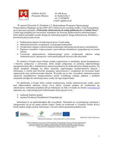 GMINA KOZY Przyjazne Miejsce 43-340 Kozy ul. Krakowska 4 tel: 33 8298650 e-mail: [email protected] W ramach Priorytetu II. Działanie 2.2. Regionalnego Programu Operacyjnego Województwa Śląskiego na lata 2007-2013 Gmina Kozy uzyskała środki z Unii Europejskiej na rozpoczęcie projektu „WdroŜenie elektronicznych usług publicznych w Gminie Kozy”. Celem tego projektu jest stworzenie warunków do rozwoju społeczeństwa informacyjnego, które będzie posiadało szeroki dostęp do informacji poprzez drogę elektroniczną. Działania z pewnością przyczynią się do: Podniesienia jakości świadczonych przez Urząd usług ObniŜenia kosztów związanych z ich przeprowadzeniem Zwiększenie stopnia wykorzystania technologii informatycznych przez mieszkańców Poprawa warunków rozpoczynania i prowadzenia działalności gospodarczej na terenie Gminy Tworzenie społeczeństwa informacyjnego przez zwiększanie zakresu usług elektronicznych i płynących z nich potencjalnych korzyści dla obywateli. W ramach e-Urzędu nasza Gmina została wyposaŜona w niezbędny sprzęt komputerowy i biurowy połączony z serwerami, które dzięki połączeniu za pomocą odpowiedniego oprogramowania dla e-Administracji stanowią podstawę do elektronicznej obsługi petenta. Na całość urządzeń składają się takŜe elementy zapewniające bezpieczeństwo danych i informacji, a wśród nich firewall, programy antywirusowe i urządzenie do tworzenia kopii zapasowych oraz archiwizowania danych. Wszystko po to aby wszystkim zainteresowanym zapewnić kompleksowe bezpieczeństwo przed wszelkiego rodzaju atakami i próbami uzyskania dostępu do informacji przez osoby do tego niepowołane. Na platformie e-Urząd, która została uruchomiona, kaŜda zainteresowana osoba, moŜe pod odpowiednim adresem strony www (który zostanie podany do wiadomości po zakończeniu wdraŜania projektu) lub po kliknięciu na link e-Urzędu na stronie www.kozy.pl zapoznać się z najwaŜniejszymi informacjami dotyczącymi m.in.: realizacji budŜetu gminy rejestru Ewidencji Działalności Gospodarczej Informacje te są ogólnodostępne dla wszystkich. Natomiast po wcześniejszej rejestracji i zalogowaniu się na tej samej stronie (login i hasło są wydawane w Urzędzie Gminy Kozy) kaŜdy będzie mógł uzyskać informacje o swoich zobowiązaniach podatkowych. Regionalny Program Operacyjny Województwa Śląskiego – realna odpowiedź na realne potrzeby Projekt współfinansowany przez Unię Europejską z Europejskiego Funduszu Rozwoju Regionalnego w ramach Regionalnego Programu Operacyjnego Województwa Śląskiego na lata 2007-2013. Informacje źródłowe na temat Regionalnego Programu Operacyjnego Województwa Śląskiego na lata 2007-2013 znajdują się na stronie www.rpo.silesia-region.pl 1 Po zalogowaniu i wybraniu podmiotu/podatnika na ekranie wyświetlona zostanie karta główna z informacjami o rodzajach zobowiązań (podatek/opłata) ich kwotach zapłaconych i saldzie ogólnym. Klikając w poszczególne odnośniki uzyskamy informacje o: danych technicznych na podstawie których naliczono podatek operacjach księgowych na naszym koncie (równieŜ ich historii) liczbach i kwotach rat wraz z informacją o stanie ich spłaty Cały proces komunikacji z platformą jest szyfrowany protokołem SSL. Bezpieczeństwo poufność danych. potwierdzają nam odpowiednie certyfikaty zapewniające Na ekranie zobaczymy równieŜ informacje odnośnie dotyczą i aktualnie mają swój bieg administracyjny w spraw, które Urzędzie. nas jeŜeli jesteśmy w Elektroniczne załatwianie spraw moŜemy rozpocząć posiadaniu elektronicznego podpisu kwalifikowanego (wiąŜe się to z jednorazową opłatą, którą trzeba pokryć we własnym zakresie), lub podpisu elektronicznego CCSEKAP. Podpis ten moŜna uzyskać w Urzędzie Gminy, wydawany jest zainteresowanym osobom bezpłatnie. Podpis CCSEKAP umoŜliwi nam załatwienie urzędowej sprawy drogą elektroniczną. W tym drugim przypadku jesteśmy jednak ograniczeni moŜliwością komunikowania się wyłącznie z Urzędami z województwa śląskiego. Docelowo projekt ten ma równieŜ umoŜliwić integrację z ministerialną platformą ePUAP o zasięgu ogólnopolskim, co pozwoli nam komunikować się elektronicznie z wszystkimi organizacjami administracji publicznej w całym kraju. E - Urząd Korzystanie z usług urzędu w postaci elektronicznej trzeba zacząć od załoŜenia skrzynki kontaktowej na stronie www.sekap.pl w zakładce Logowanie. UmoŜliwia ona korespondencję z urzędem, sprawdzanie i załatwienie sprawy oraz kontrolę niezbędnych płatności. Aby to zrobić naleŜy kliknąć na napis Zarejestruj się znajdujący się poniŜej okna logowania. 2 Rejestracja skrzynki kontaktowej składa się z czterech kroków: Krok 1: Po przeczytaniu regulaminu naleŜy potwierdzić oświadczenie zaznaczając checkbox. Następnie naleŜy wybrać podmiot rejestrujący skrzynkę kontaktową. W zaleŜności od dokonanego wyboru (Osoba fizyczna lub Inny podmiot) ustalane są pola na kolejnym formularzu. Po dokonaniu wyboru naleŜy nacisnąć przycisk Dalej. Po kliknięciu tego przycisku pojawi się formularz identyfikacyjny nowego konta. Aby kontynuować rejestrację naleŜy wypełnić wszystkie pola kolejnych zakładek, oznaczone czerwoną gwiazdką, rzeczywistymi danymi. Krok 2: Wygląd tego formularza jest zaleŜy od wyboru dokonanego na poprzedniej stronie. Dla typu Osoba fizyczna naleŜy uzupełnić swoje dane osobowe (pola oznaczone gwiazdką są obowiązkowe). 3 Dla typu Inny podmiot formularz kroku drugiego wygląda następująco: Krok 3: W kroku 3 naleŜy uzupełnić dane kontaktowe. Większość pól nie jest wymagana ale im więcej zostanie uzupełnionych tym mniej informacji będzie do uzupełnienia podczas wysyłania e-dokumentu do urzędu Po prawidłowym wypełnieniu wszystkich pól, naleŜy zatwierdzić wprowadzone dane, klikając przycisk Dalej, co spowoduje przeładowanie strony i wyświet