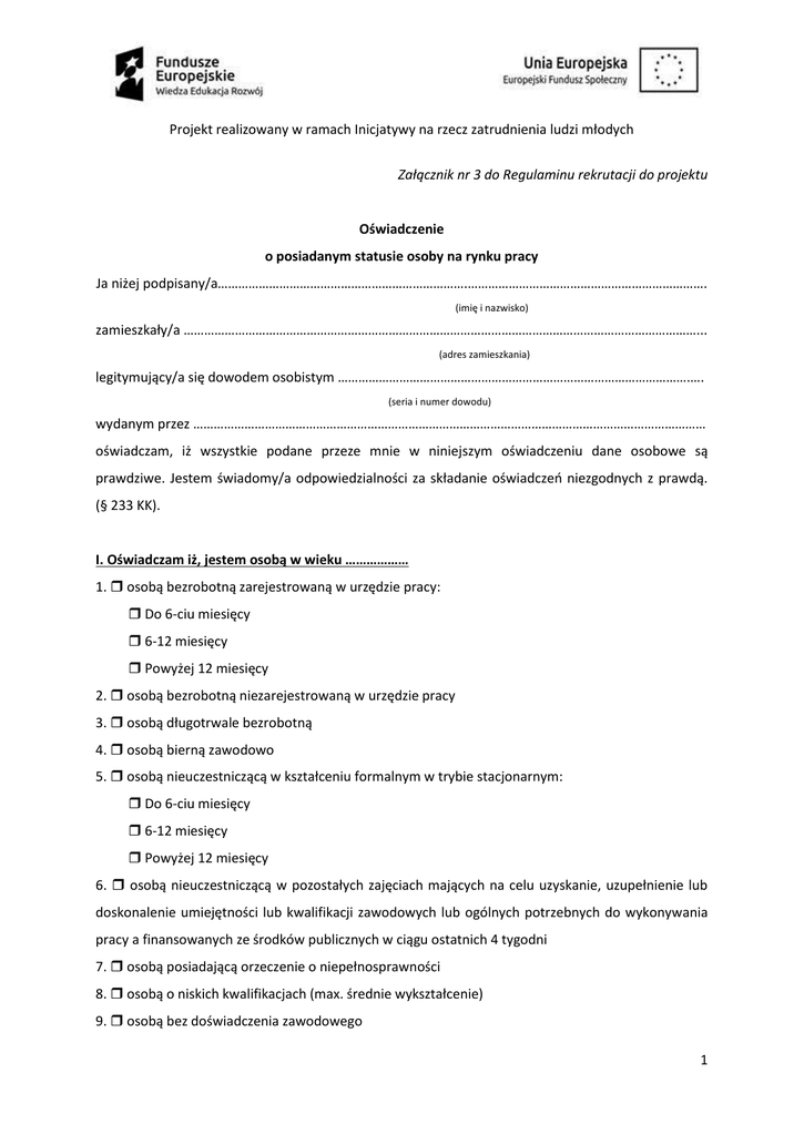 Projekt realizowany w ramach Inicjatywy na rzecz zatrudnienia ludzi młodych Załącznik nr 3 do Regulaminu rekrutacji do projektu Oświadczenie o posiadanym statusie osoby na rynku pracy Ja niżej podpisany/a……………………………………………………………….……………………………………………………………. (imię i nazwisko) zamieszkały/a ……………………………………………………………………………………………………………………………………... (adres zamieszkania) legitymujący/a się dowodem osobistym ………………………………………………………………………………………….…. (seria i numer dowodu) wydanym przez …………………………………………………………………………………………………………………………………… oświadczam, iż wszystkie podane przeze mnie w niniejszym oświadczeniu dane osobowe są prawdziwe. Jestem świadomy/a odpowiedzialności za składanie oświadczeń niezgodnych z prawdą. (§ 233 KK). I. Oświadczam iż, jestem osobą w wieku ……………… 1. osobą bezrobotną zarejestrowaną w urzędzie pracy: Do 6-ciu miesięcy 6-12 miesięcy Powyżej 12 miesięcy 2. osobą bezrobotną niezarejestrowaną w urzędzie pracy 3. osobą długotrwale bezrobotną 4. osobą bierną zawodowo 5. osobą nieuczestniczącą w kształceniu formalnym w trybie stacjonarnym: Do 6-ciu miesięcy 6-12 miesięcy Powyżej 12 miesięcy 6. osobą nieuczestniczącą w pozostałych zajęciach mających na celu uzyskanie, uzupełnienie lub doskonalenie umiejętności lub kwalifikacji zawodowych lub ogólnych potrzebnych do wykonywania pracy a finansowanych ze środków publicznych w ciągu ostatnich 4 tygodni 7. osobą posiadającą orzeczenie o niepełnosprawności 8. osobą o niskich kwalifikacjach (max. średnie wykształcenie) 9. osobą bez doświadczenia zawodowego 1 Projekt realizowany w ramach Inicjatywy na rzecz zatrudnienia ludzi młodych 10. osobą z doświadczeniem zawodowym: Powyżej 2-óch lat 1-2 lata Poniżej roku 11. osobą wychowującą dzieci 12. osobą z terenów wiejskich1 13. osobą bez kwalifikacji zawodowych 14. osobą posiadającą wykształcenie ……………………………………… II.STATUS UCZESTNIKA PROJEKTU W CHWILI PRZYSTĄPIENIA DO PROJEKTU a) Osobą należącą do mniejszości narodowej lub etnicznej, migrant, osoba obcego pochodzenia2: Nie Tak Odmowa podania informacji b) Osobą bezdomną lub dotkniętą wykluczeniem z dostępu do mieszkań Nie Tak c) Osobą z niepełnosprawnościami Nie Tak Odmowa podania informacji d) Osobą przebywającą w gospodarstwie domowym bez osób pracujących Nie Tak w tym: w gospodarstwie domowym z dziećmi pozostającymi na utrzymaniu3 Nie Tak e) Osobą żyjącą w gospodarstwie składającym się z jednej osoby dorosłej i dzieci pozostających na utrzymaniu4 Nie Tak f) Osobą w innej niekorzystnej sytuacji społecznej (innej niż wymienione powyżej)5 Nie 2 Projekt realizowany w ramach Inicjatywy na rzecz zatrudnienia ludzi młodych Tak Odmowa podania informacji ....................................................... (miejscowość, data) ..................................................... Podpis Kandydata do Projektu 1 Obszary wiejskie - 300 osób/km2 na obszarze, którym minimalna liczba ludności wynosi 5 000 mieszkańców. Migrant - cudzoziemcy na stale mieszkający w danym państwie, obywatele obcego pochodzenia lub obywatele należący do mniejszości. Zgodnie z prawem krajowym mniejszości narodowe to mniejszość: białoruska, czeska, litewska, niemiecka, ormiańska, rosyjska, słowacka, ukraińska, żydowska. Mniejszości etniczne: karaimska, łemkowska, romska, tatarska. Osoby obcego pochodzenia to cudzoziemcy - każda osoba, która nie posiada polskiego obywatelstwa, bez względu na fakt posiadania lub nie obywatelstwa (obywatelstw) innych krajów lub osoba, której co najmniej jeden z rodziców urodził się poza terenem Polski. 3 Wskaźnik jest podkategorią wskaźnika dot. osób żyjących w gospodarstwach domowych bez osób pracujących. Oznacza to, że osoba wykazana w kategorii dot. gospodarstw domowych bez osób pracujących, z dziećmi pozostającymi na utrzymaniu powinna być również wykazana we wskaźniku dot. gospodarstw domowych bez osób pracujących. Gospodarstwo domowe bez osób pracujących - gospodarstwo domowe, w którym żaden członek nie pracuje; wszyscy członkowie są albo bezrobotni albo bierni zawodowo. Gospodarstwo domowe to jednostka (ekonomiczna, społeczna): - posiadająca wspólne zobowiązania - dzieląca wydatki domowe lub codzienne potrzeby - wspólnie zamieszkująca. Gospodarstwo domowe to zarówno osoba zamieszkująca samotnie, jak również grupa ludzi (niekoniecznie spokrewniona) mieszkająca pod tym samym adresem wspólnie prowadząca dom np. mająca przynajmniej jeden wspólny posiłek dziennie lub wspólny pokój dzienny. Gospodarstwem domowym nie jest: - gospodarstwo zbiorowe lub gospodarstwo instytucjonalne (jako przeciwieństwo prywatnych); przede wszystkim szpitale, domy opieki dla osób starszych, więzienia, koszary wojskowe, instytucje religijne, szkoły z internatem, pensjonaty, hotele robotnicze itp. Dzieci pozostające na utrzymaniu to osoby w wieku 0-17 lat oraz 18-24 lata, które są bierne zawodowo oraz mieszkają z rodzicem. Wiek dzieci liczony jest od daty urodzenia i ustalany w dniu rozpoczęcia udziału uczestnika w projekcie. Kategoria obejmuje aktualną sytuację uczestnika lub - w przypadku braku informacji - sytuację z roku poprzedzającego moment rozpoczęcia udziału w projekcie. 4 Gospodarstwo domowe to jednostka (ekonomiczna, społeczna): - posiadająca wspólne zobowiązania - dzieląca wydatki domowe lub codzienne potrzeby - wspólnie zamieszkująca. Gospodarstwo domowe to zarówno osoba zamieszkująca samotnie, jak również grupa ludzi (niekoniecznie spokrewniona) mies