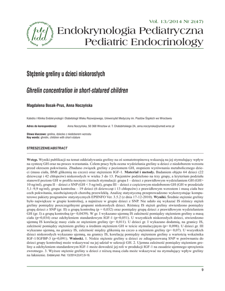 Bosak-Prus M. i inni: Stężenie greliny u dzieci niskorosłych Vol. 13/2014 Nr 2(47) Endokrynologia Pediatryczna Pediatric Endocrinology Stężenie greliny u dzieci niskorosłych Ghrelin concentration in short-statured children Magdalena Bosak-Prus, Anna Noczyńska Katedra i Klinika Endokrynologii i Diabetologii Wieku Rozwojowego, Uniwersytet Medyczny im. Piastów Śląskich we Wrocławiu Adres do korespondencji: Anna Noczyńska, 50 368 Wrocław ul. T. Chałubińskiego 2A, [email protected] Słowa kluczowe: grelina, dziecko z niedoborem wzrostu Key words: ghrelin, children with short-stature STRESZCZENIE/ABSTRACT Wstęp. Wyniki publikacji na temat oddziaływania greliny na oś somatotropinową wskazują na jej stymulujący wpływ na syntezę GH oraz na proces wzrastania. Celem pracy była ocena wydzielania greliny u dzieci z niedoborem wzrostu przed okresem pokwitania. Zbadano związek greliny z poziomem GH, stopniem wyrównania metabolicznego dzieci (masa ciała, BMI glikemią na czczo) oraz stężeniem IGF-1. Materiał i metody. Badaniem objęto 64 dzieci (22 dziewcząt i 42 chłopców) niskorosłych w wieku 3 do 13. Pacjentów podzielono na trzy grupy, a kryterium podziału stanowił poziom GH w profilu nocnym i testach stymulacji: grupa I – dzieci z prawidłowym wydzielaniem GH (GH> 10 ng/ml), grupa II – dzieci z SNP (GH < 5 ng/ml), grupa III – dzieci z częściowym niedoborem GH (GH w przedziale 5,1–9,9 ng/ml), grupa kontrolna – 19 dzieci (6 dziewcząt i 13 chłopców) z prawidłowym wzrostem i masą ciała bez cech pokwitania, nieobciążonych chorobą przewlekłą. Analizę statystyczną przeprowadzono wykorzystując komputerowe pakiety programów statystycznych EPIINFO Ver. 3.5.2 (z dnia 17-12-2010). Wyniki. Średnie stężenie greliny było największe w grupie kontrolnej, a najniższe w grupie dzieci z SNP. Nie udało się wykazać IS różnicy stężeń greliny pomiędzy poszczególnymi grupami niskorosłych dzieci. Różnicę IS stężeń greliny stwierdzono pomiędzy grupą dzieci z SNP (gr. II) a grupą kontrolną (p = 0,032) oraz pomiędzy grupą dzieci z prawidłowym wydzielaniem GH (gr. I) a grupą kontrolną (p= 0,0439). W gr. I wykazano ujemną IS zależność pomiędzy stężeniem greliny a masą ciała (p=0,034) oraz odchyleniem standardowym IGF-1 (p=0,051). U wszystkich niskorosłych dzieci, stwierdzono ujemną IS korelację masy ciała ze stężeniem greliny (p= 0,011). U dzieci gr. I wykazano dodatnią, na granicy IS, zależność pomiędzy stężeniem greliny a średnim stężeniem GH w teście stymulacyjnym (p= 0,098). U dzieci gr. III wykazano ujemną, na granicy IS, zależność między glikemią na czczo a stężeniem greliny (p= 0,07). U wszystkich dzieci niskorosłych wykazano ujemną, na granicy IS, korelację pomiędzy stężeniem greliny a wartością wskaźnika IGF-1/IGFBP-3 (p=0,091). Wnioski. 1. Niskie stężenie greliny u dzieci ze zdiagnozowaną SNP w porównaniu do dzieci grupy kontrolnej może wskazywać na jej udział w sekrecji GH. 2. Ujemna zależność pomiędzy stężeniem greliny a odchyleniem standardowym IGF-1 może dowodzić jej roli w produkcji IGF-1 na zasadzie ujemnego sprzężenia zwrotnego. 3. Wyższe stężenie greliny u dzieci z niższą masą ciała może wskazywać na stymulujący wpływ greliny na łaknienie. Endokrynol. Ped. 13/2014;2(47):9-16. 9 Praca oryginalna Endokrynol. Ped., 13/2014;2(47):9-16 The findings of the papers published on the subject of ghrelin’s influence on somatotropic axis indicate that this hormone stimulates GH synthesis and influences the growth speed. The aim of this paper was to assess the secretion of ghrelin in short-statured pre-pubescent children. I studied the relationship of ghrelin with: the level of GH, metabolic balance (body weight, BMI and AC glucose concentration) and concentration of IGF-1. Participants and methods. The research was conducted on 64 children (22 girls and 42 boys) in the pre-puberty stage, aged 3 to 13. Short stature patients were divided into three groups, the division criterion being GH levels in stimulation tests and nocturnal profiles. Group I (G-I) consisted of patients with normal GH secretion (GH>10ng/ml), Group II of somatotropic pituitary insufficiency (SPI) children (GH<5ng/ml), Group III of children with partial insufficiency of GH (GH between 5.1 - 9.9ng/ml). The control group (CG) consisted of 19 children (6 girls and 13 boys) with no puberty characteristics or chronic diseases, of normal body weight and height. The statistical analysis was conducted with the use of statistical software EPIINFO Ver. 3.5.2 (of 17 December 2010). Results. Mean ghrelin concentration was highest in the control group and lowest in the SPI group. No statistical significance was found with regard to concentration of ghrelin between the groups of short-statured children. A statistically significant difference in ghrelin levels was found between SPI group (G-II) and control group (p = 0.032) and also between the children with normal GH secretion (G-I) and control group (p = 0.0439). In G-I a negative, statistically significant correlation was found between ghrelin concentration and body weight (p=0.034) and between ghrelin concentration and standard deviation of IGF-1 (p=0.051). In all short-statured children a negative, statistically significant correlation was found between their body weight and ghrelin concentration (p=0.011). In G-I a positive, bordering on statistical significance correlation between ghrelin concentration and mean GH concentration in stimulation test (p=0.098) was found. In G-III a negative, bordering on statistical significance correlation was found between AC glucose concentration and ghrelin concentration (p=0.07). In all short-statured children a negative, bordering on statistical significance correlation was found between ghrelin concentration and the values of IGF-1/IGFBP-3 indices (p=0.091). Conclusions. 1. Low concentration of ghrelin in childr