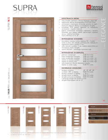 • • • • • • • • • • • • • • • brutto • cena: 540,00 PLN netto / 664,20 PLN • • • • • • KONSTRUKCJA DRZWI: ramy skrzydăa wykonane z drewna klejonego i păyty mdf wykoączenie okleinÇ drewnopodobnÇ INTENSO-Grain zastosowanie innowacyjnej technologii pozwala na wyeliminowanie poăÇczeą okleiny na krawÛdziach skrzydăa* technologia PUR podnosi odpornoěÉ na uszkodzenia mechaniczne i czynniki termiczne poprzez zastosowanie technologii czopowania i ăÇczenia elementów przy pomocy koăków poprzecznych uzyskano mocnÇ i stabilnÇ konstrukcjÛ wiÛcej informacji na str. 26 WYPOSAĹENIE STANDARD: dwuczopowe zawiasy z peănÇ regulacjÇ 3D – 3 sztuki zamek na klucz, OS, wkăadkÛ patentowÇ lub z blokadÇ wc wypeănienie panel o gruboěci 4 mm szkăo mleczne o gruboěci 4 mm, matowa powierzchnia po wewnÛtrznej stronie skrzydăa system SilicSafe – technologia wyciszenia szyb ELEGANCE • Linia SUPRA W-5 SUPRA WYPOSAĹENIE ZA DOPĂATÆ: podciÛcie wentylacyjne 25,00 PLN netto tuleje wentylacyjne tworzywo 25,00 PLN netto tuleje wentylacyjne metalowe 29,00 PLN netto / szt. osăonki na zawiasy standard 21,00 PLN netto / kpl. osăonki na zawiasy retro 48,00 PLN netto / kpl. szkăo bezpieczne mleczne obustronnie găadkie, dopăata za sztukÛ szyby: 45,00 PLN netto INFORMACJE HANDLOWE: dostÛpne szerokoěci „60” „70” „80” „90” szerokoěÉ „100” za dopăatÇ 50,00 PLN netto dowolna szerokoěÉ za dopăatÇ + 50 % ** skrzydăo bierne za dopăatÇ 50,00 PLN netto skrzydăo przesuwne za dopăatÇ 50,00 PLN netto 2 pochwyty okrÇgăe lub owalne w cenie skrzydăo bezprzylgowe info str. 27 DOSTÚPNE KOLORY: SUPRA W-5 SUPRA W-4 SUPRA W-3 SUPRA W-2 SUPRA W-1 19 Orzech DÇb amerykaąski Kasztan Heban Olcha * – w skrajnych przypadkach moĺliwe odstÛpstwo od zaăoĺeą technologicznych bez utraty funkcjonalnoěci i trwaăoěci produktu. ** – w zakresie od 644 do 1044 mm