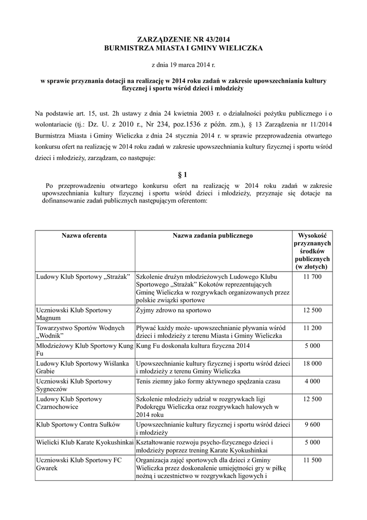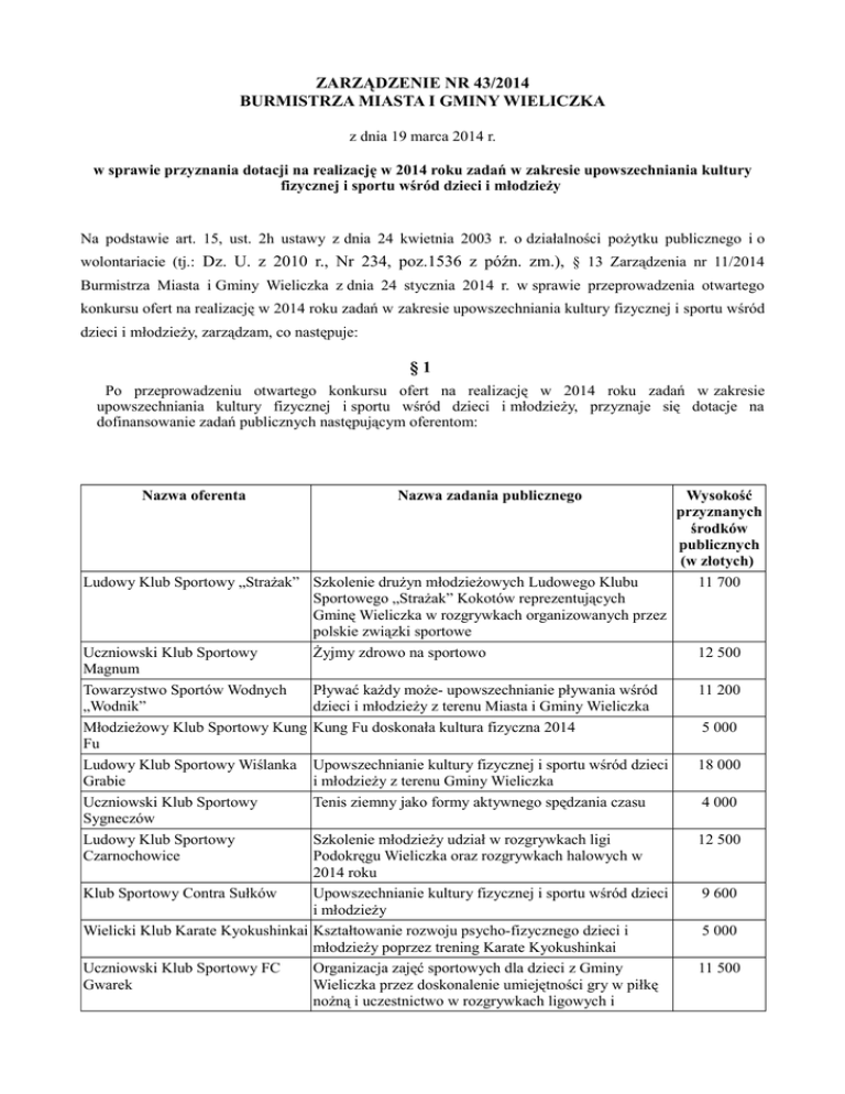 ZARZĄDZENIE NR 43/2014 BURMISTRZA MIASTA I GMINY WIELICZKA z dnia 19 marca 2014 r. w sprawie przyznania dotacji na realizację w 2014 roku zadań w zakresie upowszechniania kultury fizycznej i sportu wśród dzieci i młodzieży Na podstawie art. 15, ust. 2h ustawy z dnia 24 kwietnia 2003 r. o działalności pożytku publicznego i o wolontariacie (tj.: Dz. U. z 2010 r., Nr 234, poz.1536 z późn. zm.), § 13 Zarządzenia nr 11/2014 Burmistrza Miasta i Gminy Wieliczka z dnia 24 stycznia 2014 r. w sprawie przeprowadzenia otwartego konkursu ofert na realizację w 2014 roku zadań w zakresie upowszechniania kultury fizycznej i sportu wśród dzieci i młodzieży, zarządzam, co następuje: §1 Po przeprowadzeniu otwartego konkursu ofert na realizację w 2014 roku zadań w zakresie upowszechniania kultury fizycznej i sportu wśród dzieci i młodzieży, przyznaje się dotacje na dofinansowanie zadań publicznych następującym oferentom: Nazwa oferenta Nazwa zadania publicznego Ludowy Klub Sportowy „Strażak” Szkolenie drużyn młodzieżowych Ludowego Klubu Sportowego „Strażak” Kokotów reprezentujących Gminę Wieliczka w rozgrywkach organizowanych przez polskie związki sportowe Uczniowski Klub Sportowy Żyjmy zdrowo na sportowo Magnum Towarzystwo Sportów Wodnych Pływać każdy może- upowszechnianie pływania wśród „Wodnik” dzieci i młodzieży z terenu Miasta i Gminy Wieliczka Młodzieżowy Klub Sportowy Kung Kung Fu doskonała kultura fizyczna 2014 Fu Ludowy Klub Sportowy Wiślanka Upowszechnianie kultury fizycznej i sportu wśród dzieci Grabie i młodzieży z terenu Gminy Wieliczka Uczniowski Klub Sportowy Tenis ziemny jako formy aktywnego spędzania czasu Sygneczów Ludowy Klub Sportowy Szkolenie młodzieży udział w rozgrywkach ligi Czarnochowice Podokręgu Wieliczka oraz rozgrywkach halowych w 2014 roku Klub Sportowy Contra Sułków Upowszechnianie kultury fizycznej i sportu wśród dzieci i młodzieży Wielicki Klub Karate Kyokushinkai Kształtowanie rozwoju psycho-fizycznego dzieci i młodzieży poprzez trening Karate Kyokushinkai Uczniowski Klub Sportowy FC Organizacja zajęć sportowych dla dzieci z Gminy Gwarek Wieliczka przez doskonalenie umiejętności gry w piłkę nożną i uczestnictwo w rozgrywkach ligowych i Wysokość przyznanych środków publicznych (w złotych) 11 700 12 500 11 200 5 000 18 000 4 000 12 500 9 600 5 000 11 500 Ludowy Klub Sportowy „Węgrzcanka” Towarzystwo Sportowe Wieliczanka Towarzystwo Sportowe Wieliczanka Młodzieżowy Klub Futsalu „99” Grajów turniejach sportowych Szkolenie drużyn młodzieżowych Ludowego Klubu Sportowego „Węgrzcanka” reprezentujących Gminę Wieliczka w rozgrywkach organizowanych przez polskie związki sportowe Propagowanie i organizowanie wychowania fizycznego, rekreacji, sportu dla dzieci i młodzieży zrzeszonej w ramach Towarzystwa Sportowego Wieliczanka Propagowanie Lekkiej Atletyki w Gminie Wieliczka 18 500 20 500 7 943 Szkolenie sekcji futsalowej młodzieżowców, przygotowanie oraz udział w Młodzieżowych Mistrzostwach Polski w Futsalu w kategoriach wiekowych U-14 i U-18 Krakowskie Centrum Taekwon-do Sztuki walki sposobem na zdrowie i sprawność fizyczną Uczniowski Klub Sportowy przy Trening czyni mistrza Samorządowej Szkole Podstawowej im. J.Korczaka i Gimnazjum nr 3 w Węgrzcach Wielkich Uczniowski Klub Sportowy Organizacja pozalekcyjnych zajęć sportowych dla dzieci Gorzków w formach zorganizowanych Małopolski Klub Paralotniowy Dotknąć nieba – organizacja pokazów, turniejów i zajęć sportowych Klub Sportowy „Wilga” Koźmice Szkolenie drużyn młodzieżowych Klubu Sportowego Wielkie „Wilga” Koźmice Wielkie reprezentujących Gminę Wieliczka w rozgrywkach organizowanych przez polskie związki sportowe Uczniowski Klub Sportowy Lider Krok w stronę zdrowia!!! 29 800 Wielicki Klub Sportowy Oyama Uczniowski Klub Sportowy „Gimnazjon” przy SPiOI nr 4 w Wieliczce Międzyszkolny Klub Sportowy przy Międzyszkolnym Ośrodku Sportowym w Wieliczce Oyama karate doskonały sport Gimnastyka – sprawność fizyczna i radość dla wszystkich 5 000 12 000 Szkolenie dzieci i młodzieży w piłce siatkowej dziewcząt, udział w turniejach i ligach 47 500 Międzyszkolny Klub Sportowy przy Międzyszkolnym Ośrodku Sportowym w Wieliczce UKS Regis Szkolenie szachowe dzieci i młodzieży, udział w turniejach i ligach 18 300 Szkolenie w sekcji koszykówki chłopców start w ligach i turniejach ogólnopolskich Doskonalenie umiejętności piłkarskich dzieci i młodzieży i zawodników LKS Gwiazda Brzegi biorących udział w rozgrywkach piłkarskich organizowanych przez Polskie Związki Sportowe Szkolenie i udział w rozgrywkach juniorów 48 500 Piłka nożna naszą pasją 12 200 Ludowy Klub Sportowy Gwiazda Brzegi Ludowy Klub Sportowy Śledziejowice Towarzystwo Sportowe „Wilga” Golkowice 5 000 11 000 3 000 6 000 12 000 5 000 12 600 7 000 Towarzystwo Sportowe „Wilga” Kolarstwo górskie – samo zdrowie 6 000 Golkowice Klub Sportowy „Górnik” Wieliczka Prawidłowy rozwój fizyczny młodych zawodników piłki 122 100 nożnej i boksu zrzeszonych w Klubie Sportowym „Górnik” Wieliczka Razem 510 943,00 zł §2 Nie udziela się wsparcia finansowego następującym oferentom, z powodu błędów formalnych i merytorycznych, jakie wystąpiły w złożonych przez nich ofertach na realizację zadań publicznych: Nazwa oferenta Nazwa zadania publicznego Uczniowski Klub Sportowy Sygneczów Żegluj z nami Uczniowski Klub Sportowy Sygneczów Futbol drogą do sukcesu Ludowy Klub Sportowy XIV Piknik rekreacyjno – sportowy im. Jana Roberta Zaricznego o puchar Czarnochowice Burmistrza Miasta i gminy Wieliczka dla dzieci i młodzieży Związek Harcerstwa Polskiego Chorągiew Krakowska Od malucha do olimpijczyka Związek Harcerstwa Polskiego Chorągiew Krakowska S P O R T = Sprawność, Pot, Odwaga, Ruch, Trening Towarzystwo Sportowe Zawody kolarskie o puchar solnego szlaku „Wilga” Go