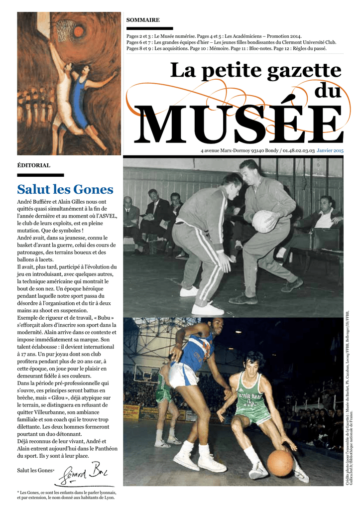 SOMMAIRE Pages 2 et 3 : Le Musée numérise. Pages 4 et 5 : Les Académiciens – Promotion 2014. Pages 6 et 7 : Les grandes équipes d’hier – Les jeunes filles bondissantes du Clermont Université Club. Pages 8 et 9 : Les acquisitions. Page 10 : Mémoire. Page 11 : Bloc-notes. Page 12 : Règles du passé. 4 avenue Marx-Dormoy 93140 Bondy / 01.48.02.03.03 Janvier 2015 Éditorial André Buffière et Alain Gilles nous ont quittés quasi simultanément à la fin de l’année dernière et au moment où l’ASVEL, le club de leurs exploits, est en pleine mutation. Que de symboles ! André avait, dans sa jeunesse, connu le basket d’avant la guerre, celui des cours de patronages, des terrains boueux et des ballons à lacets. Il avait, plus tard, participé à l’évolution du jeu en introduisant, avec quelques autres, la technique américaine qui montrait le bout de son nez. Un époque héroïque pendant laquelle notre sport passa du désordre à l’organisation et du tir à deux mains au shoot en suspension. Exemple de rigueur et de travail, « Bubu » s’efforçait alors d’inscrire son sport dans la modernité. Alain arrive dans ce contexte et impose immédiatement sa marque. Son talent éclabousse : il devient international à 17 ans. Un pur joyau dont son club profitera pendant plus de 20 ans car, à cette époque, on joue pour le plaisir en demeurant fidèle à ses couleurs. Dans la période pré-professionnelle qui s’ouvre, ces principes seront battus en brèche, mais « Gilou », déjà atypique sur le terrain, se distinguera en refusant de quitter Villeurbanne, son ambiance familiale et son coach qui le trouve trop dilettante. Les deux hommes formeront pourtant un duo détonnant. Déjà reconnus de leur vivant, André et Alain entrent aujourd’hui dans le Panthéon du sport. Ils y sont à leur place. Salut les Gones* * Les Gones, ce sont les enfants dans le parler lyonnais, et par extension, le nom donné aux habitants de Lyon. Crédits photo (pour l’ensemble de la Gazette) : Musée du Basket, Ph. Cazaban, Lecoq/FFBB, Bellenger/IS/FFBB, Gallica.bnf.fr/Bibliothèque nationale de France. Salut les Gones LE MUSéE NUMéRISE Le Musée numérise Le Musée du Basket et la FFBB ont mis en place un partenariat original et novateur avec la Bibliothèque nationale de France (BnF). Grâce à cette collaboration, plusieurs parutions, au premier rang desquelles la revue de la FFBB, qui paraît depuis 1933, ont pu être numérisées et mises en ligne. 2 Il existe, au Musée du Basket et à la Fédération Française de BasketBall, deux collections complètes de la revue Basket-Ball (actuel BasketBall Magazine), depuis le premier numéro paru en octobre 1933. Ces pages constituent, sur plus de 80 ans, la mémoire de la Fédération, à travers les voix de ceux qui l’ont composée et la composent encore. Ces collections sont fragiles et quasiment inaccessibles aux chercheurs et aux passionnés. Tout est parti de là… Comment préserver au mieux ces collections tout en les rendant accessibles aux chercheurs, aux étudiants, aux journalistes, aux passionnés ? La solution évidente à ce problème : la numérisation. Idée simple, mais mise en œuvre complexe : la numérisation de plusieurs dizaines de milliers de pages, sur des supports originaux fragiles, nécessite des moyens techniques adaptés et onéreux et un savoir-faire précis. C’est à ce moment que les contacts se sont noués avec la Bibliothèque nationale de France. Devant l’intérêt scientifique du projet, la BnF a accepté de prendre en charge la numérisation et la mise en ligne de nos collections. 3 Le basket en pionnier Il s’agit d’un partenariat tout à fait novateur entre une fédération sportive et une institution culturelle comme la BnF. Une nouvelle voie est ouverte, puisque la fédération d’athlétisme a suivi notre chemin, et que d’autres fédérations sont actuellement en discussion avec la Bibliothèque nationale. Où retrouver nos collections en ligne ? Dans l’onglet Patrimoine du site FFBB, dans la partie « Centre de recherche », onglet « Collections numérisées – BnF »…Ou directement sur le catalogue numérique en ligne de la BnF : Gallica (http://gallica.bnf.fr/ ) : recherche : FFBB ou basket…. Outre la revue fédérale, vous trouverez également plusieurs titres spécialisés basket parus entre la fin des années 1940 et les années 1970. Vous trouverez aussi en ligne la revue L’Athlétisme, entre 1921 et 1932, période où le basket-ball dépendait de la FFA. Un véritable ensemble se dessine autour de notre sport. N’hésitez pas à nous contacter pour en savoir plus sur ce programme et sur l’ensemble des ressources disponibles au Musée et à la FFBB. Centre de recherche et de documentation FFBB – Contact : patrimoine@ffbb. com > Basketball, Basketball Magazine, Servir le Basket,L’équipe Basket Magazine : les collections complètes de ces titres sont maintenant accessibles en ligne (http://www.ffbb.com/ffbb/ patrimoine/centre-de-recherche/les-collections-numerisees-bnf) Les académiciens promotion 2014 Les promotions précédentes Cathy Melain Martine Campi > 241 sélections en équipe de France entre 1993 et 2009 > Une participation aux Jeux Olympiques (2000) > Deux participations au Championnat du Monde (1994, 2002) > Médaille d’or au Championnat d’Europe (2001 ; 2009) ; Médaille d’argent au Championnat d’Europe (1999) ; 6 participations au Championnat d’Europe (1995, 1999, 2001, 2003, 2005, 2009) > 8 titres de Championne de France avec le CJM Bourges (1996-2000, 2006, 2008, 2009) > Meilleure joueuse LFB (1999, 2000, 2001) > 3 Coupes de France avec le CJM Bourges (2006, 2008, 2009) > 3 Euroligues avec le CJM Bourges (1997, 1998, 2001) > Meilleure joueuse Final four Euroligue 2000 > All Star Game Euroligue 2009 > 193 sélections en équipe de France entre 1981 et 1993, capitaine de l’équipe de France 1990-1993 > Médaille d’argent au Championn