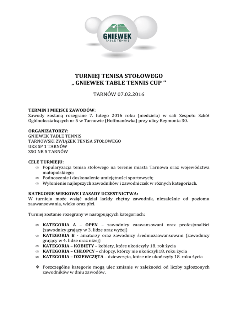 TURNIEJ TENISA STOŁOWEGO „ GNIEWEK TABLE TENNIS CUP ’’ TARNÓW 07.02.2016 TERMIN I MIEJSCE ZAWODÓW: ZAWODÓW Zawody zostaną rozegrane 7. 7 lutego 2016 roku (niedziela) w sali ali Zespołu Szkół Ogólnokształcących nr 5 w Tarnowie (Hoffmanówka) przy ulicy Reymonta 30. ORGANIZATORZY: GNIEWEK TABLE TENNIS ZEK TENISA STOŁOWEGO TARNOWSKI ZWIĄZEK UKS SP 1 TARNÓW ZSO NR 5 TARNÓW CELE TURNIEJU: • Popularyzacja tenisa stołowego na terenie miasta Tarnowa oraz województwa małopolskiego; • Podnoszenie oszenie i doskonalenie umiejętności sportowych; • Wyłonienie najlepszych zawodników zawodnikó i zawodniczek w różnych kategoriach. kategoriach KATEGORIE WIEKOWE I ZASADY UCZESTNICTWA: W turnieju może wziąćć udział każdy chętny zawodnik, niezależnie od poziomu zaawansowania, wieku u oraz płci. płci Turniej zostanie rozegrany any w następujących kategoriach: kategoriach • • • • • KATEGORIA A – OPEN – zawodnicy zaawansowani oraz profesjonaliści (zawodnicy nicy grający w 3. 3 lidze oraz wyżej) KATEGORIA B - amatorzy oraz zawodnicy średniozaawansowani zaawansowani (zawodnicy grający w 4.. lidze oraz niżej) niżej KATEGORIA – KOBIETY – kobiety, które ukończyły 18. rok życia KATEGORIA – CHŁOPCY – chłopcy, którzy nie ukończyli18. roku życia KATEGORIA – DZIEWCZĘTA – dziewczęta, które nie ukończyły 18. 18 roku życia Poszczególne kategorie mogą ulec zmianie w zależności żności od liczby zgłoszonych zawodników w dniu zawodów. zawodów SYSTEM ROZGRYWEK: I etap – turniej w grupach 5-osobowych (do kolejnego etapu przechodzi 2 najlepszych zawodników) II etap – turniej pucharowy Wszystkie mecze rozgrywane będą do 3 setów wygranych (3:0, 3:1, 3:2; do 11 punktów) PROGRAM ZAWODÓW: godz. 9.00-9.30 – zapisy do poszczególnych kategorii godz. 9.30 – losowanie godz. 10.00 – otwarcie zawodów i rozpoczęcie eliminacji grupowych godz. 13.00-14.00 - przerwa obiadowa godz. 14 .00 – rozpoczęcie turnieju pucharowego godz. 18.00 planowane zakończenie zawodów oraz dekoracja najlepszych zawodników WPISOWE: WSZYSTKIE KATEGORIE 10 ZŁ NAGRODY: Dla trzech najlepszych zawodników poszczególnych kategorii ufundowano: nagrody rzeczowe, puchary, medale oraz dyplomy. Ponadto, każdy uczestnik otrzyma nieodpłatnie pamiątkową koszulkę. DODATKOWE INFORMACJE: • • • • • • Podczas zawodów obowiązuje obuwie i strój sportowy; Organizator nie ponosi odpowiedzialności za rzeczy pozostawione w szatni; Turniej zostanie rozegrany na 6 stołach firmy Buttefly oraz 2 stołach firmy Donic; KATEGORIA A zostanie rozegrana piłeczkami plastikowymi; Organizator nie ponosi odpowiedzialności za stan zdrowia zawodników oraz ich ubezpieczenie; Sprawy sporne oraz nieujęte w regulaminie rozstrzyga Sędzia Główny zawodów wraz z organizatorem KONTAKT Z ORGANIZATORAMI: ADAM KIEROŃSKI tel. kom. – 602 396 606 ANDRZEJ GNIEWEK tel. kom. – 603 953 251 Zgłoszenia prosimy kierować drogą mailową na adres [email protected] lub w dniu zawodów między godziną 9.00 - 9.30 . SERDECZNIE ZPARASZAMY WSZYSTKICH SYMPATYKÓW TENISA STOŁOWEGO!