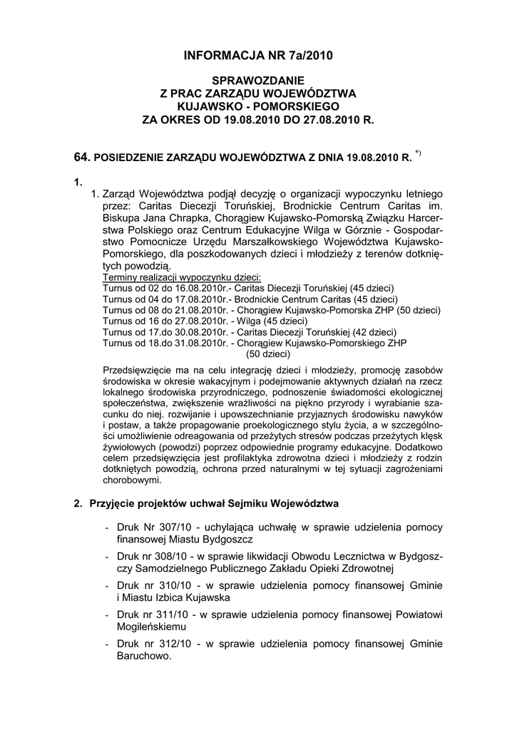 INFORMACJA NR 7a/2010 SPRAWOZDANIE Z PRAC ZARZĄDU WOJEWÓDZTWA KUJAWSKO - POMORSKIEGO ZA OKRES OD 19.08.2010 DO 27.08.2010 R. 64. POSIEDZENIE ZARZĄDU WOJEWÓDZTWA Z DNIA 19.08.2010 R. *) 1. 1. Zarząd Województwa podjął decyzję o organizacji wypoczynku letniego przez: Caritas Diecezji Toruńskiej, Brodnickie Centrum Caritas im. Biskupa Jana Chrapka, Chorągiew Kujawsko-Pomorską Związku Harcerstwa Polskiego oraz Centrum Edukacyjne Wilga w Górznie - Gospodarstwo Pomocnicze Urzędu Marszałkowskiego Województwa KujawskoPomorskiego, dla poszkodowanych dzieci i młodzieży z terenów dotkniętych powodzią. Terminy realizacji wypoczynku dzieci: Turnus od 02 do 16.08.2010r.- Caritas Diecezji Toruńskiej (45 dzieci) Turnus od 04 do 17.08.2010r.- Brodnickie Centrum Caritas (45 dzieci) Turnus od 08 do 21.08.2010r. - Chorągiew Kujawsko-Pomorska ZHP (50 dzieci) Turnus od 16 do 27.08.2010r. - Wilga (45 dzieci) Turnus od 17.do 30.08.2010r. - Caritas Diecezji Toruńskiej (42 dzieci) Turnus od 18.do 31.08.2010r. - Chorągiew Kujawsko-Pomorskiego ZHP (50 dzieci) Przedsięwzięcie ma na celu integrację dzieci i młodzieży, promocję zasobów środowiska w okresie wakacyjnym i podejmowanie aktywnych działań na rzecz lokalnego środowiska przyrodniczego, podnoszenie świadomości ekologicznej społeczeństwa, zwiększenie wrażliwości na piękno przyrody i wyrabianie szacunku do niej. rozwijanie i upowszechnianie przyjaznych środowisku nawyków i postaw, a także propagowanie proekologicznego stylu życia, a w szczególności umożliwienie odreagowania od przeżytych stresów podczas przeżytych klęsk żywiołowych (powodzi) poprzez odpowiednie programy edukacyjne. Dodatkowo celem przedsięwzięcia jest profilaktyka zdrowotna dzieci i młodzieży z rodzin dotkniętych powodzią, ochrona przed naturalnymi w tej sytuacji zagrożeniami chorobowymi. 2. Przyjęcie projektów uchwał Sejmiku Województwa - Druk Nr 307/10 - uchylająca uchwałę w sprawie udzielenia pomocy finansowej Miastu Bydgoszcz - Druk nr 308/10 - w sprawie likwidacji Obwodu Lecznictwa w Bydgoszczy Samodzielnego Publicznego Zakładu Opieki Zdrowotnej - Druk nr 310/10 - w sprawie udzielenia pomocy finansowej Gminie i Miastu Izbica Kujawska - Druk nr 311/10 - w sprawie udzielenia pomocy finansowej Powiatowi Mogileńskiemu - Druk nr 312/10 - w sprawie udzielenia pomocy finansowej Gminie Baruchowo. 2 3. Uchwały Zarządu Województwa 1. Nr 64/1063/10 - postanowiono utworzyć partnerstwo z jednostkami samorządu terytorialnego w celu realizacji projektu „Program Indywidualizacji Nauczania i Wychowania uczniów klas I-III szkół podstawowych Województwa Kujawsko-Pomorskiego” realizowanego w ramach Poddziałania 9.1.2 Wyrównywanie szans edukacyjnych uczniów z grup o utrudnionym dostępie do edukacji oraz zmniejszanie różnic w jakości usług edukacyjnych, Działania 9.1 Wyrównywanie szans edukacyjnych i zapewnienie wysokiej jakości usług edukacyjnych świadczonych w systemie oświaty, Priorytetu IX Rozwój wykształcenia i kompetencji w regionach Programu Operacyjnego Kapitał Ludzki, finansowanego ze środków Europejskiego Funduszu Społecznego oraz budżetu państwa. 2. Nr 64/1064/10 - zmieniono załącznik do uchwały Nr 17/223/10 Zarządu Województwa Kujawsko-Pomorskiego z dnia 2 marca 2010 r. w sprawie wysokości kwot dodatku motywacyjnego przyznawanego dyrektorom szkół i placówek oświatowych prowadzonych przez Samorząd Województwa Kujawsko-Pomorskiego. 3. Nr 64/1065/10 - zatwierdzono projekt, wybrany do dofinansowania w ramach konkursu nr 1/POKL/9/D.1.1/2009 na projekty innowacyjne testujące PO KL „ Szkoła innowacyjna i konkurencyjna - dostosowanie oferty szkolnictwa zawodowego do wymagań lokalnego rynku pracy” – Wnioskodawca: Powiat Toruński 4. Nr 64/1066/10 - zmieniono uchwałę nr 66/1121/09 Zarządu Województwa Kujawsko-Pomorskiego z dnia 3 września 2009 r. w sprawie dofinansowania projektu systemowego pn.: „Zdolni na start – II edycja” w ramach Poddziałania 9.1.3 Pomoc stypendialna dla uczniów szczególnie uzdolnionych, Działania 9.1 Wyrównywanie szans edukacyjnych i zapewnienie wysokiej jakości usług edukacyjnych świadczonych w systemie oświaty, Priorytetu IX Rozwój wykształcenia i kompetencji w regionach Programu Operacyjnego Kapitał Ludzki i powierzenia jego realizacji. 5. Nr 64/1067/10 - zmieniono uchwałę nr 37/554/10 Zarządu Województwa Kujawsko-Pomorskiego z dnia 11 maja 2010 r., w sprawie dofinansowania projektu systemowego pn.: „Klucz do uczenia program wsparcia kujawsko-pomorskich nauczycieli” w ramach Działania 9.4 Wysoko wykwalifikowane kadry systemu oświaty, Priorytetu IX Rozwój wykształcenia i kompetencji w regionach, Programu Operacyjnego Kapitał Ludzki i powierzenia jego realizacji 6. Nr 64/1068/10 - zmieniono uchwałę nr 45/723/10 Zarządu Województwa Kujawsko-Pomorskiego z dnia 8 czerwca 2010 r. w sprawie dofinansowania projektu systemowego pn.: „Centrum Zarządzania Regionalnym Systemem Innowacyjnym” w ramach Poddziałania 8.2.2 Regionalne Strategie Innowacji, Priorytetu VIII Regionalne kadry gospodarki, Programu Operacyjnego Kapitał Ludzki i powierzenia jego realizacji 7. Nr 64/1069/10 - zmieniono uchwałę nr 65/1106/09 Zarządu Województwa Kujawsko-Pomorskiego z dnia 27 sierpnia 2009 r. w sprawie dofinansowania projektu systemowego pn.: „Monitoring regionalnego rynku pracy II” w ramach Poddziałania 6.1.2 Wsparcie powiatowych i wojewódzkich urzędów pracy w realizacji zadań na rzecz aktywizacji zawo- 3 dowej osób bezrobotnych w regionie, Działania 6.1 Poprawa dostępu do zatrudnienia oraz wspieranie aktywności zawodowej w regionie, Priorytetu VI Rynek pracy otwarty dla wszystkich, Programu Operacyjnego Kapitał Ludzki i powierzenia jego realizacji 8. Nr 64/1070/10 - zmieniono uchwałę nr 45/724/10 Zarządu Województwa Kujawsko-Pomorskiego z dnia 8 czerwca 2010 r. w sprawie dofinansowania projektu systemowego pn.: „P