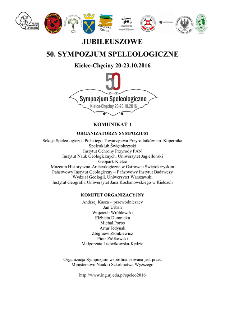 JUBILEUSZOWE 50. SYMPOZJUM SPELEOLOGICZNE Kielce-Chęciny 20-23.10.2016 KOMUNIKAT 1 ORGANIZATORZY SYMPOZJUM Sekcja Speleologiczna Polskiego Towarzystwa Przyrodników im. Kopernika Speleoklub Świętokrzyski Instytut Ochrony Przyrody PAN Instytut Nauk Geologicznych, Uniwersytet Jagielloński Geopark Kielce Muzeum Historyczno-Archeologiczne w Ostrowcu Świętokrzyskim Państwowy Instytut Geologiczny – Państwowy Instytut Badawczy Wydział Geologii, Uniwersytet Warszawski Instytut Geografii, Uniwersytet Jana Kochanowskiego w Kielcach KOMITET ORGANIZACYJNY Andrzej Kasza – przewodniczący Jan Urban Wojciech Wróblewski Elżbieta Dumnicka Michał Poros Artur Jedynak Zbigniew Złonkiewicz Piotr Ziółkowski Małgorzata Ludwikowska-Kędzia Organizacja Sympozjum współfinansowana jest przez Ministerstwo Nauki i Szkolnictwa Wyższego http://www.ing.uj.edu.pl/speleo2016 Jubileuszowe, 50. Sympozjum Speleologiczne zostanie zorganizowane w Górach Świętokrzyskich, zgodnie z tradycją, iż co dziesiąte sympozjum odbywa się w tym regionie. Wybór regionu świętokrzyskiego uzasadniony jest jednak również względami naukowymi, edukacyjnymi oraz popularyzatorskimi, bowiem w okresie ostatnich lat nastąpił postęp w badaniach zjawisk krasowych, jaskiń oraz innych obiektów podziemnych na jego obszarze a ponadto zakończono kilka spektakularnych zamierzeń w zakresie edukacji oraz popularyzacji wiedzy o jaskiniach. Jednym z nich jest udostępnienie Podziemnej Trasy Turystycznej na Kadzielni w Kielcach, innym – otwarcie Centrum Geoedukacji na Wietrzni, w ramach którego istnieje ekspozycja poświęcona różnym aspektom badań krasowych i jaskiniowych. Pierwsza, uroczysta Sesja Jubileuszowa Sympozjum odbędzie się w Centrum Geoedukacji na Wietrzni w Kielcach (Kielce, ul. Daleszycka 21). Natomiast pozostała część obrad i zakwaterowanie uczestników przewidziane są w Europejskim Centrum Edukacji Geologicznej w Chęcinach (Korzecko 1c). Otwór Groty Skrzatów w piaskowcowych skałkach w Krynkach w dolinie rzeki Kamiennej PROGRAM SYMPOZJUM 20.10.2016 (czwartek) 9.00–14.00 Przedsympozjalna sesja terenowa – system jaskiniowy Chelosiowa JamaJaskinia Jaworznicka lub Jaskinia Pajęcza w Jaworzni 13.00–14.30 Rejestracja uczestników w Centrum Geoedukacji na Wietrzni (Kielce, ul. Daleszycka 21) 13.00–14.20 Zwiedzanie Centrum Geoedukacji na Wietrzni (Kielce, ul. Daleszycka 21) 14.30–14.45 Otwarcie 50 Sympozjum Speleologicznego (Sala Konferencyjna Centrum Geoedukacji) 14.45–15.45 Sesja referatowa I: Jubileuszowe, Pięćdziesiąte Sympozjum Speleologiczne (Sala Konferencyjna Centrum Geoedukacji) 15.45–16.00 Sesja posterowa: Pięćdziesiąt Sympozjów Speleologicznych (Hol Główny Centrum Geoedukacji) 16.00–16.15 Przerwa 16.15–17.30 Sesja referatowa II: Kras i jaskinie permsko-mezozoicznego obrzeżenia Gór Świętokrzyskich (Sala Konferencyjna Centrum Geoedukacji) 17.30–18.00 przejazd na Kadzielnię 18.00–19.30 Sesja terenowa A – Podziemna Trasa Turystyczna na Kadzielni 19.30–20.00 Przejazd do Europejskiego Centrum Edukacji Geologicznej w Chęcinach (Korzecko 1c) 20.00–21.00 Kolacja 21.10.2016 (piątek) 7.30–9.00 Rejestracja uczestników w Europejskim Centrum Edukacji Geologicznej w Chęcinach 8.00–9.00 Śniadanie 9.00–11.15 Sesja referatowa 11.15–11.30 Przerwa 11.30–14.00 Sesja referatowa 14.00–15.00 Obiad 15.00–17.45 Sesja referatowa 17.45–18.00 Przerwa 18.00–19.00 Sesja posterowa 19.00–19.30 Zebranie Sekcji Speleologicznej PTP im. Kopernika 20.00–23.00 Kolacja grillowa 22.10.2016 (sobota) 7.00–8.00 Śniadanie 8.00–19.30 Sesja terenowa B: Kras, jaskinie i podziemne pustki antropogeniczne północnej części permsko-mezozoicznego obrzeżenia Gór Świętokrzyskich (obiad w ramach sesji terenowej) 20.00–23.00 Uroczysta kolacja 23.10.2016 (niedziela) 7.30–8.30 Śniadanie 8.30–13.30 Sesja terenowa C: Kras i jaskinie zachodniej części permskomezozoicznego obrzeżenia Gór Świętokrzyskich 13.30 Zakończenie Sympozjum Sesje referatowe i sesje posterowe Tematyka prezentacji powinna obejmować wyniki wielokierunkowych badań jaskiń oraz szeroko pojętych zjawisk krasowych (geologicznych, hydrologicznych, biologicznych, paleontologicznych, archeologicznych itp.), a także zagadnienia eksploracji jaskiń. Szczegóły zostaną podane w drugim komunikacie po otrzymaniu zgłoszeń. W przypadku dużej liczby zgłoszonych referatów organizatorzy zastrzegają sobie prawo do modyfikacji programu sympozjum lub decyzji o przedstawieniu części referatów w formie posterów. Wszelkie zmiany będą niezwłocznie anonsowane na stronie internetowej i uwzględnione w drugim komunikacie. Sesje terenowe Przedsympozjalna sesja terenowa (czwartek 20.10.2016 w godzinach 9.00-14.00) – System jaskiniowy Chelosiowa Jama-Jaskinia Jaworznicka lub Jaskinia Pajęcza w Jaworzni Zwiedzanie odbywa się z przewodnikiem, do zwiedzania konieczne jest posiadanie oświetlenia (czołówka), hełmu i kombinezonu. Dojazd uczestników do Jaworzni oraz przejazd z Jaworzni do Kielc własnymi środkami transportu. Sesja terenowa A (czwartek, 20.10.2016 w godzinach 18.00-19.30) – Podziemna Trasa Turystyczna na Kadzielni Zwiedzanie odbywa się z przewodnikiem i nie wymaga posiadania własnego oświetlenia, hełmu i kombinezonu jaskiniowego. Przejazd z Centrum Geoedukacji w Kielcach na Kadzielnię a potem z Kadzielni do Europejskiego Centrum Edukacji Geologicznej w Chęcinach własnymi środkami transportu (osoby pozbawione takiej możliwości proszone są o zaznaczenie tego faktu w formularzu zgłoszeniowym). Sesja terenowa B (sobota 22.10.2016 w godzinach 8.00-18.30) – Kras, jaskinie i i podziemne pustki antropogeniczne północnej części permsko-mezozoicznego obrzeżenia Gór Świętokrzyskich Stanowisko B 0 – Św. Katarzyna, Ośrodek Wypoczynkowy „Jodełka” – pamiątkowe zdjęcie grupowe w miejscu organizacji I Ogólnopolskiego Zjazdu Badaczy Krasu w 1963 r. Stanowi