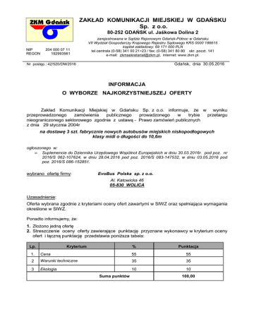 ZAKŁAD KOMUNIKACJI MIEJSKIEJ W GDAŃSKU Sp. z o.o. 80-252 GDAŃSK ul. Jaśkowa Dolina 2 NIP REGON 204 000 07 11 192993561 zarejestrowana w Sądzie Rejonowym Gdańsk-Północ w Gdańsku VII Wydział Gospodarczy Krajowego Rejestru Sądowego KRS 0000 186615 kapitał zakładowy: 69 171 000 PLN tel.centrala (0-58) 341 00 21÷23 / fax: (0-58) 341 80 80 skr. poczt. 141 e-mail: [email protected], internet: www.zkm.pl. Gdańsk, dnia 30.05.2016 Nr postęp.: 42/520/DM/2016 INFORMACJA O WYBORZE NAJKORZYSTNIEJSZEJ OFERTY Zakład Komunikacji Miejskiej w Gdańsku Sp. z o.o. informuje, że w wyniku przeprowadzonego zamówienia publicznego prowadzonego w trybie przetargu nieograniczonego sektorowego zgodnie z ustawą - Prawo zamówień publicznych z dnia 29 stycznia 2004r na dostawę 3 szt. fabrycznie nowych autobusów miejskich niskopodłogowych klasy midi o długości do 10,6m ogłoszonego w: • Suplemencie do Dziennika Urzędowego Wspólnot Europejskich w dniu 30.03.2016r. pod poz. nr 2016/S 062-107624, w dniu 28.04.2016 pod poz. 2016/S 083-147532, w dniu 03.05.2016 pod poz. 2016/S 086-152851. wybrano ofertę firmy: EvoBus Polska sp. z o.o. Al. Katowicka 46 05-830 WOLICA Uzasadnienie: Oferta wybrana zgodnie z kryteriami oceny ofert zawartymi w SIWZ oraz spełniająca wymagania określone w SIWZ. Ponadto informujemy, że: 1. Złożono jedną ofertę 2. Streszczenie oceny oferty zawierające punktację przyznane wykonawcy w kryterium oceny ofert i łączną punktację przedstawia poniższa tabela: Lp. Kryterium % Punktacja 1. Cena 55 55 2 Warunki techniczne 35 35 3 Ekologia 10 10 Suma punktów 100,00