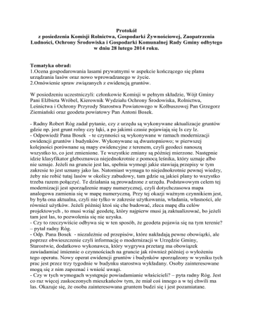 Protokół z posiedzenia Komisji Rolnictwa, Gospodarki Żywnościowej, Zaopatrzenia Ludności, Ochrony Środowiska i Gospodarki Komunalnej Rady Gminy odbytego w dniu 28 lutego 2014 roku. Tematyka obrad: 1.Ocena gospodarowania lasami prywatnymi w aspekcie kończącego się planu urządzania lasów oraz nowo wprowadzanego w życie. 2.Omówienie spraw związanych z ewidencją gruntów. W posiedzeniu uczestniczyli: członkowie Komisji w pełnym składzie, Wójt Gminy Pani Elżbieta Wróbel, Kierownik Wydziału Ochrony Środowiska, Rolnictwa, Leśnictwa i Ochrony Przyrody Starostwa Powiatowego w Kolbuszowej Pan Grzegorz Ziemiański oraz geodeta powiatowy Pan Antoni Bosek. - Radny Robert Róg zadał pytanie, czy z urzędu są wykonywane aktualizacje gruntów gdzie np. jest grunt rolny czy łąki, a po jakimś czasie pojawiają się ls czy lz. - Odpowiedź Pana Bosek - te czynności są wykonywane w ramach modernizacji ewidencji gruntów i budynków. Wykonywane są dwustopniowo; w pierwszej kolejności porównane są mapy ewidencyjne z terenem, czyli geodeci nanoszą wszystko to, co jest zmienione. Te wszystkie zmiany są później mierzone. Następnie idzie klasyfikator gleboznawca niejednokrotnie z pomocą leśnika, który uznaje albo nie uznaje. Jeżeli na gruncie jest las, spełnia wymogi jakie stawiają przepisy w tym zakresie to jest uznany jako las. Natomiast wymaga to niejednokrotnie pewnej wiedzy, żeby nie robić tutaj lasów w okolicy zabudowy, tam gdzie są jakieś plany to wszystko trzeba razem połączyć. Te działania są prowadzone z urzędu. Podstawowym celem tej modernizacji jest sporządzenie mapy numerycznej, czyli dotychczasowa mapa analogowa zamienia się w mapę numeryczną. Przy tej okazji ważnym czynnikiem jest, by była ona aktualna, czyli nie tylko w zakresie użytkowania, władania, własności, ale również użytków. Jeżeli później ktoś się che budować, zleca mapę dla celów projektowych , to musi wziąć geodetę, który najpierw musi ją zaktualizować, bo jeżeli tam jest las, to pozwolenia się nie uzyska. - Czy to rzeczywiście odbywa się w ten sposób, że geodeta pojawia się na tym terenie? – pytał radny Róg. - Odp. Pana Bosek - niezależnie od przepisów, które nakładają pewne obowiązki, ale poprzez obwieszczenie czyli informację o modernizacji w Urzędzie Gminy, Starostwie, dodatkowo wykonawca, który wygrywa przetarg ma obowiązek zawiadamiać imiennie o czynnościach na gruncie jak również później o wyłożeniu tego operatu. Nowy operat ewidencji gruntów i budynków sporządzony w wyniku tych prac jest przez trzy tygodnie w budynku starostwa wykładany. Osoby zainteresowane mogą się z nim zapoznać i wnieść uwagi. - Czy w tych wymogach występuje powiadamianie właścicieli? – pyta radny Róg. Jest co raz więcej zaskoczonych mieszkańców tym, że miał coś innego a w tej chwili ma las. Okazuje się, że osoba zainteresowana gruntem budzi się i jest pozamiatane. - Pan Bosek - ustawodawca określił taką formę, żeby ogłaszać poprzez obwieszczenia o wykonaniu modernizacji. Niezależnie od tego geodezja zawiadamia właścicieli gruntów za zwrotnym poświadczeniem odbioru. Niestety – jedynie 30% - 35% tym się interesuje. Dotyczy to modernizacji kompleksowych, inne zmiany są na wniosek właściciela. - Zdaniem radnego Bryka trzeba na ąa sprawę popatrzeć z innej strony. Był grunt rolny, nagle się okazuje, że jest zakrzaczony czy rośnie tam już las. Jak z punktu widzenia przepisów na to patrzeć? W myśl ustawy o ochronie gruntów – grunt rolny ma myć gruntem rolnym. Ustawa określa, jakie metody, jakie konsekwencje się powinno wyciągać, co powinien zrobić właściciel i co powinna zrobić władza. Jak starostwo patrzy na te sprawy. W myśl ustawy o ochronie gruntów starostwo ma określone zadania oraz Wójt Gminy. Co robi odpowiedzialny pracownik starostwa, jeśli zgłosi się osobnik który mówi, że na działce sąsiada jest zakrzaczenie, które przeszkadza, zagraża sąsiednim gruntom, w krzakach siedzi zwierzyna leśna która niszczy uprawy. - Jest to pewien problem, ponieważ jeżeli ktoś zalesił, stworzył sobie taką enklawę śródpolna, przeszkadza na pewno otoczeniu, bo jeżeli pozostałe grunty otaczające tą enklawę są gruntami uprawianymi, to na pewno jest zacienienie, przeszkadza zwierzyna itp. Ale przepis nie daje możliwości zmuszenia go do wylesienia poinformował Pan geodeta. - Radny Bryk - temat corocznie się powtarza, będzie sesja na której dyskutować się będzie nad kwestią dzików, zdenerwowanie rolników jest olbrzymie a my stoimy w miejscu. Są grunty odłogowane i rosną olbrzymie trawy na dobrych kompleksach gruntów, albo rosną samosiejki. Radnemu wiadomym jest, że do lat 10 można takie zalesienie zlikwidować. - Pan Ziemiański - Dziwnie działała Agencja, bo dawała zgody na zalesienie nie pytając się, czy to jest grunt zmeliorowany, czy nie. Agencja działała na podstawie swoich wybiórczych przepisów. Pan Bosek – „przepisy geodezyjne wyraźnie mówią, co mamy zrobić w przypadku kompleksowej modernizacji, jeżeli jest las – mamy go uznać”. Zakładanie ewidencji gruntów było w latach 1960 – 1970. W tej chwili w granicach 50% na terenie Powiatu Kolbuszowskiego jest stan użytków z tamtego okresu. Przez ten okres czasu szereg rzeczy się zmieniło. Na niektórych dziełkach urósł las, są tam 40-letnie drzewa i trudno nie uznać komuś jako las. Bardzo często udowadnia się poprzez zdjęcia fotograficzne i ortofotomapy które wskazują, jak ten teren wygląda. - Radny Bryk – jeżeli chodzi o grunty gorszych klas (V,VI) to można by to było jakoś znieść. Natomiast jeśli na gruntach klasy IV rosną krzaki…. . Patrząc w perspektywie z innego punku widzenia, to za kilkanaście czy kilkadziesiąt lat może w tym kraju braknąć dobrej żywności, bo tereny zarosną krzakami. Trzeba z tego punktu widzenia patrzeć i nie pozwalać