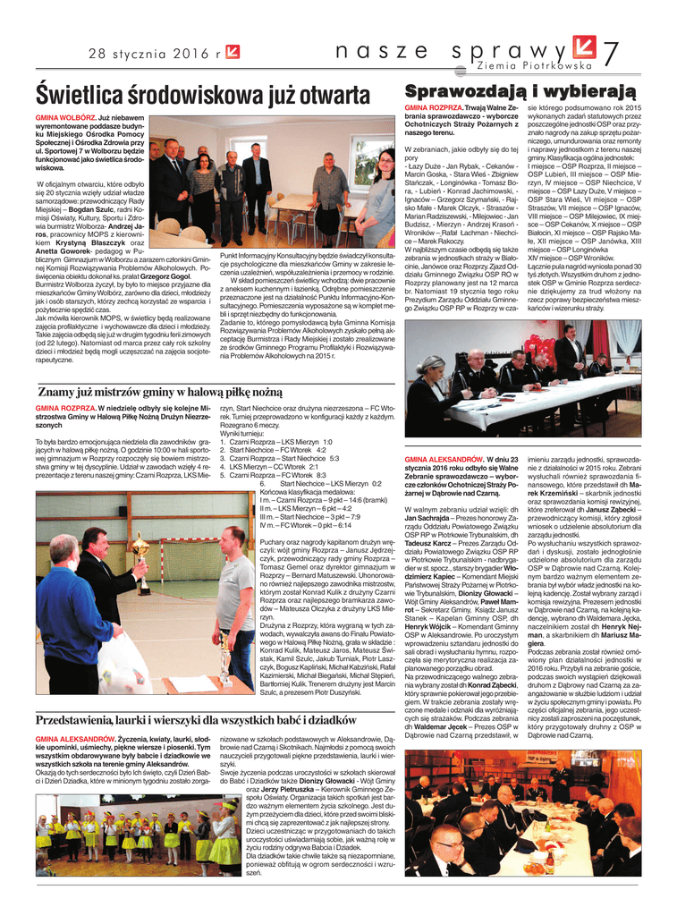 nasze sprawy 28 stycznia 2016 r Ziemia Piotrkowska Świetlica środowiskowa już otwarta GMINA WOLBÓRZ. Już niebawem wyremontowane poddasze budynku Miejskiego Ośrodka Pomocy Społecznej i Ośrodka Zdrowia przy ul. Sportowej 7 w Wolborzu będzie funkcjonować jako świetlica środowiskowa. W oficjalnym otwarciu, które odbyło się 20 stycznia wzięły udział władze samorządowe: przewodniczący Rady Miejskiej – Bogdan Szulc, radni Komisji Oświaty, Kultury, Sportu i Zdrowia burmistrz Wolborza- Andrzej Jaros, pracownicy MOPS z kierownikiem Krystyną Błaszczyk oraz Anetta Goworek- pedagog w Publicznym Gimnazjum w Wolborzu a zarazem członkini Gminnej Komisji Rozwiązywania Problemów Alkoholowych. Poświęcenia obiektu dokonał ks. prałat Grzegorz Gogol. Burmistrz Wolborza życzył, by było to miejsce przyjazne dla mieszkańców Gminy Wolbórz, zarówno dla dzieci, młodzieży jak i osób starszych, którzy zechcą korzystać ze wsparcia i pożytecznie spędzić czas. Jak mówiła kierownik MOPS, w świetlicy będą realizowane zajęcia profilaktyczne i wychowawcze dla dzieci i młodzieży. Takie zajęcia odbędą się już w drugim tygodniu ferii zimowych (od 22 lutego). Natomiast od marca przez cały rok szkolny dzieci i młodzież będą mogli uczęszczać na zajęcia socjoterapeutyczne. Punkt Informacyjny Konsultacyjny będzie świadczył konsultacje psychologiczne dla mieszkańców Gminy w zakresie leczenia uzależnień, współuzależnienia i przemocy w rodzinie. W skład pomieszczeń świetlicy wchodzą: dwie pracownie z aneksem kuchennym i łazienką. Odrębne pomieszczenie przeznaczone jest na działalność Punktu Informacyjno-Konsultacyjnego. Pomieszczenia wyposażone są w komplet mebli i sprzęt niezbędny do funkcjonowania. Zadanie to, którego pomysłodawcą była Gminna Komisja Rozwiązywania Problemów Alkoholowych zyskało pełną akceptację Burmistrza i Rady Miejskiej i zostało zrealizowane ze środków Gminnego Programu Profilaktyki i Rozwiązywania Problemów Alkoholowych na 2015 r. 7 Spr awozdają i wybierają GMINA ROZPRZA.Trwają Walne Zebrania sprawozdawczo - wyborcze Ochotniczych Straży Pożarnych z naszego terenu. W zebraniach, jakie odbyły się do tej pory - Łazy Duże - Jan Rybak, - Cekanów Marcin Goska, - Stara Wieś - Zbigniew Stańczak, - Longinówka - Tomasz Bora, - Lubień - Konrad Jachimowski, Ignaców – Grzegorz Szymański, - Rajsko Małe - Marek Olczyk, - Straszów Marian Radziszewski, - Milejowiec - Jan Budzisz, - Mierzyn - Andrzej Krasoń Wroników – Rafał Łachman - Niechcice – Marek Rakoczy. W najbliższym czasie odbędą się także zebrania w jednostkach straży w Białocinie, Janówce oraz Rozprzy.Zjazd Oddziału Gminnego Związku OSP RO w Rozprzy planowany jest na 12 marca br. Natomiast 19 stycznia tego roku Prezydium Zarządu Oddziału Gminnego Związku OSP RP w Rozprzy w cza- sie którego podsumowano rok 2015 wykonanych zadań statutowych przez poszczególne jednostki OSP oraz przyznało nagrody na zakup sprzętu pożarniczego, umundurowania oraz remonty i naprawy jednostkom z terenu naszej gminy. Klasyfikacja ogólna jednostek: I miejsce – OSP Rozprza, II miejsce – OSP Lubień, III miejsce – OSP Mierzyn, IV miejsce – OSP Niechcice, V miejsce – OSP Łazy Duże, V miejsce – OSP Stara Wieś, VI miejsce – OSP Straszów, VII miejsce – OSP Ignaców, VIII miejsce – OSP Milejowiec, IX miejsce – OSP Cekanów, X miejsce – OSP Białocin, XI miejsce – OSP Rajsko Małe, XII miejsce – OSP Janówka, XIII miejsce – OSP Longinówka XIV miejsce – OSP Wroników. Łącznie pula nagród wyniosła ponad 30 tyś złotych.Wszystkim druhom z jednostek OSP w Gminie Rozprza serdecznie dziękujemy za trud włożony na rzecz poprawy bezpieczeństwa mieszkańców i wizerunku straży. Znamy już mistrzów gminy w halową piłkę nożną GMINA ROZPRZA. W niedzielę odbyły się kolejne Mistrzostwa Gminy w Halową Piłkę Nożną Drużyn Niezrzeszonych To była bardzo emocjonująca niedziela dla zawodników grających w halową piłkę nożną. O godzinie 10:00 w hali sportowej gimnazjum w Rozprzy rozpoczęły się bowiem mistrzostwa gminy w tej dyscyplinie. Udział w zawodach wzięły 4 reprezentacje z terenu naszej gminy:Czarni Rozprza, LKS Mie- rzyn, Start Niechcice oraz drużyna niezrzeszona – FC Wtorek. Turniej przeprowadzono w konfiguracji każdy z każdym. Rozegrano 6 meczy. Wyniki turnieju: 1. Czarni Rozprza – LKS Mierzyn 1:0 2. Start Niechcice – FC Wtorek 4:2 3. Czarni Rozprza – Start Niechcice 5:3 4. LKS Mierzyn – CC Wtorek 2:1 5. Czarni Rozprza – FC Wtorek 8:3 Start Niechcice – LKS Mierzyn 0:2 6. Końcowa klasyfikacja medalowa: I m. – Czarni Rozprza – 9 pkt – 14:6 (bramki) II m. – LKS Mierzyn – 6 pkt – 4:2 III m. – Start Niechcice – 3 pkt – 7:9 IV m. – FC Wtorek – 0 pkt – 6:14 Puchary oraz nagrody kapitanom drużyn wręczyli: wójt gminy Rozprza – Janusz Jędrzejczyk, przewodniczący rady gminy Rozprza – Tomasz Gemel oraz dyrektor gimnazjum w Rozprzy – Bernard Matuszewski. Uhonorowano również najlepszego zawodnika mistrzostw, którym został Konrad Kulik z drużyny Czarni Rozprza oraz najlepszego bramkarza zawodów – Mateusza Olczyka z drużyny LKS Mierzyn. Drużyna z Rozprzy, która wygraną w tych zawodach, wywalczyła awans do Finału Powiatowego w Halową Piłkę Nożną, grała w składzie : Konrad Kulik, Mateusz Jaros, Mateusz Świstak, Kamil Szulc, Jakub Turniak, Piotr Laszczyk, Bogusz Kapliński, Michał Kabziński, Rafał Kazimierski, Michał Biegański, Michał Stępień, Bartłomiej Kulik. Trenerem drużyny jest Marcin Szulc, a prezesem Piotr Duszyński. Przedstawienia, laurki i wierszyki dla wszystkich babć i dziadków GMINA ALEKSANDRÓW. Życzenia, kwiaty, laurki, słodkie upominki, uśmiechy, piękne wiersze i piosenki.Tym wszystkim obdarowywane były babcie i dziadkowie we wszystkich szkoła na terenie gminy Aleksandrów. Okazją do tych serdecznoś