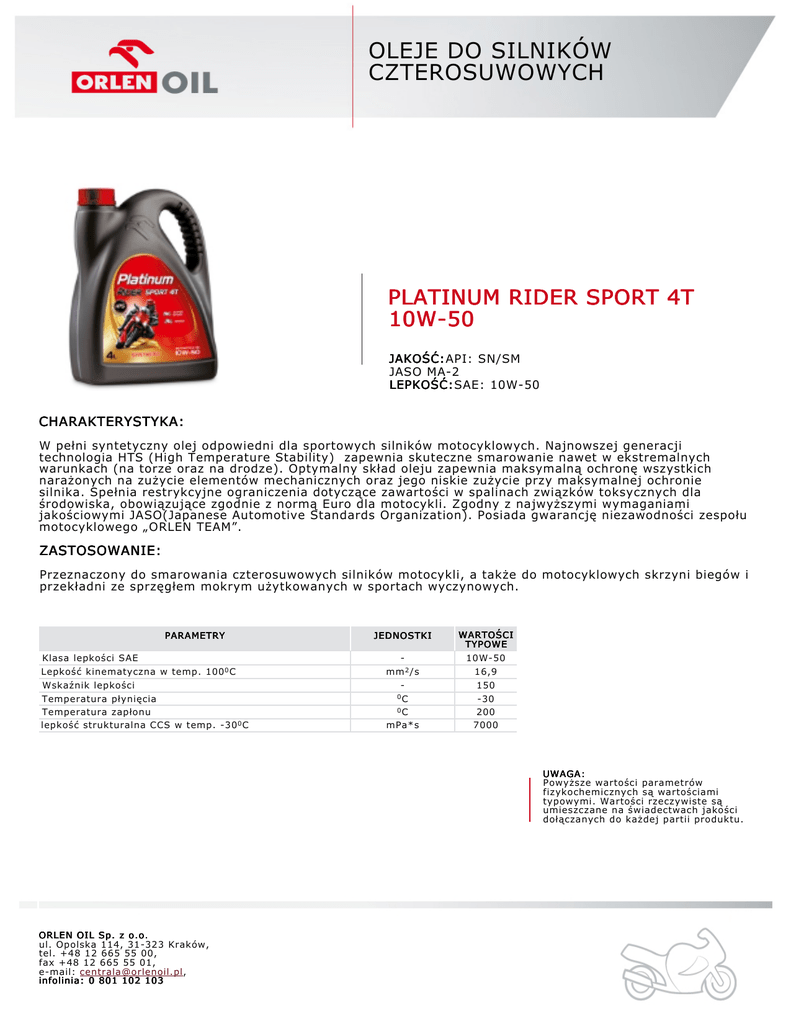OLEJE DO SILNIKÓW CZTEROSUWOWYCH PLATINUM RIDER SPORT 4T 10W50 JAKOŚĆ: JAKOŚĆ:API: SN/SM JASO MA2 LEPKOŚĆ: LEPKOŚĆ:SAE: 10W50 CHARAKTERYSTYKA: W pełni syntetyczny olej odpowiedni dla sportowych silników motocyklowych. Najnowszej generacji technologia HTS (High Temperature Stability) zapewnia skuteczne smarowanie nawet w ekstremalnych warunkach (na torze oraz na drodze). Optymalny skład oleju zapewnia maksymalną ochronę wszystkich narażonych na zużycie elementów mechanicznych oraz jego niskie zużycie przy maksymalnej ochronie silnika. Spełnia restrykcyjne ograniczenia dotyczące zawartości w spalinach związków toksycznych dla środowiska, obowiązujące zgodnie z normą Euro dla motocykli. Zgodny z najwyższymi wymaganiami jakościowymi JASO(Japanese Automotive Standards Organization). Posiada gwarancję niezawodności zespołu motocyklowego „ORLEN TEAM”. ZASTOSOWANIE: Przeznaczony do smarowania czterosuwowych silników motocykli, a także do motocyklowych skrzyni biegów i przekładni ze sprzęgłem mokrym użytkowanych w sportach wyczynowych. PARAMETRY Klasa lepkości SAE Lepkość kinematyczna w temp. 100 0 C Wskaźnik lepkości Temperatura płynięcia Temperatura zapłonu lepkość strukturalna CCS w temp. 30 0 C JEDNOSTKI WARTOŚCI TYPOWE 10W50 mm 2 /s 0C 0C mPa*s 16,9 150 30 200 7000 UWAGA: Powyższe wartości parametrów fizykochemicznych są wartościami typowymi. Wartości rzeczywiste są umieszczane na świadectwach jakości dołączanych do każdej partii produktu. ORLEN OIL Sp. z o.o. ul. Opolska 114, 31323 Kraków, tel. +48 12 665 55 00, fax +48 12 665 55 01, email: [email protected], infolinia: 0 801 102 103