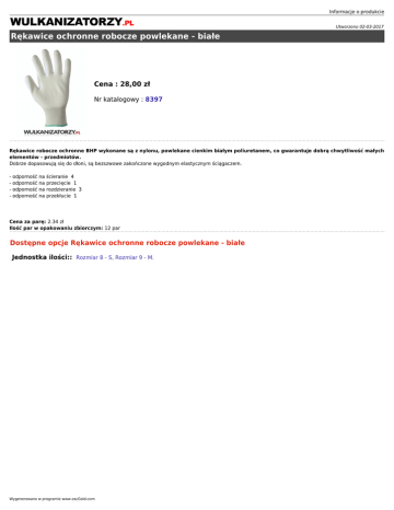 Informacje o produkcie Utworzono 02-03-2017 Rękawice ochronne robocze powlekane - białe Cena : 28,00 zł Nr katalogowy : 8397 Rękawice robocze ochronne BHP wykonane są z nylonu, powlekane cienkim białym poliuretanem, co gwarantuje dobrą chwytliwość małych elementów - przedmiotów. Dobrze dopasowują się do dłoni, są bezszwowe zakończone wygodnym elastycznym ściągaczem. - odporność na ścieranie 4 - odporność na przecięcie 1 - odporność na rozdzieranie 3 - odporność na przekłucie 1 Cena za parę: 2.34 zł Ilość par w opakowaniu zbiorczym: 12 par Dostępne opcje Rękawice ochronne robocze powlekane - białe Jednostka ilości:: Rozmiar 8 - S, Rozmiar 9 - M. Wygenerowano w programie www.oscGold.com