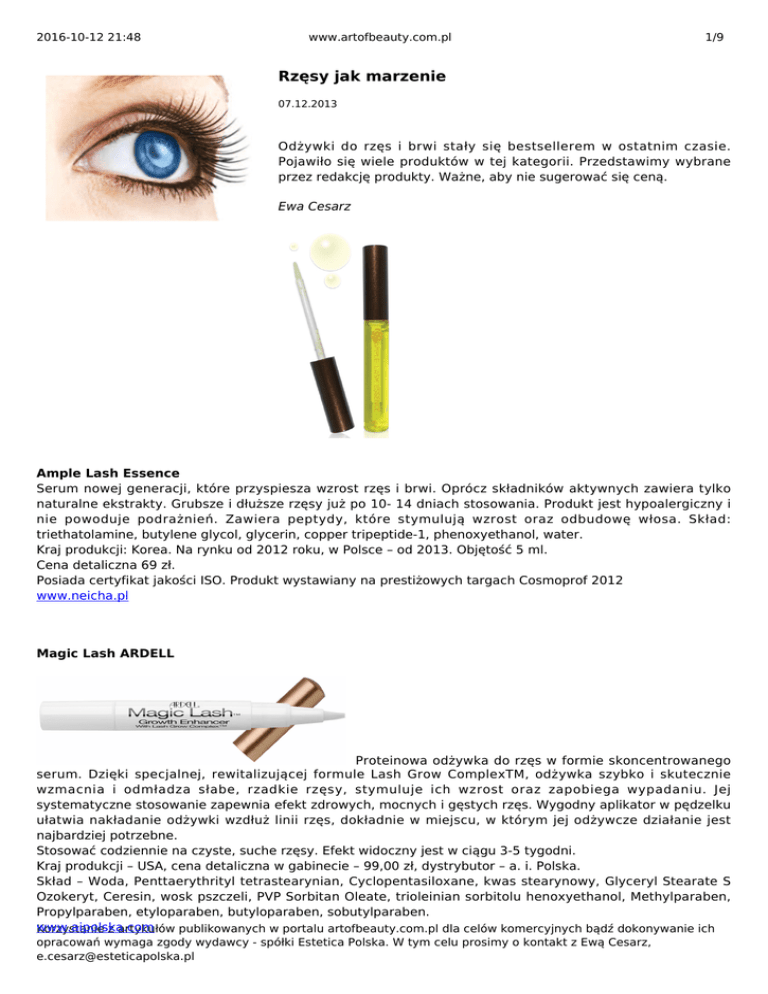 2016-10-12 21:48 www.artofbeauty.com.pl 1/9 Rzęsy jak marzenie 07.12.2013 Odżywki do rzęs i brwi stały się bestsellerem w ostatnim czasie. Pojawiło się wiele produktów w tej kategorii. Przedstawimy wybrane przez redakcję produkty. Ważne, aby nie sugerować się ceną. Ewa Cesarz Ample Lash Essence Serum nowej generacji, które przyspiesza wzrost rzęs i brwi. Oprócz składników aktywnych zawiera tylko naturalne ekstrakty. Grubsze i dłuższe rzęsy już po 10- 14 dniach stosowania. Produkt jest hypoalergiczny i nie powoduje podrażnień. Zawiera peptydy, które stymulują wzrost oraz odbudowę włosa. Skład: triethatolamine, butylene glycol, glycerin, copper tripeptide-1, phenoxyethanol, water. Kraj produkcji: Korea. Na rynku od 2012 roku, w Polsce – od 2013. Objętość 5 ml. Cena detaliczna 69 zł. Posiada certyfikat jakości ISO. Produkt wystawiany na prestiżowych targach Cosmoprof 2012 www.neicha.pl Magic Lash ARDELL Proteinowa odżywka do rzęs w formie skoncentrowanego serum. Dzięki specjalnej, rewitalizującej formule Lash Grow ComplexTM, odżywka szybko i skutecznie wzmacnia i odmładza słabe, rzadkie rzęsy, stymuluje ich wzrost oraz zapobiega wypadaniu. Jej systematyczne stosowanie zapewnia efekt zdrowych, mocnych i gęstych rzęs. Wygodny aplikator w pędzelku ułatwia nakładanie odżywki wzdłuż linii rzęs, dokładnie w miejscu, w którym jej odżywcze działanie jest najbardziej potrzebne. Stosować codziennie na czyste, suche rzęsy. Efekt widoczny jest w ciągu 3-5 tygodni. Kraj produkcji – USA, cena detaliczna w gabinecie – 99,00 zł, dystrybutor – a. i. Polska. Skład – Woda, Penttaerythrityl tetrastearynian, Cyclopentasiloxane, kwas stearynowy, Glyceryl Stearate S Ozokeryt, Ceresin, wosk pszczeli, PVP Sorbitan Oleate, trioleinian sorbitolu henoxyethanol, Methylparaben, Propylparaben, etyloparaben, butyloparaben, sobutylparaben. www.aipolska.com Korzystanie z artykułów publikowanych w portalu artofbeauty.com.pl dla celów komercyjnych bądź dokonywanie ich opracowań wymaga zgody wydawcy - spółki Estetica Polska. W tym celu prosimy o kontakt z Ewą Cesarz, [email protected] 2016-10-12 21:48 www.artofbeauty.com.pl 2/9 Stymulator wzrostu rzęs i brwi BANDI To nowoczesny produkt, który składa się z dwóch preparatów – serum do rzęs oraz odżywki do rzęs i brwi, pomysłowo i praktycznie zapakowanych w dwustronne opakowanie. Stymulator przeznaczony jest dla osób, które chcą wzmocnić kondycję rzęs i brwi, zmniejszyć ich łamliwość i wypadanie oraz przyspieszyć wzrost. Może być stosowany przez osoby ze skórą szczególnie wrażliwą, atopową, a także noszące szkła kontaktowe. Jest hipoalergiczny, testowany okulistycznie, dermatologicznie, bezzapachowy. Pierwsze efekty działania Stymulatora wzrostu rzęs i brwi widoczne są już po 6 tygodniach codziennego stosowania. Składniki aktywne: Serum do rzęs: csulfopeptydy z soi bogate w glicynę, aminokwasy: tyrozyna, arginina, ornityna, cytrulina, aminosacharyd: glukozamina, witamina PP, witamina B5, biotyna, ekstrakt z żeńszenia (Panax Ginseng), ekstrakt z korzenia łopianu (Arctium Majus), wyjątkowe połączenie peptydu sygnałowego i ekstraktu z czerwonej koniczyny. Odżywka do rzęs i brwi: D-pantenol, biotyna, proteiny jedwabiu, fucogel, witamina A, witamina E, olejek arganowy. Cena detaliczna – 167,00 zł (2x4ml). Kraj produkcji: Polska. Producent/dystrybutor: BANDI Cosmetics. www.bandi.pl CharmLash® Pierwsze, polskie serum odżywcze oparte na najnowszych osiągnięciach kosmetologii. Jego gęsta formuła i ergonomiczne opakowanie pozwalają na łatwą i bezpieczną aplikację. Nowoczesna receptura odżywki zawiera wysokoskoncentrowane surowce high-tech, które stymulują wzrost rzęs i zapewniają widoczny efekt już po 4 tygodniach stosowania. Kosmetyk pielęgnuje włoski, sprawia, że stają się dłuższe i bardziej gęste. Podstawą działania innowacyjnej odżywki są peptydy i witaminy, które pobudzają naturalny proces regeneracji, odżywiają włoski, przedłużają okres ich wzrostu i życia. Rzęsy stają się grubsze i mocniejsze – jest to wynik zatrzymywania wody oraz ich lepszego odżywienia. Składniki: peptydy, biotyna (witamina B7), D-pantenol, witamina PP, lecytyna, olej sojowy, b-glukagon, polisacharydy. Cena: 290 zł /3,2 ml lub 190 zł /1,6 ml. Serum dostępne w sprzedaży na www.charmlash.pl oraz w wybranych salonach partnerskich Charmine Rose®. Korzystanie z artykułów publikowanych w portalu artofbeauty.com.pl dla celów komercyjnych bądź dokonywanie ich opracowań wymaga zgody wydawcy - spółki Estetica Polska. W tym celu prosimy o kontakt z Ewą Cesarz, [email protected] 2016-10-12 21:48 www.artofbeauty.com.pl 3/9 Odżywka PureLash Extender & Conditioner do brwi i rzęs Jane Iredale Wydłużająca i pogrubiająca kremowa odżywka do rzęs, zapobiegająca ich łamaniu i rozdwajaniu. Wzmacnia strukturę rzęs i pozwala na uzyskanie efektu wydłużającej maskary. Działa jak podkład pod tusz, wpływa na mniejsze jego zużycie. Odżywia rzęsy i wspomaga ich odrost. Może być stosowana na brwi oraz bezpośrednio na rzęsy, jako zabieg regenerujący na noc. Skład: Water/Eau/Aqua, Algae Extract, Beeswax, Stearic Acid, Glycerin, Copernicia Cerifera (Carnauba) Wax, Hydroxyethylcellulose, Panthenol, Hydrolyzed Wheat Protein, Oleic Acid, Vanilla Tahitensis Fruit Extract, Prunus Amygdalus Dulcis (Sweet Almond) Seed Extract. Producent: Jane Iredale, dystrybutor: Protea AntiAging Sp. z o. o., kraj produkcji: USA, stała cena detaliczna: 95.00 zł. www.proteaantiaging.pl Odżywka do rzęs i brwi PureBrow Jane Iredale Koloryzująca, mineralna odżywka do rzęs i brwi. Wspomaga ich ułożenie, wygładza i dodaje objętości. Może być również stosowana jako maskara na rzęsy. Zawiera unikalną mieszankę wysokiej jakości minerałów morskich, która wpływa na ochronę i odżywienie włosów brwi. Brwi są zdrowsze, gładsze i łatwiejs