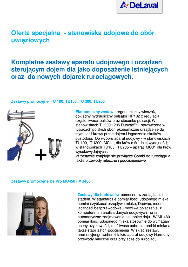 Oferta specjalna - stanowiska udojowe do obór uwięziowych Kompletne zestawy aparatu udojowego i urządzeń sterującym dojem dla jako doposaŜenie istniejących oraz do nowych dojarek rurociągowych. Zestawy promocyjne TU 100, TU105, TU 200, TU205 + Ekonomiczny zestaw - ergonomiczny wieszak, dokładny hydrauliczny pulsator HP102 z regulacją częstotliwości pulsów oraz stosunku pulsacji. W stanowiskach TU200 i 205 Duovac™- sprawdzone w tysiącach polskich obór ekonomiczne urządzenie do stymulacji krowy przed dojem i łagodzenia skutków pustodoju. Do wyboru aparat udojowy - w stanowiskach TU100, TU200- MC11, dla krów o średniej wydajności; w stanowiskach TU105 i TU205 – aparat MC31 dla krów wysokowydajnych . W zestawie znajduje się przyłącze Combi do rurociągu a takŜe przewody mleczne i podciśnieniowe Zestawy promocyjne DelPro MU450 i MU480 Zestawy dla hodowców pomocne w zarządzaniu stadem. W standardzie pomiar ilości udojonego mleka, pomiar szybkości przepływu mleka, Duovac, moduł łączności bezprzewodowej- moŜliwe połączenie z komputerem i analiza danych udojowych oraz automatyczne zdejmowanie na koniec doju. W MU480 pomiar ilości udojonego mleka stosownie do wymagań oceny uŜytkowości, moŜliwość pobrania próbki mleka a takŜe stabilizator podciśnienia W skład zestawu promocyjnego wchodzi takŜe aparat udojowy Harmony, przewody mleczne oraz przyłącze do rurociągu.