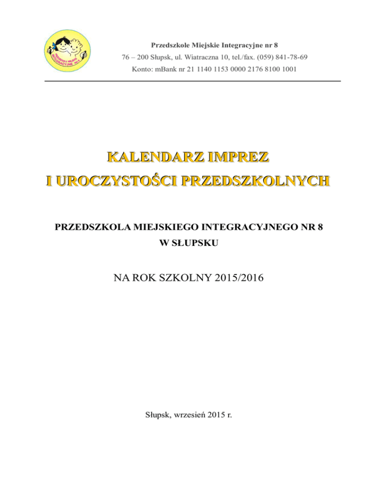 Przedszkole Miejskie Integracyjne nr 8 76 – 200 Słupsk, ul. Wiatraczna 10, tel./fax. (059) 841-78-69 Konto: mBank nr 21 1140 1153 0000 2176 8100 1001 KALENDARZ IMPREZ I UROCZYSTOŚCI PRZEDSZKOLNYCH PRZEDSZKOLA MIEJSKIEGO INTEGRACYJNEGO NR 8 W SŁUPSKU NA ROK SZKOLNY 2015/2016 Słupsk, wrzesień 2015 r. Kalendarz imprez i uroczystości przedszkolnych w roku szkolnym 2015/2016 KALENDARZ IMPREZ I UROCZYSTOŚCI PRZEDSZKOLNYCH W ROKU SZKOLNYM 2015/2016 Data Osoby / grupy odpowiedzialne Wydarzenie Wrzesień 18.09 Ogólnopolski Dzień Przedszkolaka Zabawy tematyczne w poszczególnych dyskoteka. 28.09 Wycieczka do Starkowa na wykopki Edukacja dzieci na temat zwyczajów i tradycji wiejskich związanych ze zbieraniem ziemniaków/ zajęcia praktyczne grupach, Wszystkie grupy Wyjazd grupy IV i V Październik 5.10 Narodowy Dzień Sportu Zachęcenie rodziców do aktywnego spędzenia czasu wolnego z dziećmi podczas imprez sportowych zorganizowanych 3.10 na terenie miasta udział dzieci w przedszkolnych zawodach sportowych, promowanie działań prozdrowotnych 7.10 Wycieczka do Orzechowa rozpoczęcie sezonu jesiennego. 14.10 Dzień Edukacji Narodowej program artystyczny w wykonaniu grupy V 22.10 Dzień ziemniaka i jabłka promowanie działań prozdrowotnych ruchowe, konkursy 25.10 Rozpoczęcie sezonu morsowania promowanie działań prozdrowotnych i aktywnego wypoczynku Rehabilitant ruchowy, nauczyciele Wszystkie grupy Grupa V – zabawy Grupa III Wszystkie grupy 2 Kalendarz imprez i uroczystości przedszkolnych w roku szkolnym 2015/2016 Data Wydarzenie Osoby / grupy odpowiedzialne Listopad 7.11 Jesienny rajd rowerowy promowanie działań prozdrowotnych i aktywnego wypoczynku Wszystkie grupy 12.11 Pasowanie maluszków na przedszkolaków wspólna zabawa, przygotowanie drobnych upominków dla najmłodszych Grupa V 27.11 Andrzejki „Wielki zlot czarodziejów i wróżek” odpowiedzialna Grupa II Grudzień 3.12 Międzynarodowy Dzień Osób Niepełnosprawnych wykonanie prac plastycznych przez każdą z grup, zorganizowanie wystawy wraz z hasłami, zaproszenie gości: Stowarzyszenie „Arkus”, Stowarzyszenie „Wiatraczek”, Fundacja „Nadzieja”, Związek głuchych, „Wózkowicze”, mediów, rodziców, absolwentów przedszkola Grupa I i IV, rehabilitant ruchowy, logopeda 7.12 Zabawy z Mikołajem wspólne poszukiwanie Mikołaja, konkursy, wręczanie drobnych upominków dla dzieci, Grupa III, Rada Rodziców, nauczyciele x Świąteczny Kiermasz Bożonarodzeniowy Rada Rodziców, nauczyciele, dyrektor x Jasełka spotkania wigilijne w grupach, rodzice, dzieci, kadra 3 Kalendarz imprez i uroczystości przedszkolnych w roku szkolnym 2015/2016 Data Osoby / grupy odpowiedzialne Wydarzenie Styczeń x Bal Karnawałowy wspólna zabawa dzieci z każdej grupy, konkurs na najciekawszy strój, x Dzień Babci i Dziadka program artystyczny w wykonaniu każdej grupy, poczęstunek przygotowany z pomocą rodziców. Rada Rodziców, nauczyciele Luty 4.02 11.02 Konkurs fotograficzny dla rodziców i dzieci "Aktywnie spędzam czas z moim dzieckiem" "Olimpijki sportowe dla dzieci i rodziców" przygotowanie stacji sportowych dla dzieci i rodziców zakończenie dnia meczem rozgrywanym między rodzicami a dziećmi 15.02 Ferie zimowe 26.02 Wszystkie grupy rehabilitant ruchowy, nauczycielki nauczyciele Marzec 9.03 Dzień Olimpijczyka zapoznanie dzieci z konkurencjami zawody sportowe w stylu olimpijskim. 20.03 Pierwszy Dzień Wiosny 21.03 Wiosenny rajd rowerowy promowanie działań prozdrowotnych i aktywnego wypoczynku olimpijskimi, rehabilitant ruchowy, logopeda i nauczyciele Grupa I Wszystkie grupy 4 Kalendarz imprez i uroczystości przedszkolnych w roku szkolnym 2015/2016 Data Osoby / grupy odpowiedzialne Wydarzenie x Światowy Dzień Osób z Zespołem Downa Utworzenie gazetki informacyjnej w holu przedszkola x Przedszkolny Konkurs Wiedzy o Słupsku zmagania drużynowe dzieci z grupy V i ich rodziców Grupa V, rodzice Kwiecień 4.04 Światowy Dzień Wiedzy o Autyzmie pochód „niebieskich balonów” ulicami osiedla 19.04 Światowy Dzień Cyrku Grupa II 22.04 Światowy Dzień Ziemi Grupa III Wszystkie grupy Maj x Dzień Godności Osób Niepełnosprawnych Intelektualnie x Przedszkolny Konkurs "Bezpieczny Przedszkolak" zmagania drużynowe grup IV i V x Dzień Mamy i Dzień Taty program artystyczny przygotowany przez każdą z grup, wręczanie rodzicom przygotowanych przez dzieci upominków, poczęstunek. Wszystkie grupy x Olimpiada specjalna i treningowa Dnia Aktywności Motorycznej zawody z udziałem dzieci niepełnosprawnych, wyjazdowe Rehabilitant ruchowy Grupa IV 5 Kalendarz imprez i uroczystości przedszkolnych w roku szkolnym 2015/2016 Data Wydarzenie Osoby / grupy odpowiedzialne Czerwiec x Obchody Dnia Dziecka Zaproszenie dzieci ze Szkoły Podstawowej w Warcinie. Wesołe zabawy na terenie przedszkola. x Konkurs taneczny "Roztańczony przedszkolak" Rada Rodziców, nauczyciele Grupa V 27.06 Rodzinny spływ kajakowy promowanie działań prozdrowotnych i aktywnego wypoczynku Wszystkie grupy x Pożegnanie starszaków przedstawienie programu artystycznego przez młodszych kolegów z grupy IV, wręczenie upominków, uroczyste wręczenie dyplomów i pamiątek. Grupa IV 6