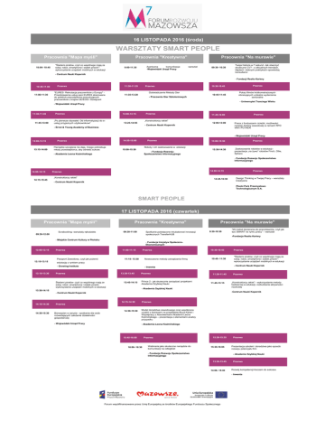 16 LISTOPADA 2016 (środa) WARSZTATY SMART PEOPLE Pracownia "Mapa myśli" 10:00- 10:45 Pracownia "Kreatywna" "Śladami piratów- czyli co wspólnego mają ze sobą: robot, smartphone i statek piracki"wykorzystanie urządzeń mobilnych w edukacji Asertywna komunikacja-Wojewódzki Urząd Pracy 9:00-11:30 Pracownia "Na murawie" warsztat Twoja historia w 7 sekund. Jak stworzyć skuteczne CV? - o aktualnych trendach, błędach i dobrych praktykach opowiedzą konsultanci 09:30- 10:30 - Centrum Nauki Kopernik - Fundacji Realia Kariery 10:45-11:00 11:00-11:30 Przerwa 11:30-11:35 "EURES- Rekrutacja pracowników z Europy" Przedstawienie usług sieci EURES skierowane do polskich pracodawców poszukujących pracowników z krajów UE/EOG i Szwajcarii Przerwa Przerwa 10.30-10.45 Doświadczenie Metody Gier 11:35-13:20 Pokaz filmów krótkometrażowych obrazujących unikalne wydarzenia senioralne 10:45-11:45 - Pracownia Gier Szkoleniowych - Uniwersytet Trzeciego Wieku - Wojewódzki Urząd Pracy 11:30-11:45 11:45-13:00 Przerwa Przerwa 13:00-13:15 „Po pierwsze obywatel. Od informatyzacji do eusług przyjaznych użytkownikowi” Przerwa 11:45-12.00 „Konstruktorzy rakiet” 13:25-14:55 Praca z funduszami- ścieżki, możliwości rozwoju kariery zawodowej w ramach RPO WM i PO WER 12:00-13:00 - Centrum Nauki Kopernik - Ernst & Young Academy of Business - Wojewódzki Urząd Pracy 13:00-13:15 13:15-14:00 14:55-15:00 Przerwa Pieniądze szczęścia nie dają. Czego potrzebuje młody przedsiębiorca, aby odnieść sukces Przerwa Przerwa 13:00-13:30 Roboty i ich zastosowanie w edukacji 15:00-15:30 Zastosowanie robotów w edukacji– prezentacja „na żywo” robotów Finch, Ollie, Sphero 13:30-14:30 - Fundacja Rozwoju Społeczeństwa Informacyjnego - Akademia Leona Koźmińskiego - Fundacja Rozwoju Społeczeństwa Informacyjnego 14:00-14:15 14:00-14:15 Przerwa „Konstruktorzy rakiet” Przerwa Design Thinking w Twojej Pracy – warsztaty kreatywne 14:45-16:30 14:15-15:45 - Centrum Nauki Kopernik Płocki Park Przemysłowo Technologicznym S.A. SMART PEOPLE 17 LISTOPADA 2016 (czwartek) Pracownia "Mapa myśli" Pracownia "Kreatywna" Scrabooking- warsztaty rękodzieła Spotkanie poświęcone inkubatorowi innowacji społecznych TransferHUB 09:30-11:00 09:30-12:00 Pracownia "Na murawie" "20 metod docierania do pracodawców, czyli jak być SMART na rynku pracy” – warsztat 9:30-10:30 -Fundacja Realia Kariery - Miejskie Centrum Kultury w Płońsku - Fundacja Inicjatyw SpołecznoEkonomicznych 12:00-12:15 Przerwa 11:00-11:15 Paszport Zawodowy, czyli jak pożenić 12:15-13:15 Przerwa Nowoczesne metody zarządzania firmą 11:15- 13:30 Przerwa 13:30-13:45 13:45-14:15 - Centrum Nauki Kopernik Przerwa Prince 2 - jak skutecznie zarządzać projektami Akademia Szybkiej Nauki 11:30-11:45 11:45-13:15 - Akademia Szybkiej Nauki 13:30-14:15 Przerwa „Konstruktorzy rakiet” - wykorzystanie metody badawczej w edukacji, rozbudzanie aktywności naukowej -Centrum Nauki Kopernik - Centrum Nauki Kopernik 14:15-14:30 14:30-15:30 "Śladami piratów- czyli co wspólnego mają ze sobą: robot, smartphone i statek piracki"wykorzystanie urządzeń mobilnych w edukacji 10:45- 11:30 - Inwenta Śladami piratów- czyli co wspólnego mają ze sobą: robot, smartphone i statek pirackiwykorzystanie urządzeń mobilnych w edukacji 14:15-14:30 Przerwa edukację z rynkiem pracy - Growing Institute 13:15-13:30 10:30-10:45 Przerwa Przerwa Biznesplan w zarysie - spotkanie dla osób rozważających założenie działalności gospodarczej 14:30-15:30 - Wojewódzki Urząd Pracy :30 Model doradztwa zawodowego oraz współpraca uczelni z biznesem na przykładzie Biura Karier i Współpracy z Absolwentami Akademii Leona Koźmińskiego – prezentacja z elementami analizy przypadku - Akademia Leona Koźmińskiego Przerwa 15:45-16:00 16:00- 16:30 15:30-15:35 Przerwa Webinaria jako skuteczne narzędzie do komunikacji na odległość 15:35-16:05 Przerwa Prezentacja szkoleń i doradztwa jako sposób rozwoju potencjału firm - Fundacja Rozwoju Społeczeństwa Informacyjnego - Akademia Szybkiej Nauki 13:30-13:45 14:00- 15:30 Przerwa Rozwój kompetencji kluczem do sukcesu - Inwenta :00 Przerwa 15:45-16:00 Forum współfinansowane przez Unię Europejską ze środków Europejskiego Funduszu Społecznego Prze