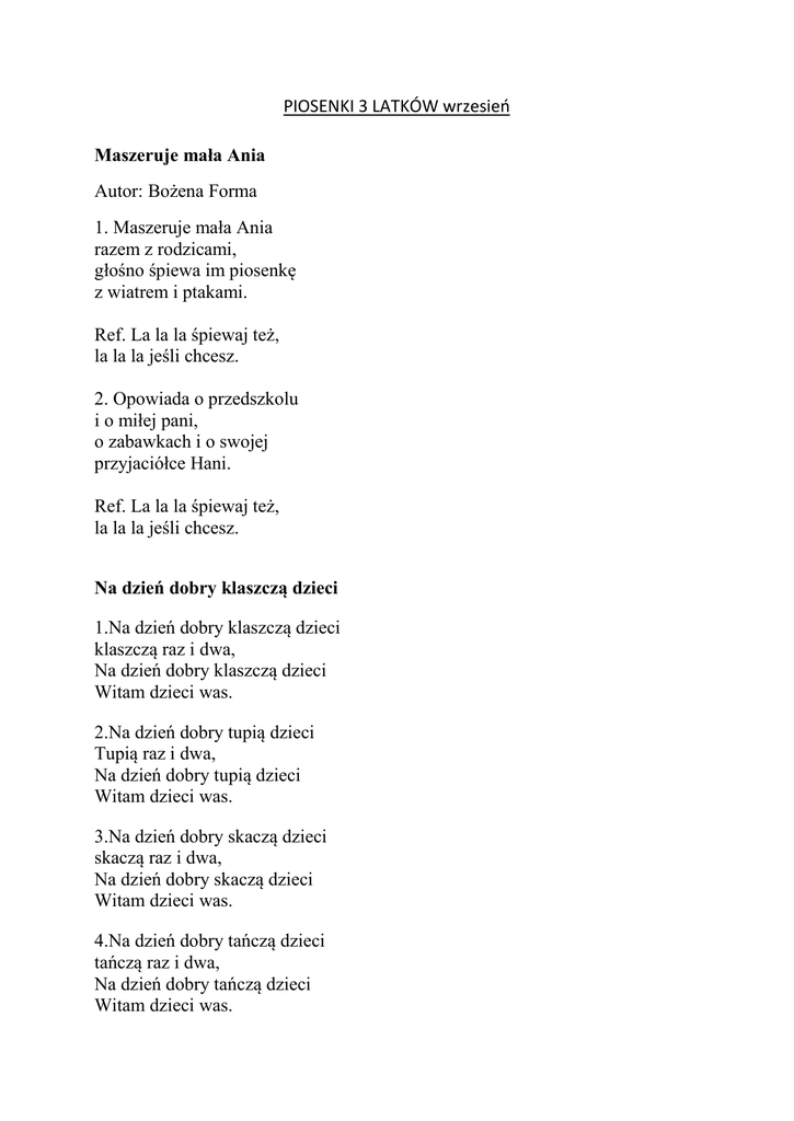 PIOSENKI 3 LATKÓW wrzesień Maszeruje mała Ania Autor: Bożena Forma 1. Maszeruje mała Ania razem z rodzicami, głośno śpiewa im piosenkę z wiatrem i ptakami. Ref. La la la śpiewaj też, la la la jeśli chcesz. 2. Opowiada o przedszkolu i o miłej pani, o zabawkach i o swojej przyjaciółce Hani. Ref. La la la śpiewaj też, la la la jeśli chcesz. Na dzień dobry klaszczą dzieci 1.Na dzień dobry klaszczą dzieci klaszczą raz i dwa, Na dzień dobry klaszczą dzieci Witam dzieci was. 2.Na dzień dobry tupią dzieci Tupią raz i dwa, Na dzień dobry tupią dzieci Witam dzieci was. 3.Na dzień dobry skaczą dzieci skaczą raz i dwa, Na dzień dobry skaczą dzieci Witam dzieci was. 4.Na dzień dobry tańczą dzieci tańczą raz i dwa, Na dzień dobry tańczą dzieci Witam dzieci was. Bezpieczne przejście: 1.Zielone światło nad drogą świeci, na drugą stronę zaprasza dzieci. Ref. Przechodź po pasach na drugą stronę, kiedy się pali światło zielone. 2. Czerwone światło widać z daleka. Co to oznacza? Stop! Proszę czekać! Ref. Czerwone światło – w miejscu stoimy, Na drugą stronę nie przechodzimy! Małe czerwone jabłuszko muzyka i słowa D i K. Jagiełło 1.Małe czerwone jabłuszko tańczy dziś pod drzewem z gruszką. Ref. Za rączki się trzymają i w koło obracają (x2) 2.Małe czerwone jabłuszko tańczy dziś pod drzewem z gruszką Ref. Jabłuszko podskakuje a gruszka przytupuje (x2) 3.Małe czerwone jabłuszko tańczy dziś pod drzewem z gruszką Ref. W rączki klaszcze jabłuszko razem z dojrzałą gruszką (x2) 4.Małe czerwone jabłuszko tańczy dziś pod drzewem z gruszką Ref. Biegną sobie dokoła, jabłuszko gruszkę woła (x2) Pędzi pociąg Pędzi pociąg, pędzi pociąg, A w pociągu dzieci, Jadą, jadą na wycieczkę, słonko jasno świeci. Ref. Pierwszy wagon: hop! Drugi wagon: tup, tup! Trzeci wagon: klap, klap, klap! Pociąg jedzie w świat. Wiersz: Laluś to jest piesek Lenki, co brązowe futro ma. Laluś to jamnik maleńki, który szczeka: hau, hau, hau! Piosenki z września „starszaki i zerówka” „My jesteśmy starszakami” (na melodię „Śpiewanka dla malucha”) My jesteśmy starszakami, chcemy zawsze być zuchami. Często głośno się śmiejemy I posiłki grzecznie jemy. Hop, hop, hop klaśnij w ręce I już nie płacz nigdy więcej Zawsze miły bądź dla pani, Tę piosenkę śpiewaj z nami. W sali miś i piękna lala do zabawy proszą zaraz. Auta, klocki, piłki duże, więc się nie namyślaj dłużej. Hop, hop, hop klaśnij w ręce! ... Z panią gramy i tańczymy wszyscy bardzo to lubimy. A gdy czegoś nie umiemy, szybko się nauczyć chcemy. Hop, hop, hop klaśnij w ręce! … „W przedszkolu jest nas wiele” Ustawimy się w półkole, zaklaszczemy w ręce. Każdy powie: To przedszkole! Pozna po piosence. ref. Bo w przedszkolu jest nas wiele, bo w przedszkolu najweselej, gdzie znajdziecie tyle dzieci małych zuchów tak, jak my? (2x) Po piosence, hejże dzieci!-razem do budowy! Jeden klocek, drugi, trzeci... domek już gotowy! ref. Bo w przedszkolu... „Zabawa w sadzie” Do sadu, do sadu, tam owoców wiele. Jest już mała Zosia i jej przyjaciele. Owoce, owoce do kosza zbierają. Wiedzą, że owoce witaminy mają. A potem, a potem wielka uczta będzie. Ze smakiem owoce każdy zjadać będzie. "OWOCOWY BLUES" (piosenka z rytmiki) 1. Na zmartwienie i na żale dżem ci zrobi doskonale, bowiem w dżemie siła drzemie. Owocowy blues! Ref: Blues, blues, blues owocowy, taniec pyszny to i zdrowy, Słodki jak jabłkowy mus! Owocowy blues! 2. Na zgryzoty i kłopoty bardzo dobre są kompoty, Czy śliwkowe, czy gruszkowe każdy o tym wie! Ref: Blues, blues, blues owocowy, taniec pyszny to i zdrowy, Słodki jak jabłkowy mus! Owocowy blues! 3. Chcesz być silny tak jak smok, owocowy tankuj sok! Malinowy, porzeczkowy, każdy dobry jest! Ref: Blues, blues, blues owocowy, taniec pyszny to i zdrowy, Słodki jak jabłkowy mus! Owocowy blues!