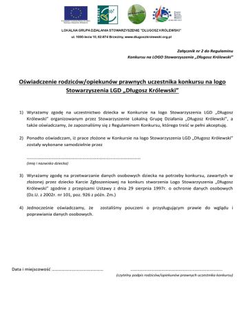 Załącznik nr 2 do Regulaminu Konkursu na LOGO Stowarzyszenia „Długosz Królewski” Oświadczenie rodziców/opiekunów prawnych uczestnika konkursu na logo Stowarzyszenia LGD „Długosz Królewski” 1) Wyrażamy zgodę na uczestnictwo dziecka w Konkursie na logo Stowarzyszenia LGD „Długosz Królewski” organizowanym przez Stowarzyszenie Lokalną Grupę Działania „Długosz Królewski”, a także oświadczamy, że zapoznaliśmy się z Regulaminem Konkursu, którego treśd w pełni akceptuję. 2) Ponadto oświadczam, iż prace złożone w Konkursie na logo Stowarzyszenia LGD „Długosz Królewski” zostały wykonane samodzielnie przez ……………………………………………………………………………………… (imię i nazwisko dziecka) 3) Wyrażamy zgodę na przetwarzanie danych osobowych dziecka na potrzeby konkursu, zawartych w złożonej przez dziecko Karcie Zgłoszeniowej na konkurs stworzenia Logo Stowarzyszenia „Długosz Królewski” zgodnie z przepisami Ustawy z dnia 29 sierpnia 1997r. o ochronie danych osobowych (Dz.U. z 2002r. nr 101, poz. 926 z późn. Zm.) 4) Jednocześnie oświadczamy, że poprawiania danych osobowych. zostaliśmy pouczeni o przysługującym prawie do wglądu i Data i miejscowośd ……………………………………… …………………………………………………………………….. (czytelny podpis rodziców/opiekunów prawnych uczestnika konkursu)