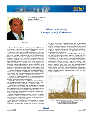 inż. Maciej Guttmeyer Doradca Zarządu Elektrownia Turów S.A. Historia budowy i eksploatacji Elektrowni Geneza Obszar Dolnego Śląska, należący przed 1939 rokiem do Niemiec, miał dobrze rozwiniętą strukturę energetyczną pracowicie budowaną już od 1882 r. Jeszcze w roku 1944 moc zainstalowana w elektrowniach zawodowych (cieplnych i wodnych) wynosiła 453 MW oraz istniała rozbudowana sieć przesyłowo-rozdzielcza. Utrzymujący się na tych terenach od lutego do końca kwietnia 1945 roku front oraz późniejsza dewastacja urządzeń i częściowa ich wywózka na wschód spowodowały, że pod koniec 1945 roku odnotowano tylko 244 MW mocy zainstalowanej w energetyce zawodowej. Sieć przesyłowa oraz stacje rozdzielcze wraz ze swoim oprzyrządowaniem też nie oparły się tym procesom. Szczególnie ucierpiały transformatory oraz izolatory i przewody sieci przesyłowej wysokich napięć. Sytuację pogarszał jeszcze brak wykwalifikowanych pracowników, którymi dotychczas byli Niemcy, mogących dokonywać napraw uszkodzonych urządzeń, prowadzić ruch sprawnych i odbudowywać zniszczone. Sytuacja ta zaowocowała tym, że bilans energetyczny regionu był niekorzystny, co powodowało częste wyłączenia dostaw energii elektrycznej. Bilans ten poprawiono w 1948 roku po uruchomieniu połączenia sieciowego na napięciu 110 kV z Górnym Śląskiem oraz w 1950 roku z Wielkopolską. Dynamicznie rozwijająca się gospodarka wymagała jednak coraz więcej energii, której system w ówczesnym kształcie nie mógł dostarczyć. W związku z tym powstała na początku lat pięćdziesiątych koncepcja budowy dużej elektrowni cieplnej na Dolnym Śląsku opartej na węglu brunatnym. Wybór tego paliwa podyktowany był tym, że budowa kopalni odkrywkowej trwała o około pięć lat krócej niż głębinowej, a ponadto możliwa była znaczna mechanizacja prac wydobywczych. Powołana przez Ministerstwo Energetyki w połowie 1955 r. Komisja Lokalizacyjna, po rozpatrzeniu siedmiu projektów wytypowała ostatecznie miejsce budowy sierpień 2002 przyszłej elektrowni. Znajdowało się ono w niewielkiej odległości na północ od istniejącej już odkrywkowej kopalni węgla brunatnego we wsi Turoszów która wydobywała węgiel głównie na potrzeby pracującej tuż obok, za granicą, niemieckiej elektrowni Hirschwelde. Złoże kopalni oszacowano na 900 mln ton węgla możliwego do wydobycia. Następnym krokiem, w latach 1956–1957 były wstępne prace projektowe mające wyłonić ostateczną koncepcję elektrowni. Prowadzono je w Energoprojekcie Warszawa i w Leningradzkim Oddziale Tiepłoprojektu. Z powstałych tam wariantów wybrano ostatecznie elektrownię blokową o mocy 1200 MW, złożoną z sześciu bloków, z jednym kotłem pyłowym o wydajności 650 t/h pary na blok. Kotły miały być zaprojektowane przez niemiecką firmę KSG specjalizującą się w produkcji kotłów pyłowych opalanych węglem brunatnym, natomiast ich produkcja miała należeć do Raciborskiej Fabryki Kotłów. Turbiny oraz generatory miały być produkcji radzieckiej. Rys. 1. Stawianie słupów nośnych pierwszego kotła w Elektrowni Turów (w tle widoczne kominy położonej w NRD Elektrowni Hirschfelde) www.elektroenergetyka.pl strona 497 Założenia te trafiły następnie na deski projektantów Warszawskiego Biura Projektów Energetycznych, gdzie prowadzono już właściwe prace projektowe. Jeszcze w trakcie tych prac, 14 marca 1958 roku Rada Ministrów wydała Uchwałę nr 53/58 w sprawie budowy Kombinatu Górniczo-Energetycznego Turów. Ostateczny kompleksowy projekt Elektrowni Turów zatwierdził Uchwałą nr 54/59 Komitet Ekonomiczny Rady Ministrów dnia 2 lutego 1959 roku. Przewidywał on budowę elektrowni o mocy 1200 MW w trzech etapach po dwa bloki w każdym, przy czym zakończenie pierwszego etapu planowano na rok 1962, natomiast zakończenie całej inwestycji na rok 1965. Pierwsze prace ziemne rozpoczęto w 1959 roku i do końca roku wybudowano komin o wysokości 150 m. W marcu następnego roku rozpoczęto wylewanie fundamentów pod kocioł, co przy zastosowaniu nowoczesnej jak na owe czasy technologii pneumatycznego przesyłania cementu zajęło tylko 169 godzin i już 14 lipca postawiono pierwszy słup konstrukcji nośnej kotła. W dniu 27 maja 1962 roku, o godzinie 23:30 po raz pierwszy rozpalono kocioł nr 2, który budowano jako pierwszy, 22 lipca o godzinie 3:00 poruszono turbinę parą, a 31 października blok oddano do eksploatacji. Już podczas budowy zmieniono trzeci etap projektu powiększając go o jeszcze jeden blok, nie zmieniając terminu zakończenia inwestycji. Inwestycję zakończono w terminie przekazując do eksploatacji dnia 19 sierpnia 1965 roku ostatni, siódmy blok. Prowadząc kolejne analizy stwierdzono, że istnieje korzystny bilans paliwa oraz wody, a jednocześnie dysponując na miejscu doświadczonymi pracownikami oraz krajowymi już producentami urządzeń energetycznych, powiększono projekt o kolejne trzy bloki o takiej samej mocy jak poprzednie. T a b e l a 1 Daty oddawania poszczególnych bloków w Elektrowni Turów do eksploatacji Ostatni, dziesiąty blok energetyczny, oddano do eksploatacji 30 grudnia 1971 roku. Od tego dnia Elektrownia Turów dysponowała mocą zainstalowaną równą 2000 MW i była wtedy największą w Polsce, a biorąc pod uwagę paliwo, największą w Europie elektrownią zawodową na węgiel brunatny. Budowa zakładu wymagała stworzenia od podstaw całej potrzebnej przedsięwzięciu infrastruktury. W nieprzemysłowym dotychczas regionie należało zbudować nowe drogi, osiedla dla pracowników, uruchomić nowe połączenia kolejowe i autobusowe itp. Sama budowa była ambitnym zadaniem logistycznym. W szczytowym okresie budowy zatrudnionych było około 10 000 pracowników, których pracę należało skoordynować, zapewnić zakwaterowanie, wyżywienie i rozrywkę. W projektowaniu elektrowni brało udział ponad 60 biur projektowych, dosyłających d
