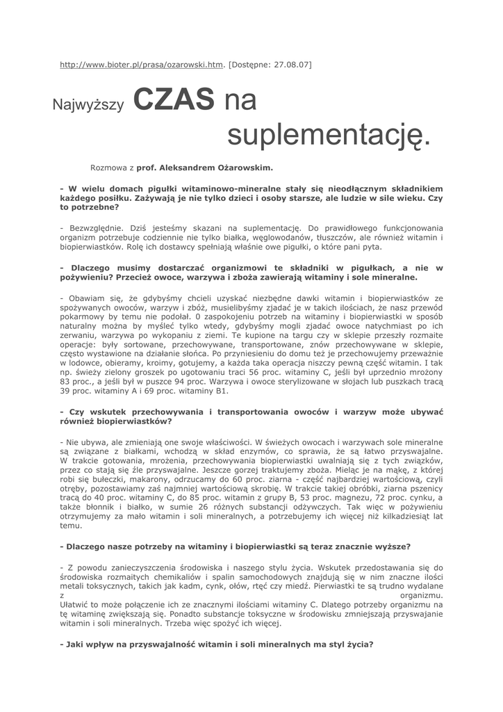 http://www.bioter.pl/prasa/ozarowski.htm. [Dostępne: 27.08.07] Najwyższy CZAS na suplementację. Rozmowa z prof. Aleksandrem Ożarowskim. - W wielu domach pigułki witaminowo-mineralne stały się nieodłącznym składnikiem każdego posiłku. Zażywają je nie tylko dzieci i osoby starsze, ale ludzie w sile wieku. Czy to potrzebne? - Bezwzględnie. Dziś jesteśmy skazani na suplementację. Do prawidłowego funkcjonowania organizm potrzebuje codziennie nie tylko białka, węglowodanów, tłuszczów, ale również witamin i biopierwiastków. Rolę ich dostawcy spełniają właśnie owe pigułki, o które pani pyta. - Dlaczego musimy dostarczać organizmowi te składniki w pigułkach, a nie w pożywieniu? Przecież owoce, warzywa i zboża zawierają witaminy i sole mineralne. - Obawiam się, że gdybyśmy chcieli uzyskać niezbędne dawki witamin i biopierwiastków ze spożywanych owoców, warzyw i zbóż, musielibyśmy zjadać je w takich ilościach, że nasz przewód pokarmowy by temu nie podołał. 0 zaspokojeniu potrzeb na witaminy i biopierwiastki w sposób naturalny można by myśleć tylko wtedy, gdybyśmy mogli zjadać owoce natychmiast po ich zerwaniu, warzywa po wykopaniu z ziemi. Te kupione na targu czy w sklepie przeszły rozmaite operacje: były sortowane, przechowywane, transportowane, znów przechowywane w sklepie, często wystawione na działanie słońca. Po przyniesieniu do domu też je przechowujemy przeważnie w lodowce, obieramy, kroimy, gotujemy, a każda taka operacja niszczy pewną część witamin. I tak np. świeży zielony groszek po ugotowaniu traci 56 proc. witaminy C, jeśli był uprzednio mrożony 83 proc., a jeśli był w puszce 94 proc. Warzywa i owoce sterylizowane w słojach lub puszkach tracą 39 proc. witaminy A i 69 proc. witaminy B1. - Czy wskutek przechowywania i transportowania owoców i warzyw może ubywać również biopierwiastków? - Nie ubywa, ale zmieniają one swoje właściwości. W świeżych owocach i warzywach sole mineralne są związane z białkami, wchodzą w skład enzymów, co sprawia, że są łatwo przyswajalne. W trakcie gotowania, mrożenia, przechowywania biopierwiastki uwalniają się z tych związków, przez co stają się źle przyswajalne. Jeszcze gorzej traktujemy zboża. Mieląc je na mąkę, z której robi się bułeczki, makarony, odrzucamy do 60 proc. ziarna - część najbardziej wartościową, czyli otręby, pozostawiamy zaś najmniej wartościową skrobię. W trakcie takiej obróbki, ziarna pszenicy tracą do 40 proc. witaminy C, do 85 proc. witamin z grupy B, 53 proc. magnezu, 72 proc. cynku, a także błonnik i białko, w sumie 26 różnych substancji odżywczych. Tak więc w pożywieniu otrzymujemy za mało witamin i soli mineralnych, a potrzebujemy ich więcej niż kilkadziesiąt lat temu. - Dlaczego nasze potrzeby na witaminy i biopierwiastki są teraz znacznie wyższe? - Z powodu zanieczyszczenia środowiska i naszego stylu życia. Wskutek przedostawania się do środowiska rozmaitych chemikaliów i spalin samochodowych znajdują się w nim znaczne ilości metali toksycznych, takich jak kadm, cynk, ołów, rtęć czy miedź. Pierwiastki te są trudno wydalane z organizmu. Ułatwić to może połączenie ich ze znacznymi ilościami witaminy C. Dlatego potrzeby organizmu na tę witaminę zwiększają się. Ponadto substancje toksyczne w środowisku zmniejszają przyswajanie witamin i soli mineralnych. Trzeba więc spożyć ich więcej. - Jaki wpływ na przyswajalność witamin i soli mineralnych ma styl życia? - Zmniejsza przyswajalność wiele czynników: palenie tytoniu, picie alkoholu i nadmiernych ilości kawy lub mocnej herbaty, niedobór błonnika w pokarmie, nadmiar wolnych rodników nadtlenowych we krwi, osłabienie układu odpornościowego, siedzący tryb życia. To wszystko sprawia, że dla zaspokojenia potrzeb organizmu musimy spożywać więcej witamin i biopierwiastk6w. - Czy wyliczono te potrzeby? Czy są one różne w poszczególnych krajach, w grupach ludzi prowadzących odmienny tryb życia? - W większości kraj6w europejskich opracowano specjalne normy - standardy. Zajmowali się tym wybitni naukowcy, np. w USA - noblista Shari Liberman, w Polsce prof. Jerzy Woy -Wojciechowski. Standardy nie są normą obowiązującą, ale pomagają lekarzowi i przemysłowi farmaceutycznemu produkującemu wieloskładnikowe preparaty witaminowo-mineralne. Choć każdy kraj opracowuje własne standardy, są one podobne. Polska farmakopea także zaleca dawki podobne do zachodnioeuropejskich i amerykańskich. - Jakie dawki witamin i bio-pierwiastków zalecają światowe standardy? - Nie ma dawek najlepszych dla wszystkich. Inne są potrzeby zdrowego człowieka, inne -chorego. Kimże jest jednak człowiek zdrowy? Przy dokładniejszym badaniu okazuje się, że nie ma osób doskonale zdrowych. Prawie każdy ma jakieś odchylenia. - Większość z nas jednak prawidłowo funkcjonuje, czuje się zdrowa, nie skarży się na jakieś niepokojące dolegliwości. Jakie są objawy niedoboru witamin i biopierwiastków? - Organizm wykazuje olbrzymią tolerancję na niedobór witamin i biopierwiastków. Jak np. dopiero po 200 dniach niedoboru witaminy B1 występują anatomiczne objawy - m.in. porażenie nerwowe. Co nie znaczy, że organizm wcześniej nie sygnalizuje niedoboru czy zakłócenia proporcji między poszczególnymi witaminami czy biopierwiastkami. Dopóki jednak te nieprawidłowości nie są wielkie, objawy też są mało zauważalne i nie zwracamy na nie uwagi. Zanim dojdzie do porażenia nerwowego przy przewlekłym braku witaminy B1 występuje chudnięcie, brak apetytu, bezsenność, drażliwość. Z biegiem czasu objawy się nasilają i powodują coraz bardziej nieprzyjemne skutki. - Jakie badania wykazują niedobór poszczeg6lnych witamin czy soli mineralnych? - Aby się przekonać, jakich witamin czy biopierwiastków nam brakuje, a jakie występują w niewłaściwych proporcjach, najlepiej wykonać analizę w