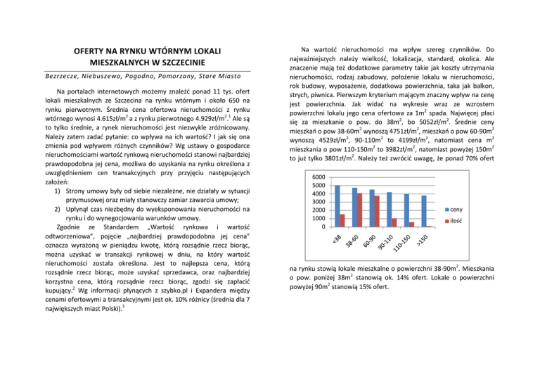 OFERTY NA RYNKU WTÓRNYM LOKALI MIESZKALNYCH W SZCZECINIE Bezrzecze, Niebuszewo, Pogodno, Pomorzany, Stare Miasto Na portalach internetowych możemy znaleźć ponad 11 tys. ofert lokali mieszkalnych ze Szczecina na rynku wtórnym i około 650 na rynku pierwotnym. Średnia cena ofertowa nieruchomości z rynku wtórnego wynosi 4.615zł/m2 a z rynku pierwotnego 4.929zł/m2.1 Ale są to tylko średnie, a rynek nieruchomości jest niezwykle zróżnicowany. Należy zatem zadać pytanie: co wpływa na ich wartość? I jak się ona zmienia pod wpływem różnych czynników? Wg ustawy o gospodarce nieruchomościami wartość rynkową nieruchomości stanowi najbardziej prawdopodobna jej cena, możliwa do uzyskania na rynku określona z uwzględnieniem cen transakcyjnych przy przyjęciu następujących założeń: 1) Strony umowy były od siebie niezależne, nie działały w sytuacji przymusowej oraz miały stanowczy zamiar zawarcia umowy; 2) Upłynął czas niezbędny do wyeksponowania nieruchomości na rynku i do wynegocjowania warunków umowy. Zgodnie ze Standardem „Wartość rynkowa i wartość odtworzeniowa”, pojęcie „najbardziej prawdopodobna jej cena” oznacza wyrażoną w pieniądzu kwotę, którą rozsądnie rzecz biorąc, można uzyskać w transakcji rynkowej w dniu, na który wartość nieruchomości została określona. Jest to najlepsza cena, którą rozsądnie rzecz biorąc, może uzyskać sprzedawca, oraz najbardziej korzystna cena, którą rozsądnie rzecz biorąc, zgodzi się zapłacić kupujący.2 Wg informacji płynących z szybko.pl i Expandera między cenami ofertowymi a transakcyjnymi jest ok. 10% różnicy (średnia dla 7 największych miast Polski).3 Na wartość nieruchomości ma wpływ szereg czynników. Do najważniejszych należy wielkość, lokalizacja, standard, okolica. Ale znaczenie mają też dodatkowe parametry takie jak koszty utrzymania nieruchomości, rodzaj zabudowy, położenie lokalu w nieruchomości, rok budowy, wyposażenie, dodatkowa powierzchnia, taka jak balkon, strych, piwnica. Pierwszym kryterium mającym znaczny wpływ na cenę jest powierzchnia. Jak widać na wykresie wraz ze wzrostem powierzchni lokalu jego cena ofertowa za 1m2 spada. Najwięcej płaci się za mieszkanie o pow. do 38m2, bo 5052zł/m2. Średnie ceny mieszkań o pow 38-60m2 wynoszą 4751zł/m2, mieszkań o pow 60-90m2 wynoszą 4529zł/m2, 90-110m2 to 4199zł/m2, natomiast cena m2 mieszkania o pow 110-150m2 to 3982zł/m2, natomiast powyżej 150m2 to już tylko 3801zł/m2. Należy też zwrócić uwagę, że ponad 70% ofert 6000 5000 4000 3000 2000 1000 0 ceny ilość na rynku stowią lokale mieszkalne o powierzchni 38-90m2. Mieszkania o pow. poniżej 38m2 stanowią ok. 14% ofert. Lokale o powierzchni powyżej 90m2 stanowią 15% ofert. Kolejnym istotnym kryterium jest liczba pokoi. Tu również najwięcej jest ofert z drugiej i trzeciej grupy – 2 i 3 pokojowe Podsumowując najdroższe są nieruchomości na Starym Mieście o pow. do 60m2 – ponad 5800zł/m2, a najtańsze są mieszkania powyżej 110m2 na Pomorzanach – poniżej 3300zł/m2. 6000 5000 MARTA STRZAŁKOWSKA 4000 3000 cena 2000 ilość 1000 1 0 2 1 2 3 4 5 >5 mieszkania stanowią po 36% ofert. Mieszkań jednopokojowych jest 10%, natomiast lokale posiadające więcej niż trzy pokoje stanowią 19% ofert. Najdroższe są mieszkania jednopokojowe – 5041zł/m2. Lokale 2 i 3 pokojowe kosztują odpowiednio 4789zł/m2 i 4519zł/m2. Im więcej pokoi tym cena m2 jest niższa. Jednak najważniejszym czynnikiem jest lokalizacja. Najbardziej od średniej ceny m2 w Szczecinie odchylają się ceny na Bezrzeczu. Średnie ceny mieszkań na Bezczeczu są o 821zł/m2 wyższe. Również dużo – bo o 758zł/m2 ponad średnią Szczecina sięgają ceny mieszkań na Starym Mieście. Ponieżej średniej są natomiast ceny na Niebuszewie – o 171zł/m2 mniej. Najbliżej średniej kształtują się ceny nieruchomości na Pomorzanach – są średnio 47zł/m2 wyższe. Ofert nieruchomości z dzielnic najdroższych jest jednocześnie najmniej. Z Bezrzecza - 115, a ze Starego Miasta - 90. Najwięcej natomiast jest ofert dotyczączych mieszkań zlokalizowanych na Pogodnie – ponad 900 i Niebuszewie – 830. http://www.otodom.pl, http://www.gratka.pl – 15.11.2011 Nieruchomości. Zagadnienia prawne. Red. Helena Kisilowska. LexisNexis, Warszawa 2009 3 http://raport.szybko.pl/styczniwe-ceny-ofertowe-i-transakcyjne - 15.11.2011