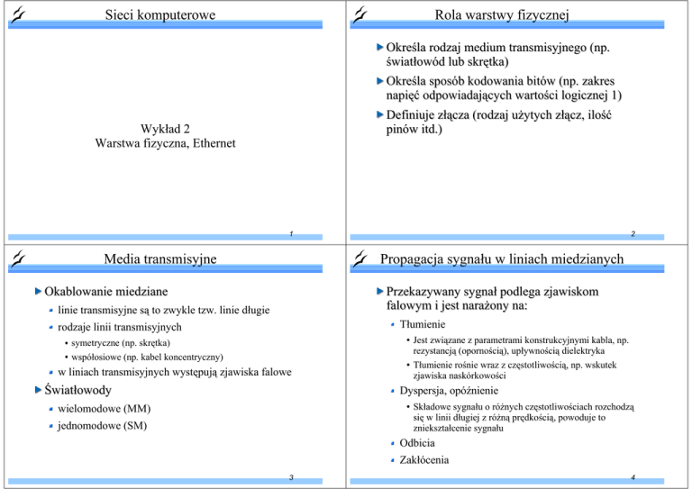 Sieci komputerowe Rola warstwy fizycznej Media transmisyjne