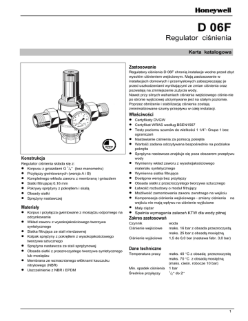D 06F Regulator ciśnienia Karta katalogowa Zastosowanie Regulatory ciśnienia D 06F chronią instalacje wodne przed zbyt wysokim ciśnieniem wejściowym. Mają zastosowanie w instalacjach domowych i przemysłowych zabezpieczając je przed uszkodzeniami wynikającymi ze zmian ciśnienia oraz pozwalają na zmniejszenie zużycia wody. Nawet przy silnych wahaniach ciśnienia wejściowego ciśnie-nie po stronie wyjściowej utrzymywane jest na stałym poziomie. Poprzez obniżenie i stabilizację ciśnienia zostają zminimalizowane szumy przepływu w całej instalacji. Właściwości Konstrukcja Regulator ciśnienia składa się z: Korpusu z gniazdami G 1/4” (bez manometru) Przyłączy gwintowanych (wersja A i B) Kompletnego wkładu zaworu z membraną i gniazdem Siatki filtrującej 0,16 mm Pokrywy sprężyny z pokrętłem i skalą Obsady siatki Sprężyny nastawczej Materiały Korpus i przyłącza gwintowane z mosiądzu odpornego na odcynkowanie Wkład zaworu z wysokojakościowego tworzywa syntetycznego Siatka filtrująca ze stali nierdzewnej Kołpak sprężyny z pokrętłem z wysokojakościowego tworzywa sztucznego Sprężyna nastawcza ze stali sprężynowej Obsada siatki z przezroczystego tworzywa syntetycznego lub mosiądzu Membrana ze wzmacnianego włóknami kauczuku nitrylowego (NBR) Uszczelnienie z NBR i EPDM Certyfikaty DVGW Certyfikat WRAS według BSEN1567 Testy poziomu szumów do wielkości 1 1/4”- Grupa 1 bez ograniczeń Nastawianie ciśnienia za pomocą pokrętła Wartość zadana odczytywana bezpośrednio na podziałce pokrętła Sprężyna nastawcza znajduje się poza obszarem przepływu wody Wymienny wkład zaworu z wysokojakościowego materiału syntetycznego Wymienna siatka filtrująca Dostępna wersja bez przyłączy Obsada siatki z przezroczystego tworzywa sztucznego Łatwość rozbudowy o moduł filtrujący Możliwość zamontowania zaworu zwrotnego na wejściu Kompensacja ciśnienia wejściowego - zmiany ciśnienia na wejściu nie mają wpływu na ciśnienie wyjściowe Mały ciężar Spełnia wymagania zaleceń KTW dla wody pitnej Zakres zastosowań Czynnik Ciśnienie wejściowe Ciśnienie wyjściowe woda maks. 16 bar z obsada przezroczystą maks. 25 bar z obsadą mosiężną 1,5 do 6,0 bar (nastawa fabr. 3,0 bar) Dane techniczne Temperatura pracy Min. spadek ciśnienia Średnice przyłączy maks. 40 C z obsadą przezroczystą maks. 70 C z obsadą mosiężną (maks. cieśn. robocze 10 bar) 1 bar 1 /2” do 2” 1 D06F Regulator ciśnienia Zasada działania Regulator ciśnienia działa na zasadzie równowagi sił działających na membranę: z jednej strony wynikającej z napięcia sprężyny, a z drugiej strony sił parcia od ciśnienia po redukcji. W przypadku występowania zmiennego ciśnienia wejściowego ruchomy wkład zaworu ustawia się w nowe położenie równowagi dla danej nastawy ciśnienia i ilości odbieranej wody (kompensacja ciśnienia wejściowego). W przypadku ustania poboru wody - zawór całkowicie się domyka. H Oznaczenia: D 06F -...A = z przyłączami gwintowanymi i przezroczystą obsadą siatki - do 40 C D 06F -...B = z przyłączami gwintowanymi i mosiężną obsadą siatki - do 70 C D 06F -...E = bez przyłączy, z przezroczystą obsadą siatki do 40 C h D I L Wielkość przyłącza R Wersje specjalne na życzenie Wielkości przyłączy R 1 /2 ” 3 /4 ” 1” 1 1 /4 ” 1 1 /2 ” 2” Wielkość nominalna DN 15 20 25 32 40 50 Ciężar (w przybliżeniu) Wymiary (kg) (mm) L I H h D 0,8 1,0 1,4 2,0 3,3 4,5 140 80 89 58 54 160 90 89 58 54 180 100 111 64 61 200 105 111 64 61 225 130 173 126 82 255 140 173 126 82 2,4 3,1 5,8 5,9 12,6 12,0 Wartość kvs Certyfikat DVGW DW-6330AT2314 Akcesoria 42 FN 09S Filtr przezbrajalny Drobnosiatkowy filtr z płukaniem wstecznym do rozbudowy do stacji wodnej dla regulatorów ciśnienia D06F M 07M Manometr Obudowa 63mm, przyłącze tylne G 1/4" Zakresy: 0-4; 0-10; 0-16; 0-25 bar Przy zamówieniu należy podać zakres ZR 06K Dwustronny klucz oczkowy Do demontażu obsady siatki i pokrywy sprężyny, dla wielkości R 1/2” - 2” RV 277 Zawór zwrotny Dla D 06F wielkości R 1/2" do 2" VST 06 Przyłącza Z końcówkami gwintowanymi lub do lutowania A = z końcówką gwintowaną B = z końcówką do lutowania D06F Regulator ciśnienia Przykład instalacji Wielkości przyłączy W* * R DN mm 1 /2 ” 15 55 3 /4 ” 20 55 1” 25 55 1 1 /4 ” 32 60 1 1 /2 ” 40 70 2” 50 70 Minimalna odległość od ściany do osi przewodu Zasady instalacji Montować na poziomym odcinku instalacji z obsadą siatki skierowaną ku dołowi Zamontowanie zaworów odcinających Urządzenia o niskim ciśnieniu roboczym powinny być chronione zaworami bezpieczeństwa Lokalizacja powinna zapewnić ochronę przed mrozem oraz łatwy dostęp: Tak aby manometr był dobrze widoczny Przy przezroczystej obsadzie siatki można łatwo określić stopień jej zanieczyszczenia Łatwo przprowadzić serwis i kontrolę W domowej instalacji przed regulatorem należy montować filtr drobnosiatkowy (dodatkowe zabezpieczenie przed zanieczyszczeniami) Zalecany jest prosty odcinek rury za regulatorem o długości conajmniej 5 razy większej od średnicy nominalnej (zgodnie z DIN 1988, część 5) Typowe zastosowania Regulatory ciśnienia typu D 06F są przeznaczone do wszystkich typów domowych instalacji wodnych. Mogą być montowane również w instalacjach przemysłowych zgodnie ze swoim przeznaczeniem i z uwzględnieniem parametrów technicznych. Regulator ciśnienia D 06F powinien być instalowany: Gdy ciśnienie statyczne przekracza maksymalne, dopuszczalne ciśnienie w instalacji W celu obniżenia poziomu hałasu, gdy ciśnienie w miejscach poboru przekracza 5,0 bar W przypadku podziału instalacji na strefy ciśnienia np. na każdym piętrze budynku wielopiętrowego Gdy należy unikać zmian ciśnienia w instalacji Gdy w instalacji znajdują się urządzenia, które muszą być chronione przed nadmiernym ciśnieniem zasilania Wykres wartości kvs 3 D06F R
