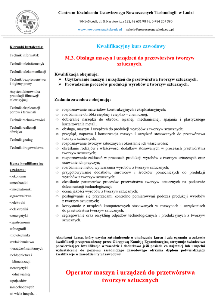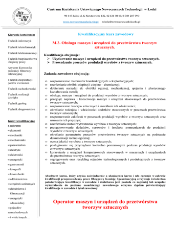 Centrum Kształcenia Ustawicznego Nowoczesnych Technologii w Łodzi 90-145 Łódź, ul. G. Narutowicza 122, 42 631 98 48, 0-784 207 390 www.nowoczesnaszkola.edu.pl Kwalifikacyjny kurs zawodowy Kierunki kształcenia: Technik informatyk M.3. Obsługa maszyn i urządzeń do przetwórstwa tworzyw sztucznych. Technik teleinformatyk Technik telekomunikacji [email protected] Technik bezpieczeństwa i higieny pracy Kwalifikacja obejmuje: Użytkowanie maszyn i urządzeń do przetwórstwa tworzyw sztucznych. Prowadzenie procesów produkcji wyrobów z tworzyw sztucznych. Asystent kierownika produkcji filmowej/ telewizyjnej Zadania zawodowe obejmują: Technik eksploatacji portów i terminali Technik rachunkowości Technik realizacji dźwięku Technik geolog Technik drogownictwa • • • • • • • • Kursy kwalifikacyjne z zakresu: • ekonomii • • • mechaniki • • mechatroniki • • • gazownictwa • elektryki • elektroniki • energetyki • gastronomii • • rozpoznawanie materiałów konstrukcyjnych i eksploatacyjnych; rozróżnianie obróbki cieplnej i cieplno – chemicznej; dobieranie narzędzi do obróbki ręcznej, mechanicznej, spajania i plastycznego kształtowania metali; obsługa, maszyn i urządzeń do produkcji wyrobów z tworzyw sztucznych; przegląd, naprawa i konserwacja maszyn i urządzeń stosowanych do przetwórstwa tworzyw sztucznych; rozpoznawanie tworzyw sztucznych i określanie ich właściwości; określanie rodzajów i właściwości dodatków stosowanych w procesach przetwórstwa tworzyw sztucznych; rozpoznawanie zakłóceń w procesach produkcji wyrobów z tworzyw sztucznych oraz usuwanie ich przyczyn; rozróżnianie metod wytwarzania wyrobów z tworzyw sztucznych; przygotowywanie dodatków, surowców i środków pomocniczych do produkcji wyrobów z tworzyw sztucznych; określanie parametrów procesów przetwórstwa tworzyw sztucznych na podstawie dokumentacji technologicznej; ocena jakości wyrobów z tworzyw sztucznych; posługiwanie się przyrządami kontrolno pomiarowymi podczas produkcji wyrobów z tworzyw sztucznych; korzystanie z urządzeń komputerowych stosowanych w maszynach i urządzeniach do przetwórstwa tworzyw sztucznych; segregowanie oraz recykling odpadów technologicznych i produkcyjnych z tworzyw sztucznych. • fotografii • fototechniki • włókiennictwa • urządzeń sanitarnych • chłodnictwa i Absolwent kursu, który uzyska zaświadczenie o ukończeniu kursu i zda egzamin w zakresie kwalifikacji przeprowadzany przez Okręgową Komisję Egzaminacyjną otrzymuje świadectwo potwierdzające kwalifikacje w zawodzie i dodatkowo jeśli posiada co najmniej lub uzupełni wykształcenie do poziomu zasadniczego zawodowego otrzyma dyplom potwierdzający kwalifikacje w zawodzie i tytuł zawodowy klimatyzacji • energetyki odnawialnej • pojazdów samochodowych • i wiele innych… Operator maszyn i urządzeń do przetwórstwa tworzyw sztucznych OPERATOR MASZYN I URZĄDZEŃ DO PRZETWÓRSTWA TWORZYW SZTUCZNYCH M.3. Obsługa maszyn i urządzeń do przetwórstwa tworzyw sztucznych