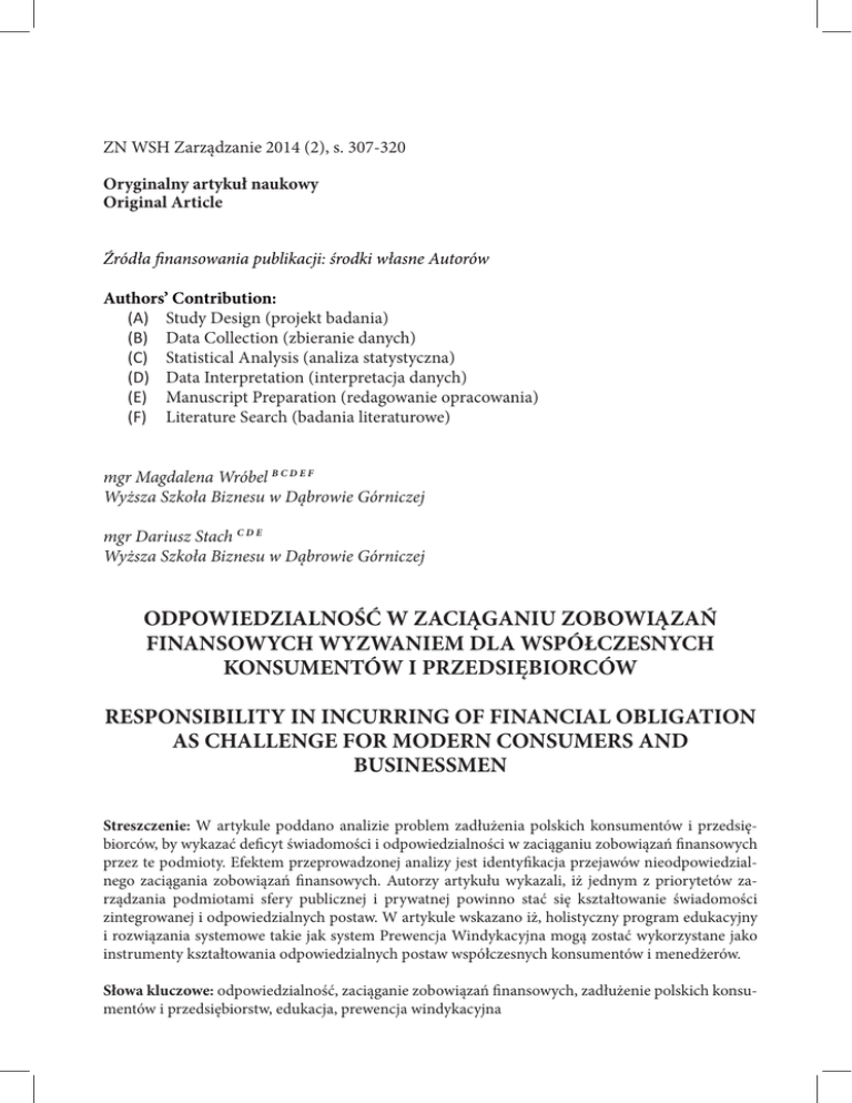 ZN WSH Zarządzanie 2014 (2), s. 307-320 Oryginalny artykuł naukowy Original Article Źródła finansowania publikacji: środki własne Autorów Authors’ Contribution: (A) Study Design (projekt badania) (B) Data Collection (zbieranie danych) (C) Statistical Analysis (analiza statystyczna) (D) Data Interpretation (interpretacja danych) (E) Manuscript Preparation (redagowanie opracowania) (F) Literature Search (badania literaturowe) mgr Magdalena Wróbel B C D E F Wyższa Szkoła Biznesu w Dąbrowie Górniczej mgr Dariusz Stach C D E Wyższa Szkoła Biznesu w Dąbrowie Górniczej ODPOWIEDZIALNOŚĆ W ZACIĄGANIU ZOBOWIĄZAŃ FINANSOWYCH WYZWANIEM DLA WSPÓŁCZESNYCH KONSUMENTÓW I PRZEDSIĘBIORCÓW RESPONSIBILITY IN INCURRING OF FINANCIAL OBLIGATION AS CHALLENGE FOR MODERN CONSUMERS AND BUSINESSMEN Streszczenie: W artykule poddano analizie problem zadłużenia polskich konsumentów i przedsiębiorców, by wykazać deficyt świadomości i odpowiedzialności w zaciąganiu zobowiązań finansowych przez te podmioty. Efektem przeprowadzonej analizy jest identyfikacja przejawów nieodpowiedzialnego zaciągania zobowiązań finansowych. Autorzy artykułu wykazali, iż jednym z priorytetów zarządzania podmiotami sfery publicznej i prywatnej powinno stać się kształtowanie świadomości zintegrowanej i odpowiedzialnych postaw. W artykule wskazano iż, holistyczny program edukacyjny i rozwiązania systemowe takie jak system Prewencja Windykacyjna mogą zostać wykorzystane jako instrumenty kształtowania odpowiedzialnych postaw współczesnych konsumentów i menedżerów. Słowa kluczowe: odpowiedzialność, zaciąganie zobowiązań finansowych, zadłużenie polskich konsumentów i przedsiębiorstw, edukacja, prewencja windykacyjna 308 Zeszyty Naukowe Wyższej Szkoły Humanitas. Zarządzanie Summary: In the article a problem of the debt of Polish consumers and entrepreneurs was analysed in order to show the deficit of the awareness and the deficit of the responsibility in contracting financial liabilities by these entities. An identification of signs of irresponsible contracting financial liabilities is an effect of the conducted analysis. Authors of the article showed that forming the integrated awareness and responsible conducts should become one of priorities of managing subjects of the public and private sphere. They indicated in the article that holistic educational program and system solutions such as the system of Vindication Prevention may be used as instruments of responsible attitudes of modern consumers and managers. Key words: responsibility, incurring of financial obligation, debt of Polish consumers and entrepreneurs, education, Vindication Prevention Wstęp Analizując dane statystyczne dotyczące zadłużenia polskich konsumentów i przedsiębiorstw, można zauważyć, iż terminowe regulowanie zaciągniętych zobowiązań finansowych stanowi realny problem. Problem braku odpowiedzialności finansowej konsumentów nie dotyczy jednak wyłącznie relacji bank – klient, bowiem Polacy w coraz większym stopniu mają problemy z terminowym regulowaniem swoich bieżących zobowiązań nie tylko wobec dostawców usług masowych. W przypadku przedsiębiorców należy stwierdzić, iż samo zadłużanie nie jest niekorzystnym zjawiskiem, bowiem zaciągnięty dług może motywować menedżerów do takich decyzji zarządczych, które pozwolą na wypracowanie zysku umożliwiającego spłatę zobowiązań finansowych. Istotne jest to, aby zaciąganie zobowiązań finansowych było poprzedzone wieloaspektowymi analizami stanu przedsiębiorstwa, a także by proces ten cechowała odpowiedzialność. Należy bowiem zdawać sobie sprawę z tego, iż system finansowy jest skonstruowany w oparciu o gęsty i rozległy układ połączeń sieciowych, więc skutki nieodpowiedzialnych działań poszczególnych podmiotów dotykają całego systemu. W związku z tym niezwykle istotne jest zapobieganie tym problemom u źródła poprzez stosowanie działań edukacyjnych i rozwiązań systemowych. Kategorię „odpowiedzialność” można zdefiniować jako „obowiązek moralny lub prawny nakazujący odpowiadanie za swoje czyny oraz ponoszenie ich konsekwencji”1. Zatem przez odpowiedzialność w zaciąganiu zobowiązań finansowych należy rozumieć proces zaciągania zobowiązań finansowych przez konsumentów i przedsiębiorców, którzy są świadomi konieczności i gotowi do ponoszenia konsekwencji swych działań, czyli moralnego i prawnego obowiązku spłaty swoich zobowiązań. W artykule przyjęto hipotezę, że w obliczu współczesnych przejawów braku odpowiedzialności w zaciąganiu zobowiązań finansowych przez konsumentów i przedsiębiorców konieczne staje się upowszechnienie działań edukacyjnych i rozwiązań systemowych po to, aby ex ante zapobiegać zjawisku nadmiernego i nieracjonalnego zadłużania. Celem artykułu jest analiza polityki kredytowej banków w latach 2007–2013, analiza zadłużenia polskich konsumentów w latach 2007–2013 sporządzona na podstawie raportów InfoDług, analiza zadłużenia polskich przedsiębiorstw, a także określenie zestawu działań kształtujących odpowiedzialne postawy konsumentów i przedsiębiorców w zakresie regulowania zobowiązań finansowych. H. Zgółkowa (red.), Praktyczny słownik współczesnej polszczyzny, tom 25, Wydawnictwo Kurpisz, Poznań 2000, s. 415. 1 Odpowiedzialność w zaciąganiu zobowiązań finansowych wyzwaniem... 309 1. Analiza polityki kredytowej banków i zadłużenia polskich konsumentów Kwartalne Raporty Departamentu Systemu Finansowego NBP Sytuacja na rynku kredytowym, które powstają na podstawie badań ankietowych przeprowadzanych wśród przewodniczących komitetów kredytowych kilkudziesięciu największych banków działających na polskim rynku, pozwalają na przeprowadzenie analizy polityki kredytowej banków. Raporty z ostatnich 7 lat wskazują, że następuje systematyczne zaostrzanie kryterió