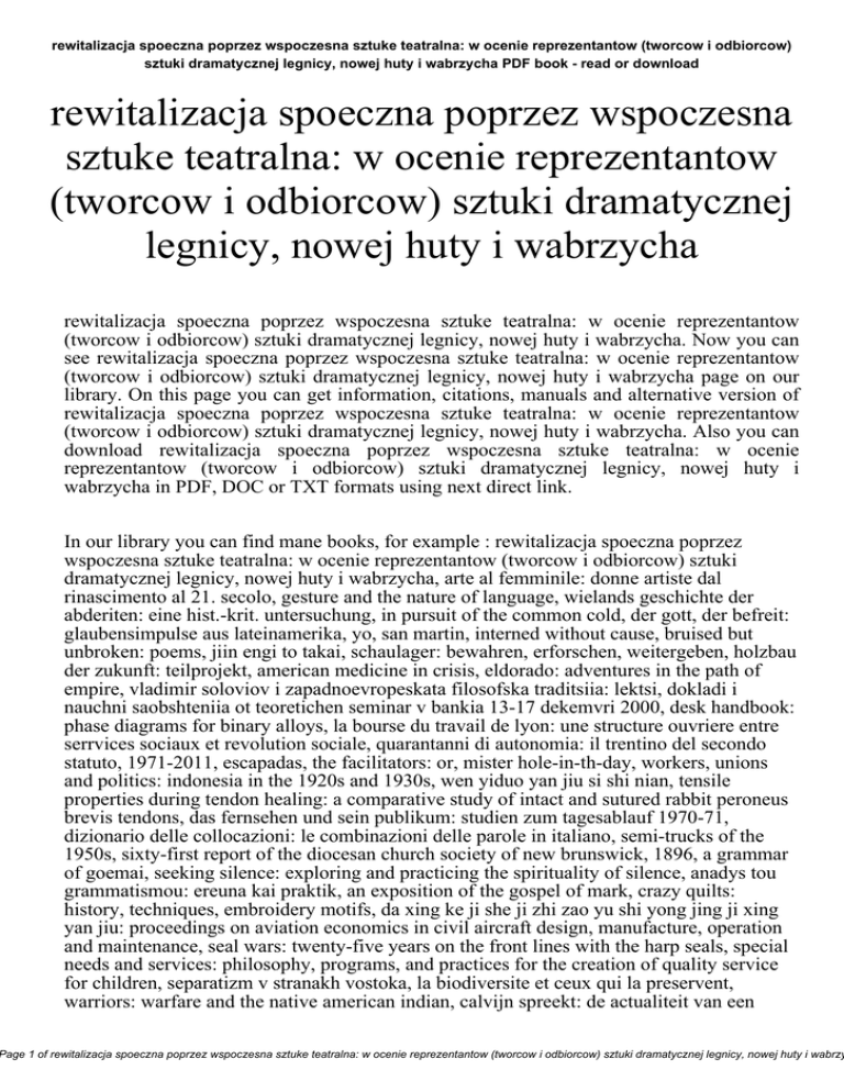 rewitalizacja spoeczna poprzez wspoczesna sztuke teatralna: w ocenie reprezentantow (tworcow i odbiorcow) sztuki dramatycznej legnicy, nowej huty i wabrzycha PDF book - read or download rewitalizacja spoeczna poprzez wspoczesna sztuke teatralna: w ocenie reprezentantow (tworcow i odbiorcow) sztuki dramatycznej legnicy, nowej huty i wabrzycha rewitalizacja spoeczna poprzez wspoczesna sztuke teatralna: w ocenie reprezentantow (tworcow i odbiorcow) sztuki dramatycznej legnicy, nowej huty i wabrzycha. Now you can see rewitalizacja spoeczna poprzez wspoczesna sztuke teatralna: w ocenie reprezentantow (tworcow i odbiorcow) sztuki dramatycznej legnicy, nowej huty i wabrzycha page on our library. On this page you can get information, citations, manuals and alternative version of rewitalizacja spoeczna poprzez wspoczesna sztuke teatralna: w ocenie reprezentantow (tworcow i odbiorcow) sztuki dramatycznej legnicy, nowej huty i wabrzycha. Also you can download rewitalizacja spoeczna poprzez wspoczesna sztuke teatralna: w ocenie reprezentantow (tworcow i odbiorcow) sztuki dramatycznej legnicy, nowej huty i wabrzycha in PDF, DOC or TXT formats using next direct link. In our library you can find mane books, for example : rewitalizacja spoeczna poprzez wspoczesna sztuke teatralna: w ocenie reprezentantow (tworcow i odbiorcow) sztuki dramatycznej legnicy, nowej huty i wabrzycha, arte al femminile: donne artiste dal rinascimento al 21. secolo, gesture and the nature of language, wielands geschichte der abderiten: eine hist.-krit. untersuchung, in pursuit of the common cold, der gott, der befreit: glaubensimpulse aus lateinamerika, yo, san martin, interned without cause, bruised but unbroken: poems, jiin engi to takai, schaulager: bewahren, erforschen, weitergeben, holzbau der zukunft: teilprojekt, american medicine in crisis, eldorado: adventures in the path of empire, vladimir soloviov i zapadnoevropeskata filosofska traditsiia: lektsi, dokladi i nauchni saobshteniia ot teoretichen seminar v bankia 13-17 dekemvri 2000, desk handbook: phase diagrams for binary alloys, la bourse du travail de lyon: une structure ouvriere entre serrvices sociaux et revolution sociale, quarantanni di autonomia: il trentino del secondo statuto, 1971-2011, escapadas, the facilitators: or, mister hole-in-th-day, workers, unions and politics: indonesia in the 1920s and 1930s, wen yiduo yan jiu si shi nian, tensile properties during tendon healing: a comparative study of intact and sutured rabbit peroneus brevis tendons, das fernsehen und sein publikum: studien zum tagesablauf 1970-71, dizionario delle collocazioni: le combinazioni delle parole in italiano, semi-trucks of the 1950s, sixty-first report of the diocesan church society of new brunswick, 1896, a grammar of goemai, seeking silence: exploring and practicing the spirituality of silence, anadys tou grammatismou: ereuna kai praktik, an exposition of the gospel of mark, crazy quilts: history, techniques, embroidery motifs, da xing ke ji she ji zhi zao yu shi yong jing ji xing yan jiu: proceedings on aviation economics in civil aircraft design, manufacture, operation and maintenance, seal wars: twenty-five years on the front lines with the harp seals, special needs and services: philosophy, programs, and practices for the creation of quality service for children, separatizm v stranakh vostoka, la biodiversite et ceux qui la preservent, warriors: warfare and the native american indian, calvijn spreekt: de actualiteit van een Page 1 of rewitalizacja spoeczna poprzez wspoczesna sztuke teatralna: w ocenie reprezentantow (tworcow i odbiorcow) sztuki dramatycznej legnicy, nowej huty i wabrzy rewitalizacja spoeczna poprzez wspoczesna sztuke teatralna: w ocenie reprezentantow (tworcow i odbiorcow) sztuki dramatycznej legnicy, nowej huty i wabrzycha PDF book - read or download hervormer na 500 jaar, erste hilfe am hund, rewitalizacja spoeczna poprzez wspoczesna sztuke teatralna: w ocenie reprezentantow (tworcow i odbiorcow) sztuki dramatycznej legnicy, nowej huty i wabrzycha, all this books you can read on our site or download in PDF - rewitalizacja spoeczna poprzez wspoczesna sztuke teatralna: w ocenie reprezentantow (tworcow i odbiorcow) sztuki dramatycznej legnicy, nowej huty i wabrzycha, DOC - rewitalizacja spoeczna poprzez wspoczesna sztuke teatralna: w ocenie reprezentantow (tworcow i odbiorcow) sztuki dramatycznej legnicy, nowej huty i wabrzycha or TXT - rewitalizacja spoeczna poprzez wspoczesna sztuke teatralna: w ocenie reprezentantow (tworcow i odbiorcow) sztuki dramatycznej legnicy, nowej huty i wabrzycha format online. Our catalogue provide simple ways so that you can find a rewitalizacja spoeczna poprzez wspoczesna sztuke teatralna: w ocenie reprezentantow (tworcow i odbiorcow) sztuki dramatycznej legnicy, nowej huty i wabrzycha PDF record digging. And by having our ebooks online or by saving it , you have convenient answers with rewitalizacja spoeczna poprzez wspoczesna sztuke teatralna: w ocenie reprezentantow (tworcow i odbiorcow) sztuki dramatycznej legnicy, nowej huty i wabrzycha. To begin with finding rewitalizacja spoeczna poprzez wspoczesna sztuke teatralna: w ocenie reprezentantow (tworcow i odbiorcow) sztuki dramatycznej legnicy, nowej huty i wabrzycha, you are find our website that includes a comprehensive assortment of rewitalizacja spoeczna poprzez wspoczesna sztuke teatralna: w ocenie reprezentantow (tworcow i odbiorcow) sztuki dramatycznej legnicy, nowej huty i wabrzycha manuals listed. These review site is the biggest of these which may have rewitalizacja spoeczna poprzez wspoczesna sztuke teatralna: w ocenie reprezentantow (tworcow i odbiorcow) sztuki dramatycznej legnicy, nowej huty i wabrzycha, literally hundreds of thousands of different products represented. You will see that there are specific sites catered to different product also types or categories, niche categories or brands related to rewitalizacja spoeczna poprzez wspoczesna sztuke teatralna:
