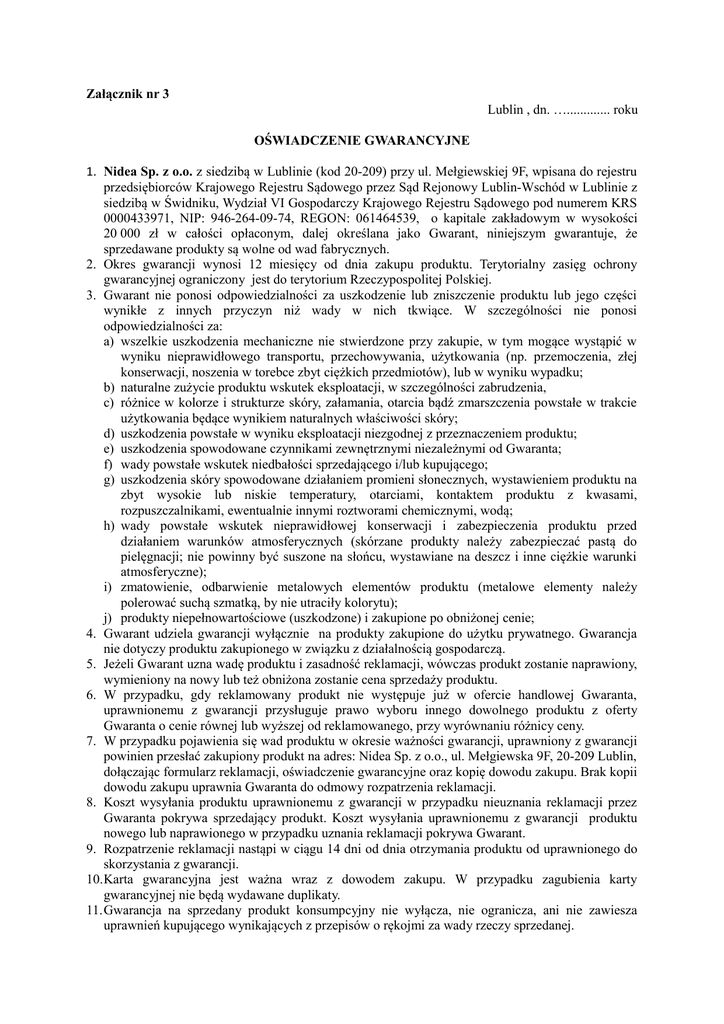 Załącznik nr 3 Lublin , dn. …............. roku OŚWIADCZENIE GWARANCYJNE 1. Nidea Sp. z o.o. z siedzibą w Lublinie (kod 20-209) przy ul. Mełgiewskiej 9F, wpisana do rejestru przedsiębiorców Krajowego Rejestru Sądowego przez Sąd Rejonowy Lublin-Wschód w Lublinie z siedzibą w Świdniku, Wydział VI Gospodarczy Krajowego Rejestru Sądowego pod numerem KRS 0000433971, NIP: 946-264-09-74, REGON: 061464539, o kapitale zakładowym w wysokości 20 000 zł w całości opłaconym, dalej określana jako Gwarant, niniejszym gwarantuje, że sprzedawane produkty są wolne od wad fabrycznych. 2. Okres gwarancji wynosi 12 miesięcy od dnia zakupu produktu. Terytorialny zasięg ochrony gwarancyjnej ograniczony jest do terytorium Rzeczypospolitej Polskiej. 3. Gwarant nie ponosi odpowiedzialności za uszkodzenie lub zniszczenie produktu lub jego części wynikłe z innych przyczyn niż wady w nich tkwiące. W szczególności nie ponosi odpowiedzialności za: a) wszelkie uszkodzenia mechaniczne nie stwierdzone przy zakupie, w tym mogące wystąpić w wyniku nieprawidłowego transportu, przechowywania, użytkowania (np. przemoczenia, złej konserwacji, noszenia w torebce zbyt ciężkich przedmiotów), lub w wyniku wypadku; b) naturalne zużycie produktu wskutek eksploatacji, w szczególności zabrudzenia, c) różnice w kolorze i strukturze skóry, załamania, otarcia bądź zmarszczenia powstałe w trakcie użytkowania będące wynikiem naturalnych właściwości skóry; d) uszkodzenia powstałe w wyniku eksploatacji niezgodnej z przeznaczeniem produktu; e) uszkodzenia spowodowane czynnikami zewnętrznymi niezależnymi od Gwaranta; f) wady powstałe wskutek niedbałości sprzedającego i/lub kupującego; g) uszkodzenia skóry spowodowane działaniem promieni słonecznych, wystawieniem produktu na zbyt wysokie lub niskie temperatury, otarciami, kontaktem produktu z kwasami, rozpuszczalnikami, ewentualnie innymi roztworami chemicznymi, wodą; h) wady powstałe wskutek nieprawidłowej konserwacji i zabezpieczenia produktu przed działaniem warunków atmosferycznych (skórzane produkty należy zabezpieczać pastą do pielęgnacji; nie powinny być suszone na słońcu, wystawiane na deszcz i inne ciężkie warunki atmosferyczne); i) zmatowienie, odbarwienie metalowych elementów produktu (metalowe elementy należy polerować suchą szmatką, by nie utraciły kolorytu); j) produkty niepełnowartościowe (uszkodzone) i zakupione po obniżonej cenie; 4. Gwarant udziela gwarancji wyłącznie na produkty zakupione do użytku prywatnego. Gwarancja nie dotyczy produktu zakupionego w związku z działalnością gospodarczą. 5. Jeżeli Gwarant uzna wadę produktu i zasadność reklamacji, wówczas produkt zostanie naprawiony, wymieniony na nowy lub też obniżona zostanie cena sprzedaży produktu. 6. W przypadku, gdy reklamowany produkt nie występuje już w ofercie handlowej Gwaranta, uprawnionemu z gwarancji przysługuje prawo wyboru innego dowolnego produktu z oferty Gwaranta o cenie równej lub wyższej od reklamowanego, przy wyrównaniu różnicy ceny. 7. W przypadku pojawienia się wad produktu w okresie ważności gwarancji, uprawniony z gwarancji powinien przesłać zakupiony produkt na adres: Nidea Sp. z o.o., ul. Mełgiewska 9F, 20-209 Lublin, dołączając formularz reklamacji, oświadczenie gwarancyjne oraz kopię dowodu zakupu. Brak kopii dowodu zakupu uprawnia Gwaranta do odmowy rozpatrzenia reklamacji. 8. Koszt wysyłania produktu uprawnionemu z gwarancji w przypadku nieuznania reklamacji przez Gwaranta pokrywa sprzedający produkt. Koszt wysyłania uprawnionemu z gwarancji produktu nowego lub naprawionego w przypadku uznania reklamacji pokrywa Gwarant. 9. Rozpatrzenie reklamacji nastąpi w ciągu 14 dni od dnia otrzymania produktu od uprawnionego do skorzystania z gwarancji. 10.Karta gwarancyjna jest ważna wraz z dowodem zakupu. W przypadku zagubienia karty gwarancyjnej nie będą wydawane duplikaty. 11.Gwarancja na sprzedany produkt konsumpcyjny nie wyłącza, nie ogranicza, ani nie zawiesza uprawnień kupującego wynikających z przepisów o rękojmi za wady rzeczy sprzedanej.