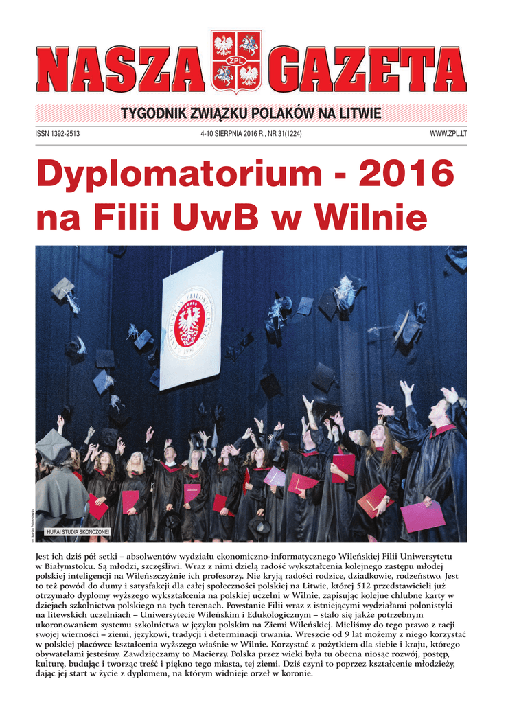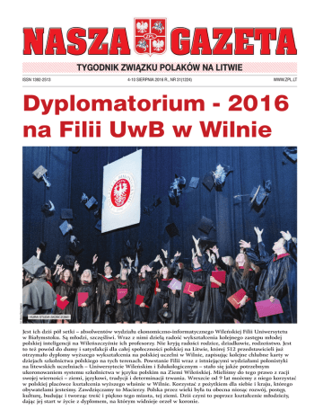 TYGODNIK ZWIĄZKU POLAKÓW NA LITWIE ISSN 1392-2513 4-10 SIERPNIA 2016 R., NR 31(1224) WWW.ZPL.LT fot. Marian Paluszkiewicz Dyplomatorium - 2016 na Filii UwB w Wilnie HURA! STUDIA SKOŃCZONE! Jest ich dziś pół setki – absolwentów wydziału ekonomiczno-informatycznego Wileńskiej Filii Uniwersytetu w Białymstoku. Są młodzi, szczęśliwi. Wraz z nimi dzielą radość wykształcenia kolejnego zastępu młodej polskiej inteligencji na Wileńszczyźnie ich profesorzy. Nie kryją radości rodzice, dziadkowie, rodzeństwo. Jest to też powód do dumy i satysfakcji dla całej społeczności polskiej na Litwie, której 512 przedstawicieli już otrzymało dyplomy wyższego wykształcenia na polskiej uczelni w Wilnie, zapisując kolejne chlubne karty w dziejach szkolnictwa polskiego na tych terenach. Powstanie Filii wraz z istniejącymi wydziałami polonistyki na litewskich uczelniach – Uniwersytecie Wileńskim i Edukologicznym – stało się jakże potrzebnym ukoronowaniem systemu szkolnictwa w języku polskim na Ziemi Wileńskiej. Mieliśmy do tego prawo z racji swojej wierności – ziemi, językowi, tradycji i determinacji trwania. Wreszcie od 9 lat możemy z niego korzystać w polskiej placówce kształcenia wyższego właśnie w Wilnie. Korzystać z pożytkiem dla siebie i kraju, którego obywatelami jesteśmy. Zawdzięczamy to Macierzy. Polska przez wieki była tu obecna niosąc rozwój, postęp, kulturę, budując i tworząc treść i piękno tego miasta, tej ziemi. Dziś czyni to poprzez kształcenie młodzieży, dając jej start w życie z dyplomem, na którym widnieje orzeł w koronie. 2 4-10 sierpnia 2016 r., nr 31(1224) www.zpl.lt Dyplomatorium - 2016 na fot. Marian Paluszkiewicz PIERWSZA PROMOCJA MAGISTRÓW 29 lipca w Domu Polskim w Wilnie odbyło się wręczenie dyplomów licencjackich absolwentom siódmej promocji wydziału ekonomiczno-informatycznego Filii Uniwersytetu w Białymstoku oraz pierwszej promocji magistrów na kierunku europeistyka. Kuźnia specjalistów z zakresu ekonomii i informatyki w ciągu 9 lat wykształciła ponad pół tysiąca młodych inteligentów, którzy w przeważającej większości znajdują zatrudnienie na Litwie. ku wielu lat starań, realizowania inicjatywy akademickiej jako uwieńczenia procesu kształcenia w języku polskim na Litwie. Podwaliny tego sukcesu były zakładane od pierwszych lat niepodległości Litwy poprzez inicjatywę powołania Polskiego Uniwersytetu, kontynuowane przez Universitas Studiorum Polona Vilnensis, współdziałając z Macierzą i przekonując władze Litwy, że polska uczelnia na Litwie ma rację bytu. Dziekan przypomniał o tym, jak przed dziewięciu laty, w 2007 roku, Filia została uprawomocniona na Litwie. Wileńską inicjatywę podjął się zmaterializować Uniwersytet w Białymstoku, zakładając swą filię poza granicami kraju jako pierwsza państwowa uczelnia w Polsce. To było, rzec można, ukoronowaniem dziesięcioletniej działalności samodzielnej uczelni, która powstawała jako filia Uniwersytetu Warszawskiego. Wybrane dwa kierunki – ekonomia i informatyka, na których specjalistów współczesna gospodarka ma dość duże zapotrzebowanie, utworzyły możliwość dać wykształcenie dla 512 młodych ludzi. Obecnie studiuje tu 450 osób. Jak zaznaczył profesor Wołkonowski, w dniu 29 lipca dyplomy otrzyma 36 absolwentów studiów I stopnia i 14 magistrów. Jeszcze pół setki ma szansę otrzymania świadectwa ukończenia uczelni na jesieni, 8 października podczas inauguracji nowego roku akademickiego po pomyślnej obronie prac. Tegoroczna ceremonia wręczania dyplomów, jak zaznaczył, jest szczególna, bowiem obok siódmej promocji informatyków i ekonomistów, kończy studia magisterskie pierwsza promocja europeistyki, którzy specjalizowali się w temacie z ekonomii „Przedsiębiorstwo na wolnym rynku”. I jest to kolejny wspólny sukces Filii i macierzystej uczelni. Jak zaznaczył dziekan, wiedza zdobyta podczas stu- fot. Marian Paluszkiewicz Po raz dziewiąty dziekan wydziału ekonomiczno-informatycznego, profesor Jarosław Wołkonowski wraz z kolegami-profesorami, honorowymi gośćmi w uroczystej atmosferze, której splendoru dodawał poczet sztandarowy, wkraczał na salę DP w Wilnie, by zainaugurować ceremonię wręczania dyplomów kolejnej grupie absolwentów uczelni – młodym Polakom z Wileńszczyzny. Zabierając głos, po przedstawieniu dostojnych gości w osobie prorektora macierzystej uczelni Jerzego Halickiego, dziekan elekta Mieczysławy Zdanowicz, posła nas Sejm RL, prezesa Stowarzyszenia Nauczycieli Szkół Polskich na Litwie „Macierz Szkolna” Józefa Kwiatkowskiego, konsula generalnego wydziału konsularnego Ambasady RP w Wilnie Stanisława Cygnarowskiego, wicekanclerza rządu RL Rimantasa Vaitkusa, prodziekana elekta Mariusza Giero, doradcy premiera Litwy Raimundasa Lopaty, witając rzeszę absolwentów oraz przedstawicieli ich rodzin nie krył zadowolenia, że to już siódma promocja licencjatów i pierwsza magistrów opuszcza Filię, która przed dziewięciu laty powstała w Wilnie w wyni- diów – to kompetencje i kwalifikacje, które mają zapewnić młodym ludziom fundamenty dla przyszłej kariery zawodowej rozpoczynanej dziś. Większość dzisiejszych absolwentów już pracuje. Uczelnia może się szczycić tym, że legitymuje się najniższym poziomem bezrobocia wśród szkół wyższych na Litwie – zaledwie 1 proc. Zdecydowana większość znajduje zatrudnienie na Litwie. Dziekan wyznał, iż to cieszy, bo raczej nie chcą, by młodzież opuszczała kraj, tylko przyczyniła się do podniesienia stopnia wykształcenia miejscowej polskiej społeczności, który, niestety, pozostaje w tyle i tworzyła tu, na Litwie, tzw. klasę średnią, która jest bogactwem dojrzałego społeczeństwa. Profesor zauważył, że pracownicy Filii ciągle śledzą i nadal będą monitorowali koleje kariery swoich absolwentów, do czego ich też zobowiązuje polskie praw
