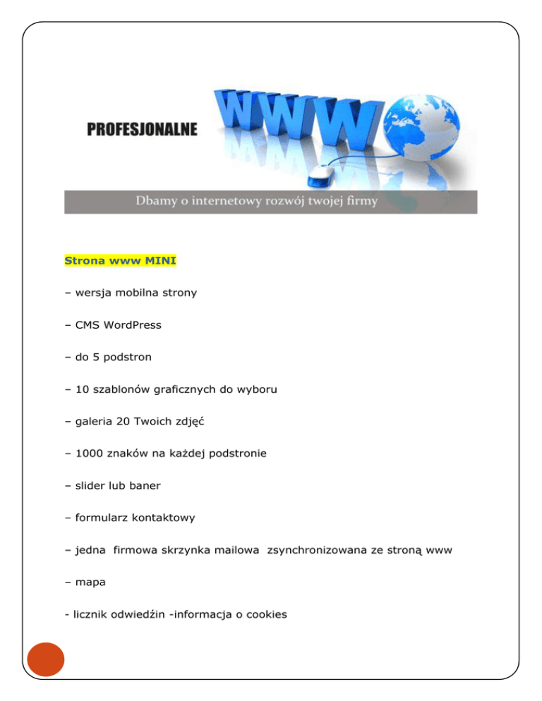 Strona www MINI – wersja mobilna strony – CMS WordPress – do 5 podstron – 10 szablonów graficznych do wyboru – galeria 20 Twoich zdjęć – 1000 znaków na każdej podstronie – slider lub baner – formularz kontaktowy – jedna firmowa skrzynka mailowa zsynchronizowana ze stroną www – mapa - licznik odwiedźin -informacja o cookies Strona www MEDIUM – CMS WordPress /HTML – responsywny szablon – do20 podstron – 30 szablonów graficznych do wyboru – galeria 60 Twoich zdjęć – 1000 znaków na każdej podstronie – slider lub baner – formularz kontaktowy - pięć skrzynek mailowych zsynchronizowanych ze stroną www – mapa - licznik odwiedźin/odsłon – integracja z FB/YOUTUBE www.kamstron.pl – informacja o cookies 2 Strona www MAX – CMS WordPress /HTML – responsywne szablony graficzne – nowoczesne szablony graficzne – strona typu multi-page lub one-page – nieograniczona ilość podstron – galeria Twoich zdjęć – nieograniczona ilość znaków na każdej podstronie – slider lub baner – pliki pdf – formularz kontaktowy - dowolna ilość skrzynek mailowych zsynchronizowanych ze stroną www – mapa - licznik odwiedźin/odsłon/ ilośc osób online w czasie rzeczywistym – integracja z FB/YOUTUBE/TWITTER/…. www.kamstron.pl – informacja o cookies 3 Rozbuduj swoją stronę www Każdy pakiet może zawierać różnego rodzaju elementy programistyczne funkcjonalne, które możesz indywidualnie dopasować do potrzeb swojej firmy : www.kamstron.pl 4 możliwość wykonania profesjonalnej sesji fotograficznej, lub krótkiej prezentacji video twojej firmy przygotowanie profesjonalnej szaty graficznej dostosowanej do charakteru obiektu, firmy, rodzaju imprez lokalizacji, wielkości oraz grupy docelowej. możliwość przygotowania strony w systemie RWD * Slidery/ baner / animacje/ logotyp* możliwość zintegrowania strony www z systemem zarzadzania treścią CMS*, integracja z systemem ekspresowych płatności elektronicznych PayU, optymalizacja strony do dobrej współpracy z wyszukiwarkami internetowymi, możliwość synchronizacji strony z popularnymi systemami wymiany ofert, samodzielne zarządzanie treścią strony internetowej poprzez system CMS*, możliwość przygotowania strony internetowej w kilku wersjach językowych, możliwość wyróżnienia wybranych ofert, możliwość integracji z Facebookiem, youtube, twitter i inne, możliwość integracji z Google Maps, możliwość integracji z systemem do prowadzenia analiz ruchu na stronie internetowej - Google Analytics. możliwość integracji strony z systemami zakupów grupowych, zamieszczenie interaktywnej galerii zdjęć, zamieszczenie formularza zapytań o wolne miejsca,- zamieszczenie formularza rezerwacyjnego miejsc w obiekcie, możliwość integracji strony internetowej systemami do obsługi obiektów turystycznych, możliwość integracji z systemem newsletterowym*, zamieszczenie kalkulatora opłat. samodzielne zarządzanie ofertami nieruchomości, intuicyjna wyszukiwarka nieruchomości z opcjami wyszukiwania podstawowego lub zaawansowanego, możliwość dodawania informacji o nieruchomościach do schowka (notatnika), dostosowanie prezentacji oferty do indywidualnych wymagań biura nieruchomości, wykonanie modułu katalogu Imprez turystycznych, wykonanie modułu do rezerwacji i sprzedaży imprez turystycznych możliwość integracji strony internetowej systemami do wymiany informacji o imprezach, możliwość przygotowania wizualizacji 3D, możliwość opracowania opisów obiektu przez copywritera*, Ze względu na mnogość rozwiązań, ceny stron internetowych są bardzo zróżnicowane. Wycena zatem następuje po wstępnej rozmowie i ustaleniu funkcjonalności. U nas ceny stron internetowych zaczynają się już od kilkuset złotych