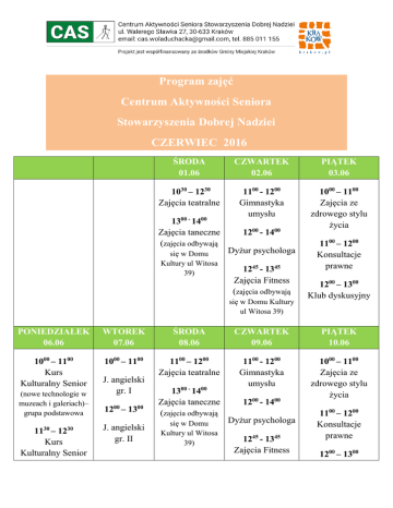 Program zajęć Centrum Aktywności Seniora Stowarzyszenia Dobrej Nadziei CZERWIEC 2016 ŚRODA 01.06 CZWARTEK 02.06 PIĄTEK 03.06 1030 – 1230 Zajęcia teatralne 1100 - 1200 Gimnastyka umysłu 1000 – 1100 Zajęcia ze zdrowego stylu życia 1300 - 1400 Zajęcia taneczne (zajęcia odbywają się w Domu Kultury ul Witosa 39) 1200 - 1400 Dyżur psychologa 1245 - 1345 Zajęcia Fitness (zajęcia odbywają się w Domu Kultury ul Witosa 39) 1100 – 1200 Konsultacje prawne 1200 – 1300 Klub dyskusyjny PONIEDZIAŁEK 06.06 WTOREK 07.06 ŚRODA 08.06 CZWARTEK 09.06 PIĄTEK 10.06 1000 – 1100 Kurs Kulturalny Senior 1000 – 1100 1100 – 1200 Zajęcia teatralne 1100 - 1200 Gimnastyka umysłu 1000 – 1100 Zajęcia ze zdrowego stylu życia (nowe technologie w muzeach i galeriach)– grupa podstawowa 11 – 12 Kurs Kulturalny Senior 30 30 J. angielski gr. I 12 – 13 00 00 J. angielski gr. II 1300 - 1400 Zajęcia taneczne (zajęcia odbywają się w Domu Kultury ul Witosa 39) 1200 - 1400 Dyżur psychologa 1245 - 1345 Zajęcia Fitness 1100 – 1200 Konsultacje prawne 1200 – 1300 (zajęcia odbywają (nowe technologie w muzeach i galeriach) grupa średniozaawansowana 1230 – 1330 Nordic Walking (spacery z kijkami) PONIEDZIAŁEK 13.06 1000 – 1100 Kurs Kulturalny Senior (nowe technologie w muzeach i galeriach)– grupa podstawowa 11 – 12 Kurs Kulturalny Senior 30 30 się w Domu Kultury ul Witosa 39) WTOREK 14.06 ŚRODA 15.06 1000 – 1100 1100 – 1200 Zajęcia teatralne J. angielski gr. I 1200 – 1300 J. angielski gr. II 1300 - 1400 Zajęcia taneczne (zajęcia odbywają się w Domu Kultury ul Witosa 39) 1000 – 1100 Kurs Kulturalny Senior (nowe technologie w muzeach i galeriach)– grupa podstawowa 11 – 12 30 30 CZWARTEK 16.06 1100 - 1200 Gimnastyka umysłu 00 12 - 14 00 Dyżur psychologa 1245 - 1345 Zajęcia Fitness (zajęcia odbywają (nowe technologie w muzeach i galeriach) grupa średniozaawansowana 1230 – 1330 Nordic Walking (spacery z kijkami) PONIEDZIAŁEK 20.06 Klub dyskusyjny PIĄTEK 17.06 1000 – 1100 Zajęcia ze zdrowego stylu życia 1100 – 1200 Konsultacje prawne 1200 – 1300 Klub dyskusyjny się w Domu Kultury ul Witosa 39) WTOREK 21.06 ŚRODA 22.06 CZWARTEK 23.06 PIĄTEK 24.06 1000 – 1100 1300 - 1400 Zajęcia taneczne (zajęcia odbywają 1100 - 1200 Gimnastyka umysłu się w Domu Kultury ul Witosa 39) 1200 - 1400 1000 – 1100 Zajęcia ze zdrowego stylu życia J. angielski gr. I 12 – 13 00 00 J. angielski gr. II Dyżur psychologa 1245 - 1345 1100 – 1200 Konsultacje prawne Kurs Kulturalny Senior Zajęcia Fitness (zajęcia odbywają (nowe technologie w muzeach i galeriach) grupa średniozaawansowana się w Domu Kultury ul Witosa 39) 1230 – 1330 Nordic Walking (spacery z kijkami) PONIEDZIAŁEK 27.06 WTOREK 28.06 ŚRODA 29.06 CZWARTEK 30.06 1000 – 1100 1000 – 1100 1100 – 1200 1100 - 1200 Kurs Zajęcia teatralne Gimnastyka umysłu J. angielski gr. I Kulturalny Senior 1300 - 1400 1200 - 1400 (nowe technologie w 00 00 12 – 13 Zajęcia taneczne muzeach i galeriach)– Dyżur psychologa grupa podstawowa J. angielski gr. (zajęcia odbywają się 11 – 12 Kurs Kulturalny Senior 30 30 II w Domu Kultury ul Witosa 39) (nowe technologie w muzeach i galeriach) grupa średniozaawansowana 1230 – 1330 Nordic Walking (spacery z kijkami) Planowane wydarzenia w czerwcu: wyjście do kina wyjście do muzeum 1245 - 1345 Zajęcia Fitness (zajęcia odbywają się w Domu Kultury ul Witosa 39) 1200 – 1300 Klub dyskusyjny
