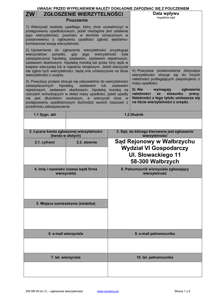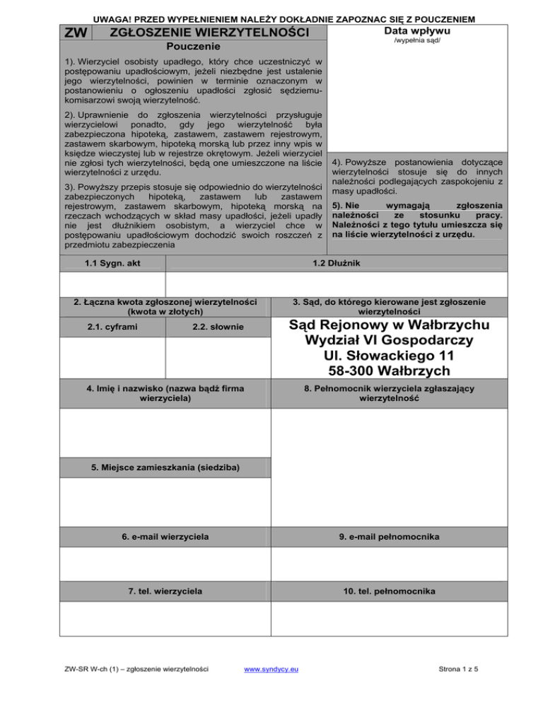 UWAGA! PRZED WYPEŁNIENIEM NALEŻY DOKŁADNIE ZAPOZNAC SIĘ Z POUCZENIEM ZW Data wpływu ZGŁOSZENIE WIERZYTELNOŚCI /wypełnia sąd/ Pouczenie 1). Wierzyciel osobisty upadłego, który chce uczestniczyć w postępowaniu upadłościowym, jeżeli niezbędne jest ustalenie jego wierzytelności, powinien w terminie oznaczonym w postanowieniu o ogłoszeniu upadłości zgłosić sędziemukomisarzowi swoją wierzytelność. 2). Uprawnienie do zgłoszenia wierzytelności przysługuje wierzycielowi ponadto, gdy jego wierzytelność była zabezpieczona hipoteką, zastawem, zastawem rejestrowym, zastawem skarbowym, hipoteką morską lub przez inny wpis w księdze wieczystej lub w rejestrze okrętowym. Jeżeli wierzyciel nie zgłosi tych wierzytelności, będą one umieszczone na liście wierzytelności z urzędu. 3). Powyższy przepis stosuje się odpowiednio do wierzytelności zabezpieczonych hipoteką, zastawem lub zastawem rejestrowym, zastawem skarbowym, hipoteką morską na rzeczach wchodzących w skład masy upadłości, jeżeli upadły nie jest dłużnikiem osobistym, a wierzyciel chce w postępowaniu upadłościowym dochodzić swoich roszczeń z przedmiotu zabezpieczenia 1.1 Sygn. akt 5). Nie wymagają zgłoszenia należności ze stosunku pracy. Należności z tego tytułu umieszcza się na liście wierzytelności z urzędu. 1.2 Dłużnik 2. Łączna kwota zgłoszonej wierzytelności (kwota w złotych) 2.1. cyframi 4). Powyższe postanowienia dotyczące wierzytelności stosuje się do innych należności podlegających zaspokojeniu z masy upadłości. 2.2. słownie 3. Sąd, do którego kierowane jest zgłoszenie wierzytelności Sąd Rejonowy w Wałbrzychu Wydział VI Gospodarczy Ul. Słowackiego 11 58-300 Wałbrzych 4. Imię i nazwisko (nazwa bądź firma wierzyciela) 8. Pełnomocnik wierzyciela zgłaszający wierzytelność 5. Miejsce zamieszkania (siedziba) 6. e-mail wierzyciela 9. e-mail pełnomocnika 7. tel. wierzyciela 10. tel. pełnomocnika ZW-SR W-ch (1) – zgłoszenie wierzytelności www.syndycy.eu Strona 1 z 5 11. Niniejszym, na podstawie art. 239 i 240 Ustawy z dnia 28 lutego 2003 r. Prawo upadłościowe i naprawcze (Dz.U.2009.175.1361 t.j. ze zmianami) – dalej: p.u.i.n. – zgłaszam wierzytelność w łącznej kwocie wskazanej w punkcie 2.1. – cyframi, 2.2 – słownie. Na wierzytelność powyższą składają się: Lp. 11.1 Określenie wierzytelności 11.2 Kwota (w złotych) 11.3 Opis wierzytelności – określenie dowodu jej istnienia 11.4 Nr załącznika 1 2 3 4 5 6 7 8 9 10 11 12 13 14 15 16 17 18 19 20 21 22 23 24 25 26 27 28 ZW-SR W-ch (1) – zgłoszenie wierzytelności www.syndycy.eu Strona 2 z 5 12. Podaję, iż wierzytelność ma być zaliczona do następującej kategorii: 12.1 Określenie kategorii 12.2 Opis kategorii Kategoria I Koszty postępowania upadłościowego, przypadające za czas po ogłoszeniu upadłości należności alimentacyjne oraz renty za wywołanie choroby, niezdolności do pracy, kalectwa lub śmierci oraz z tytułu zamiany uprawnień objętych treścią prawa dożywocia na dożywotnią rentę, należności z tytułu bezpodstawnego wzbogacenia masy upadłości, należności z zawartych przez upadłego przed ogłoszeniem upadłości umów, których wykonania zażądał syndyk, należności powstałe z czynności syndyka albo zarządcy oraz należności, które powstały z czynności upadłego dokonanych po ogłoszeniu upadłości, niewymagających zgody nadzorcy sądowego lub dokonanych za jego zgodą Kategoria II Przypadające za czas przed ogłoszeniem upadłości należności ze stosunku pracy, należności rolników z tytułu umów o dostarczenie produktów z własnego gospodarstwa rolnego, należności alimentacyjne oraz renty za wywołanie choroby, niezdolności do pracy, kalectwa lub śmierci i renty z tytułu zamiany uprawnień objętych treścią prawa dożywocia na dożywotnią rentę, przypadające za dwa ostatnie lata przed ogłoszeniem upadłości należności z tytułu składek na ubezpieczenia społeczne, wraz z odsetkami i kosztami egzekucji Kategoria III Podatki i inne daniny publiczne oraz pozostałe należności z tytułu składek na ubezpieczenia społeczne, wraz z odsetkami i kosztami egzekucji Kategoria IV Inne należności, jeżeli nie podlegają zaspokojeniu w kategorii piątej, wraz z odsetkami za ostatni rok przed datą ogłoszenia upadłości, z odszkodowaniem umownym, kosztami procesu i egzekucji Kategoria V Odsetki, które nie należą do wyższych kategorii w kolejności, w jakiej podlega zaspokojeniu kapitał, a także sądowe i administracyjne kary grzywny oraz należności z tytułu darowizn i zapisów 12.3 Wskazanie kwot z kolumny 11.2 13. Opis dodatkowy ZW-SR W-ch (1) – zgłoszenie wierzytelności www.syndycy.eu Strona 3 z 5 14. Wskazuję, iż wierzytelność jest zabezpieczona w sposób następujący: 15. Oświadczenie wierzyciela, w jakiej prawdopodobnie sumie wierzytelność nie będzie zaspokojona z przedmiotu zabezpieczenia. 16. Zgłaszam wierzytelność, w stosunku do której upadły nie jest dłużnikiem osobistym a wierzytelność podlega zaspokojeniu z następującego przedmiotu zabezpieczenia: 17. Stan sprawy sądowej, administracyjnej Lp. 17.1 Sygnatura akt 17.2 Opis stanu sprawy 1 2 3 4 5 6 7 8 9 ZW-SR W-ch (1) – zgłoszenie wierzytelności www.syndycy.eu Strona 4 z 5 18. Jeżeli wierzyciel jest wspólnikiem albo akcjonariuszem spółki będącej upadłym – ilość posiadanych udziałów albo akcji oraz ich rodzaj 19. Do niniejszego zgłoszenia wierzytelności załączam (spis załączników) 20. Imię 21. Nazwisko 22. Podpis UWAGA! Zgłoszenia wierzytelności dokonuje się na piśmie w dwóch egzemplarzach – na adres sądu wskazany w poz. 3. Do pisma zgłaszający wierzytelność dołącza oryginał lub notarialnie poświadczony odpis dokumentu uzasadniającego zgłoszenie. Poświadczenia odpisów może dokonać także radca prawny lub adwokat, będący pełnomocnikiem wierzyciela, któr