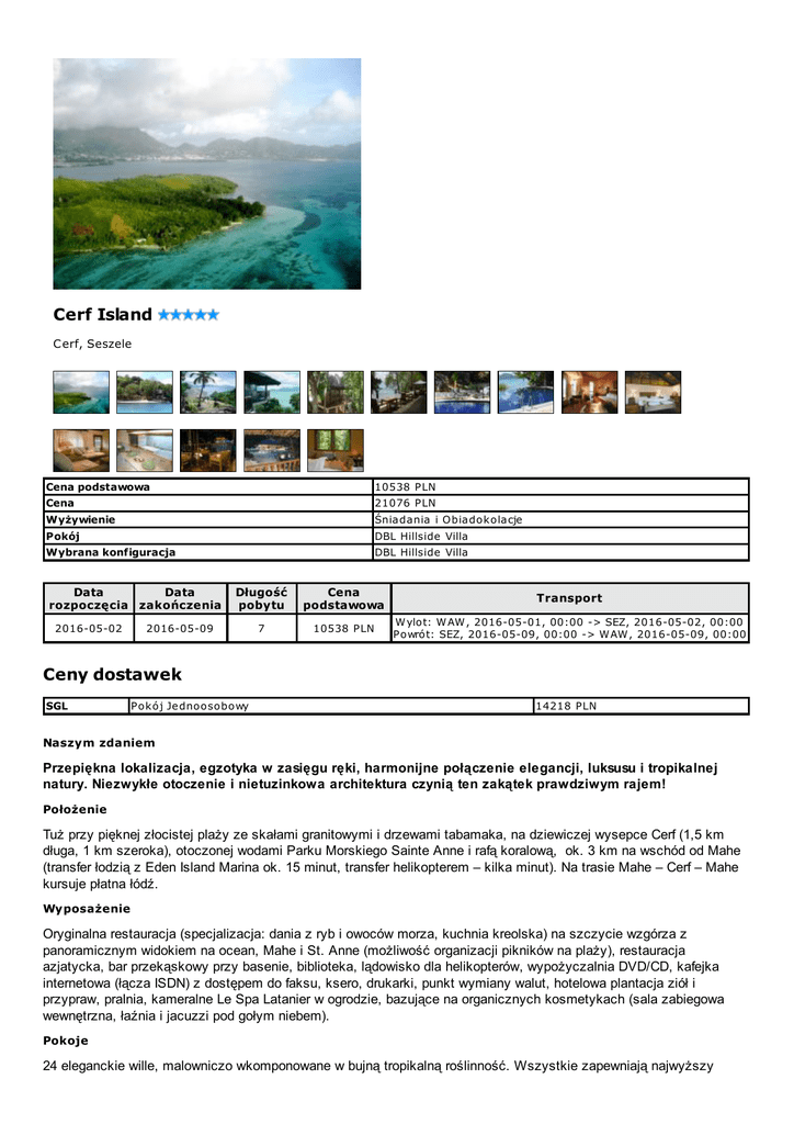 Cerf Island C erf, Seszele Cena podstawowa 10538 P LN Cena 21076 P LN Wyżywienie Śnia da nia i O bia dok ola cje Pokój DBL Hillside Villa Wybrana konfiguracja DBL Hillside Villa Data Data rozpoczęcia zakończenia 2016-05-02 Długość pobytu Cena podstawowa Transport 7 10538 P LN W ylot: W AW , 2016-05-01, 00:00 -> SEZ, 2016-05-02, 00:00 P owrót: SEZ, 2016-05-09, 00:00 -> W AW , 2016-05-09, 00:00 2016-05-09 Ceny dostawek SGL P ok ój Je dnoosobowy 14218 P LN Naszym zdaniem Przepiękna lokalizacja, egzotyka w zasięgu ręki, harmonijne połączenie elegancji, luksusu i tropikalnej natury. Niezwykłe otoczenie i nietuzinkowa architektura czynią ten zakątek prawdziwym rajem! Położenie Tuż przy pięknej złocistej plaży ze skałami granitowymi i drzewami tabamaka, na dziewiczej wysepce Cerf (1,5 km długa, 1 km szeroka), otoczonej wodami Parku Morskiego Sainte Anne i rafą koralową, ok. 3 km na wschód od Mahe (transfer łodzią z Eden Island Marina ok. 15 minut, transfer helikopterem – kilka minut). Na trasie Mahe – Cerf – Mahe kursuje płatna łódź. Wyposażenie Oryginalna restauracja (specjalizacja: dania z ryb i owoców morza, kuchnia kreolska) na szczycie wzgórza z panoramicznym widokiem na ocean, Mahe i St. Anne (możliwość organizacji pikników na plaży), restauracja azjatycka, bar przekąskowy przy basenie, biblioteka, lądowisko dla helikopterów, wypożyczalnia DVD/CD, kafejka internetowa (łącza ISDN) z dostępem do faksu, ksero, drukarki, punkt wymiany walut, hotelowa plantacja ziół i przypraw, pralnia, kameralne Le Spa Latanier w ogrodzie, bazujące na organicznych kosmetykach (sala zabiegowa wewnętrzna, łaźnia i jacuzzi pod gołym niebem). Pokoje 24 eleganckie wille, malowniczo wkomponowane w bujną tropikalną roślinność. Wszystkie zapewniają najwyższy komfort, spokój i intymność, są luksusowo wykończone, stylistyką nawiązują do lokalnych tradycji architektonicznych (np. ratanowe meble, drewniane werandy). Różnią się nieco wystrojem, mają nazwy seszelskich roślin i zwierząt. Każda willa jest klimatyzowana, ma wiatrak, odtwarzacz CD/DVD, TV sat (LCD), minibar, sejf, zestaw do kawy/herbaty, telefon, taras (leżaki, stoliczek), suszarkę do włosów, obszerną łazienkę z częścią pod gołym niebem (duża wanna z jacuzzi, prysznic) i wewnętrzną toaletę; Hillside Villa – 58 m2 + balkon 22 m2 , Hideaway Villa – 58m2 + balkon 22m2+prywatny ogród 20m2, Tortoise Suite Villa – 68m2 + balkon 28m2, oddzielny salon, 2 łazienki. Wyżywienie HB: Śniadania i obiadokolacje w formie bufetów. All Inclusive: Śniadania, obiady i kolacje w formie bufetów wraz z napojami, soki, piwo, wino. Sport i rozrywka Basen na skraju plaży, centrum sportów wodnych (łódki, kajaki, rowery wodne, snorkeling), diving center (nurkowanie, safari nurkowe, kursy dla dorosłych i dzieci), kort tenisowy (możliwość lekcji z instruktorem), wycieczki, rejsy, wyprawy wędkarskie, nurkowe itp. Ze względu na położenie, kameralną atmosferę i wymogi ochrony środowiska nie ma tu masowych i głośnych imprez ani sportów motorowych. Hotel specjalizuje się w organizacji prywatnych uroczystości (np. ceremonie ślubne, pobyty okolicznościowe), pikników, barbeque na plaży oraz wydarzeń dopasowanych na miarę. Dla dzieci Hotel akceptuje pobyty dzieci od lat 7. Uwagi Podane ceny obliczone są dla uśrednionych taryf biletów lotniczych, obowiązujących w okresie ważności cennika. W przypadku braku możliwości rezerwacji biletów lotniczych w przyjętych taryfach cena ostateczna imprezy może ulec zmianie. Ewentualna dopłata podlega akceptacji klienta. Wylot możliwy jest w dowolnej dacie oraz z dowolnego portu lotniczego, również zagranicznego. Przy wyjazdach na Seszele wiza nie jest wymagana. Po przylocie na Seszele należy podać adres planowanego miejsca pobytu, jak również dysponować odpowiednimi do czasu pobytu środkami finansowymi (gotówka, karty kredytowe, czeki podróżne). Wymagany jest paszport ważny 6 miesięcy od daty powrotu do Polski. Cena zawiera Bilet lotniczy z opłatami lotniskowymi, transfer lotnisko-hotel-lotnisko, zakwaterowanie wg oferty, wyżywienie wg oferty, anglojęzyczny rezydent, ubezpieczenie od KL, NNW, bagażu i chorób przewlekłych, VAT. Cena nie zawiera Wycieczek fakultatywnych, napiwków, wydatków własnych, dodatkowych ubezpieczeń: od kosztów rezygnacji i pakiet SPORT.
