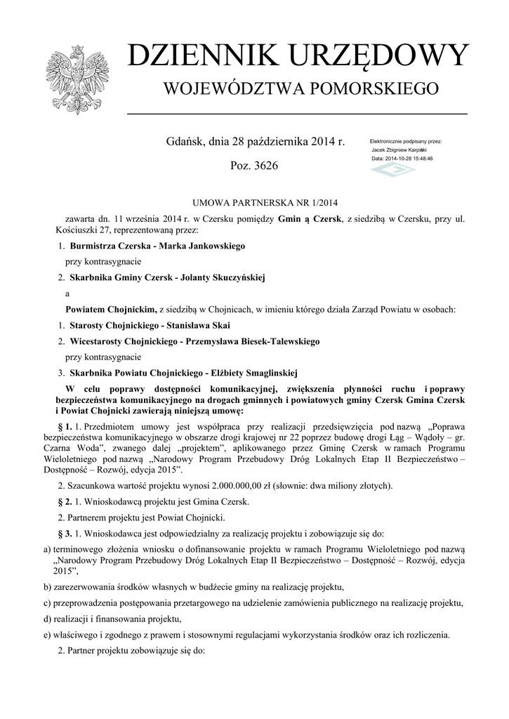DZIENNIK URZĘDOWY WOJEWÓDZTWA POMORSKIEGO Gdańsk, dnia 28 października 2014 r. Elektronicznie podpisany przez: Jacek Zbigniew Karpiński Poz. 3626 Data: 2014-10-28 15:48:46 UMOWA PARTNERSKA NR 1/2014 zawarta dn. 11 września 2014 r. w Czersku pomiędzy Gmin ą Czersk, z siedzibą w Czersku, przy ul. Kościuszki 27, reprezentowaną przez: 1. Burmistrza Czerska - Marka Jankowskiego przy kontrasygnacie 2. Skarbnika Gminy Czersk - Jolanty Skuczyńskiej a Powiatem Chojnickim, z siedzibą w Chojnicach, w imieniu którego działa Zarząd Powiatu w osobach: 1. Starosty Chojnickiego - Stanisława Skai 2. Wicestarosty Chojnickiego - Przemysława Biesek-Talewskiego przy kontrasygnacie 3. Skarbnika Powiatu Chojnickiego - Elżbiety Smaglinskiej W celu poprawy dostępności komunikacyjnej, zwiększenia płynności ruchu i poprawy bezpieczeństwa komunikacyjnego na drogach gminnych i powiatowych gminy Czersk Gmina Czersk i Powiat Chojnicki zawierają niniejszą umowę: § 1. 1. Przedmiotem umowy jest współpraca przy realizacji przedsięwzięcia pod nazwą „Poprawa bezpieczeństwa komunikacyjnego w obszarze drogi krajowej nr 22 poprzez budowę drogi Łąg – Wądoły – gr. Czarna Woda”, zwanego dalej „projektem”, aplikowanego przez Gminę Czersk w ramach Programu Wieloletniego pod nazwą „Narodowy Program Przebudowy Dróg Lokalnych Etap II Bezpieczeństwo – Dostępność – Rozwój, edycja 2015”. 2. Szacunkowa wartość projektu wynosi 2.000.000,00 zł (słownie: dwa miliony złotych). § 2. 1. Wnioskodawcą projektu jest Gmina Czersk. 2. Partnerem projektu jest Powiat Chojnicki. § 3. 1. Wnioskodawca jest odpowiedzialny za realizację projektu i zobowiązuje się do: a) terminowego złożenia wniosku o dofinansowanie projektu w ramach Programu Wieloletniego pod nazwą „Narodowy Program Przebudowy Dróg Lokalnych Etap II Bezpieczeństwo – Dostępność – Rozwój, edycja 2015”, b) zarezerwowania środków własnych w budżecie gminy na realizację projektu, c) przeprowadzenia postępowania przetargowego na udzielenie zamówienia publicznego na realizację projektu, d) realizacji i finansowania projektu, e) właściwego i zgodnego z prawem i stosownymi regulacjami wykorzystania środków oraz ich rozliczenia. 2. Partner projektu zobowiązuje się do: Dziennik Urzędowy Województwa Pomorskiego –2– Poz. 3626 a) udzielenia pomocy finansowej Gminie Czersk w wysokości 100.000 zł (słownie: sto tysięcy złotych) na realizację projektu, b) współpracy z Wnioskodawcą przy realizacji projektu, c) pomocy przy uzyskaniu i pomiarze wskaźników celu projektu, d) wspólnej z Wnioskodawcą promocji projektu i jego efektów. § 4. Przekazanie środków finansowych na realizację projektu, o których mowa § 3 ust. 2 pkt. a), nastąpi w terminie zgodnym z harmonogramem realizacji robót na konto wskazane przez Wnioskodawcę, po przedłożeniu przez Wnioskodawcę partnerowi projektu uwierzytelnionych kopii faktur, jednak nie później niż 21 dni po terminie wystawienia faktur. Harmonogram płatności zostanie przekazany przez Wnioskodawcę po zawarciu umowy wykonawczej i określeniu harmonogramu rzeczowo – finansowego przez Wykonawcę projektu. § 5. Przedmiot projektu pozostanie własnością Wnioskodawcy projektu i będzie przez niego zarządzany. § 6. Niniejsza umowa zostaje zawarta na okres realizacji projektu, tzn. od dnia podpisania niniejszej umowy do dnia 30 września 2015 r. § 7. 1. Umowa wiąże strony po zatwierdzeniu treści umowy przez organy stanowiące jednostek samorządu terytorialnego będących stronami umowy. 2. Brak akceptacji organów stanowiących spowoduje wygaśnięcie umowy bez ujemnych skutków prawnych dla stron. § 8. W przypadku nie uzyskania dofinansowania na realizację projektu w ramach Programu Wieloletniego pod nazwą „Narodowy Program Przebudowy Dróg Lokalnych Etap II Bezpieczeństwo – Dostępność – Rozwój, edycja 2015” niniejsza umowa ulega rozwiązaniu bez ujemnych skutków prawnych dla jakiejkolwiek ze stron. § 9. Zmiana postanowień niniejszej umowy wymaga formy pisemnej w postaci aneksu pod rygorem nieważności. § 10. Strony ustalają, że właściwy do rozstrzygania sporów będzie Sąd właściwy dla siedziby Powiatu Chojnickiego. § 11. Umowa podlega ogłoszeniu w Dzienniku Urzędowym Województwa Pomorskiego na podstawie art. 13 pkt. 6 ustawy z dnia 20 lipca 2000 r. o ogłaszaniu aktów normatywnych i niektórych innych aktów prawnych (Dz. U. Nr 62, poz. 718 ze zm.). § 12. Umowę sporządzano w czterech jednobrzmiących egzemplarzach, po dwa dla każdej ze stron. POWIAT CHOJNICKI GMINA CZERSK Dziennik Urzędowy Województwa Pomorskiego –3– Poz. 3626 Starosta Chojnicki Burmistrz Czerska Stanisław Skaja Marek Jankowski Wicestarosta Chojnicki Skarbnika Gminy Przemysław BiesekTalewski Jolanta Skuczyńska Skarbnik Powiatu Elżbieta Smaglinska