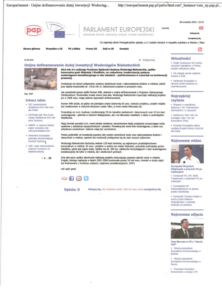 Europarlament - Unijne dofinansowanie duzej inwestycji Wodociag ... http://europarlament.pap.pl/palio/html.nm? _ Instance=cms _ep.pap.pl... 08 wrzesnia 2010 115:15 PARLAMENT EUROPEJSKI wyszukaj Zabgujsie otwarte drzwi, otwarty umysl. nowe mozliwosci Co najmniej Strona glówna wszystko PE z bliska o UE Prawo osmiu Portugalczyków Dzis w UE UE zginelo, a 11 zosta1o ramych ~ mln zl z unijnego Funduszu i Spójnosci Wasilków, w obu Zarejestruj sie w Maroku I Niezr Aktualnosci Odsluchaj • Dzieki funduszom zaczynac najwiekszy Unijne dofinansowanie duzej inwestycji Wodociagów Bialostockich komunalna gmin Bialystok wodoclagowo-kanalizacyjnego autokaru Kontakt 02.09.2010 96,S w wypadku dostana Wodociagi BIalostockie, projekt spólka na rozbudowe i modernizacje systemu miastach - poinformowano w czwartek na konferencji odbudowy UE mozna w Polsce plazy • UE potepia zamiar spalenia Koranu w USA prasowej. • Inwestyqa ma sluzyc polepszeniu systemu dystrybuqi prac bedzie kosztowala ok. 143,8 mln zl. zakonczona Jak powiedzial Fot. PAP Zobacz takze • UE/ Lewandowski; dodatkowe 633 mln euro dla Polski i Srodowisko Roman Wilk dodal, byc zrealizowany UE/Polska jak chce moze wydac dodatkowe 633 mln Roman Wilk, starania trwaly jedynie ze gdyby równo o unijne dofinansowanie dwa lata. Wodociagi zapowiedz z Programu rozpoczely (stanowia 65 proc. wartosci projektu), czasie: kilku, a moze nawet kilkunastu projekt móglby lat. mikroprzedsiebiorców • Parlament potrzeba kontroli Europejski; skuteczniejszej fundus~ • UKE: male wykorzystanie unijnych funduszy na teleinformatyke 12 ...39 EuropejSki on m.in. budowe wodociagowej Wasilkowie. - glównie i modemiza<;je w centrum 70 km kanalów Bialegostoku, sanitarnych i na kilkunastu ale i deszczowych osiedlach, • z UE, Partnerstwie i o wyborach oraz 42 km sieci a takze w podmiejskim • Radiczova; Nam nikt nie wiec i my nie pomozemy Gre<;ji Maja równiez powstac m.in. nowe kanaly sanitarne; zamontowane beda urza;Jzenia oczyszczajace wody opadowe z substanqi ropopochodnych i zawiesin. Powstana tez nowe linie wodociagowe, a stare rury • Europejska azbestowo-cementowe wyplate drugiej dla Gre<;ji Prezes podkreslil, maja byc wymienione. ze inwestyqa deszczówki w miescie, zapewni Wodociagi 8ialostockie poprawi caly system tez mozliwosc dystrybucji podlac:zenia wody oraz odprowadzania sie do sieci nowych na Eksperci o wspólpracy pomagal, i stalowe w skazanej Najczesciej czytane Bialorusi euro funduszy • ARiMR; w czerwcu bedzie nabór wniosków dla Parlament obronie Iranki ukamienowanie Operacyjnego realiza<;je projektu dofinansowania. nie pienia;Jze unijne w znacznie dluzszym Bialostockie w miescie; calosc Wschodnim Przewiduje • prezes spólki Infrastruktura juz w 2008 roku, maj~ wody i odprowadzenia scieków zostanie w przyszlym roku. scieków Komisja zaleca transzy POzyczki i odbiorców. Najnowsze wideo komunalnym obchodza wlasnie w miescie. 92 proc. udzialów l20-lecIe Istnienia; sa najstarszym w spólce ma miasto Bialystok, Wasilków, gdzie jest ujede wody. Spólka ma ok. 300 tys. odbiorców kanalizacyjnej nie tylko w miescie, ale I okolicznych gminach. Dwa lata temu spólka zakonczyla Projekt, którego byl finansowany reaJiza<;je projektu realiza<;ja w latach 2002-2008 z funduszy unijnych, czesciowo dotyczacego kosztowala ponad przedakcesyjnych. przedsiebiorstwem pozostale korzvstamch poprawy podmiejska gmina z sieci wodociagoWO- jakosci wody 18 mln euro, równiez w miescie. w duzej czesci (PAP) rof/ pad/ gma/ Europosel Wojciech Olejniczak wakacjach o pracach • Europosel PO, EPL Rafal Trzaskowski wakaqach • Opinie: O Zaloguj sie, aby dodawac opinie. Jesli nie masz konta zarejestruj sie. o zadaniach Europejskie Europosel PE po Dni Dobrosasiedztwa polsko-ukrainskiej • PE po na granicy Tomasz Poreba o krzyzu przed Palacem Prezydenckim i rozdziale Kosciola od panstwa Najnowsze zdjecia ,-. ~.~. -" or,-' ••• Jose Unii" • ~•.~l;;~,:-1 Barroso PE o "stanie Wizyta Komorowskiego Prezydent Komorowski w prezydenta Bronislawa Paryzu • 1 Wizyta prezydenta Bronislawa Berlinie • w -- Komorowskiego Bronislaw z wizyta w PE w