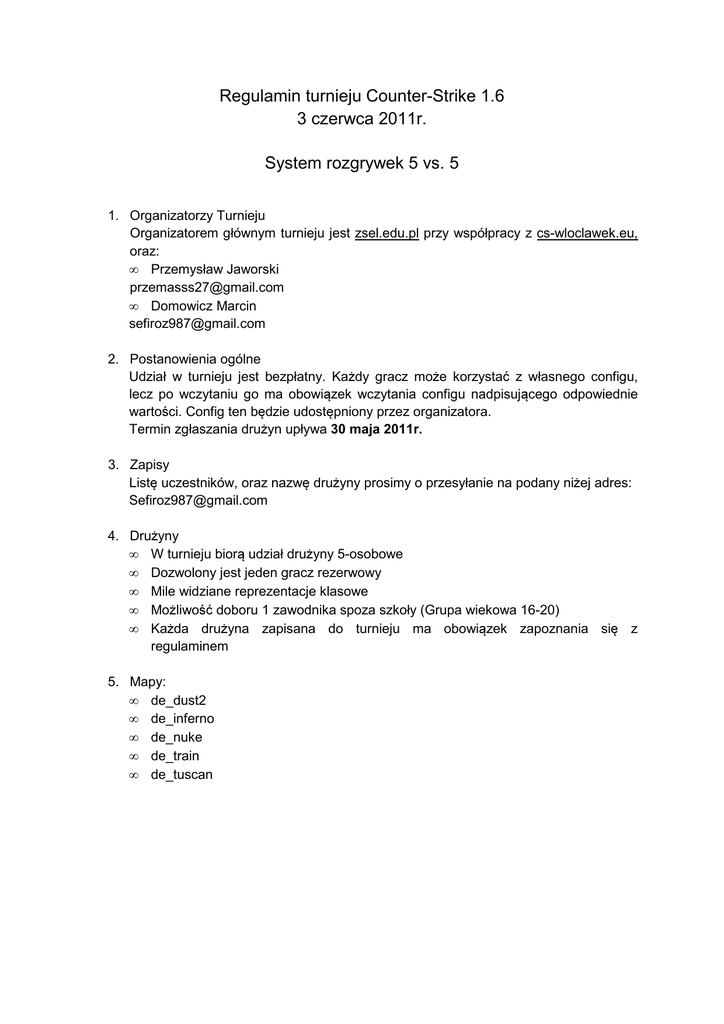 Regulamin turnieju Counter-Strike 1.6 3 czerwca 2011r. System