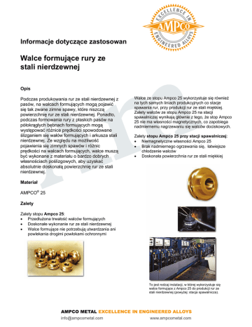 Informacje dotyczące zastosowan Walce formujące rury ze stali nierdzewnej Opis Podczas produkowania rur ze stali nierdzewnej z pasów, na walcach formujących mogą pojawić się tak zwane zimne spawy, które niszczą powierzchnię rur ze stali nierdzewnej. Ponadto, podczas formowania rury z płaskich pasów na półokrągłych bębnach formujących mogą występować różnice prędkości spowodowane ślizganiem się wałów formujących i arkusza stali nierdzewnej. Ze względu na możliwość pojawienia się zimnych spawów i różnic prędkości na walcach formujących, walce muszą być wykonane z materiału o bardzo dobrych własnościach poślizgowych, aby uzyskać absolutnie doskonałą powierzchnię rur ze stali nierdzewnej. Walce ze stopu Ampco 25 wykorzystuje się również na tych samych liniach produkcyjnych co stacje spawania rur, przy produkcji rur ze stali miękkiej. Zalety walców ze stopu Ampco 25 na stacji spawalniczej wynikają głównie z tego, że stop Ampco 25 nie ma własności magnetycznych, co zapobiega nadmiernemu nagrzewaniu się walców dociskowych. Zalety stopu Ampco 25 przy stacji spawalniczej: • Niemagnetyczne własności Ampco 25 • Brak nadmiernego ogrzewania się, łatwiejsze chłodzenie walców • Doskonała powierzchnia rur ze stali miękkiej Materiał AMPCO® 25 Zalety Zalety stopu Ampco 25: • Przedłużona trwałość walców formujących • Doskonałe wykonanie rur ze stali nierdzewnej • Walce formujące nie potrzebują utwardzania ani powlekania drogimi powłokami ochronnymi To jest rodzaj instalacji, w której wykorzystuje się walce formujące z Ampco 25 do produkcji rur ze stali nierdzewnej (powyżej: stacja spawalnicza).