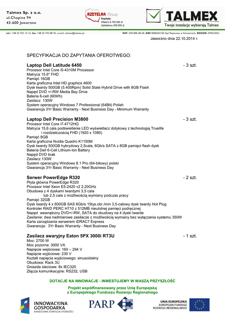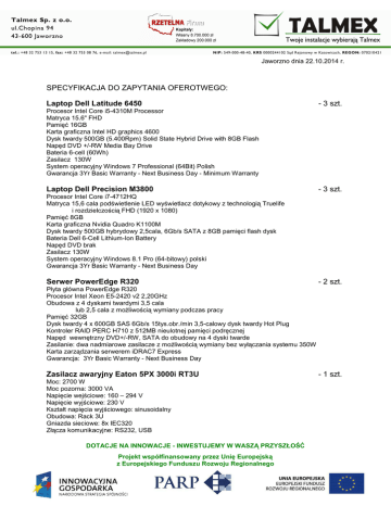Jaworzno dnia 22.10.2014 r. SPECYFIKACJA DO ZAPYTANIA OFEROTWEGO: Laptop Dell Latitude 6450 - 3 szt. Procesor Intel Core i5-4310M Processor Matryca 15.6" FHD Pamięć 16GB Karta graficzna Intel HD graphics 4600 Dysk twardy 500GB (5.400Rpm) Solid State Hybrid Drive with 8GB Flash Napęd DVD +/-RW Media Bay Drive Bateria 6-cell (60Wh) Zasilacz 130W System operacyjny Windows 7 Professional (64Bit) Polish Gwarancja 3Yr Basic Warranty - Next Business Day - Minimum Warranty Laptop Dell Precision M3800 - 3 szt. Procesor Intel Core i7-4712HQ Matryca 15,6 cala podświetlenie LED wyświetlacz dotykowy z technologią Truelife i rozdzielczością FHD (1920 x 1080) Pamięć 8GB Karta graficzna Nvidia Quadro K1100M Dysk twardy 500GB hybrydowy 2,5cala, 6Gb/s SATA z 8GB pamięci flash dysk Bateria Dell 6-Cell Lithium-Ion Battery Napęd DVD brak Zasilacz 130W System operacyjny Windows 8.1 Pro (64-bitowy) polski Gwarancja 3Yr Basic Warranty - Next Business Day Serwer PowerEdge R320 - 2 szt. Płyta główna PowerEdge R320 Procesor Intel Xeon E5-2420 v2 2,20GHz Obudowa z 4 dyskami twardymi 3,5 cala lub 2,5 cala z możliwością wymiany podczas pracy Pamięć 32GB Dysk twardy 4 x 600GB SAS 6Gb/s 15tys.obr./min 3,5-calowy dysk twardy Hot Plug Kontroler RAID PERC H710 z 512MB nieulotnej pamięci podręcznej Napęd wewnętrzny DVD+/-RW, SATA do obudowy na 4 dyski twarde Zasilanie: dwa nadmiarowe zasilacze z możliwością wymiany bez wyłączania systemu 350W Karta zarządzania serwerem iDRAC7 Express Gwarancja: 3Yr Basic Warranty - Next Business Day Zasilacz awaryjny Eaton 5PX 3000i RT3U Moc: 2700 W Moc pozorna: 3000 VA Napięcie wejściowe: 160 – 294 V Napięcie wyjściowe: 230 V Kształt napięcia wyjściowego: sinusoidalny Obudowa: Rack 3U Gniazda sieciowe: 8x IEC320 Złącza komunikacyjne: RS232, USB DOTACJE NA INNOWACJE - INWESTUJEMY W WASZĄ PRZYSZŁOŚĆ Projekt współfinansowany przez Unię Europejską z Europejskiego Funduszu Rozwoju Regionalnego - 1 szt. Dysk sieciowy QNAP TS-420U z 4 x WD RED 3TB - 1 szt. Obudowa RACK 1U Konfiguracja RAID 0, 1 ,5, 6, 5+ Wbudowany serwer wydruku, serwer FTP Dysk twardy 4 x WD Red 3.5'' 3TB SATA/600 64MB cache Drukarka etykiet Citizen CL-S700R - 1 szt. Rodzaje druku: termicznu i termotransferowy Rozdzielczość drukowania: 203dpi Maksymalna szerokośc druku: 104mm Pamięć: 16MB RAM/4MB FLASH Rodzaje interfejsu: USB, RS-232, LPT Komunikacja bezprzewodowa brak Gilotyna (nóż, obcinak) tak Drukowane kody kreskowe: 1D: EAN-8, EAN-13, UPC-A(-E), UCC/EAN 128, 3z9, 2z5, kod 93, 128, Coderbar, Telepen, Zip 2D: PDF417, Maxicode, Posnet, QR Code, DataMatrix Router DrayTek Vigor 2960 - 1 szt. Ilość gniazd WAN: 2xRJ45 Ilość gniazd LAN: 4xRJ45 Obsługa VPN Zarządzanie pasmem QoS Możliwość połączenia modemu 3G/LTE poprzez złącze USB Licencja WCF-Silver (Cyren) Web Content Filter - Filtr Treści Web Czytnik kodów kreskowych Motorola LS 2208 Rodzaj czytnika: ręczny laserowy jednoliniowy Źródło światła: dioda laserowa 650 nm Odległość odczytu: do 43 cm Szybkość odczytu: 100 skanów /s Temperatura pracy. 0 – 50°C Interfejs: USB DOTACJE NA INNOWACJE - INWESTUJEMY W WASZĄ PRZYSZŁOŚĆ Projekt współfinansowany przez Unię Europejską z Europejskiego Funduszu Rozwoju Regionalnego - 6 szt.