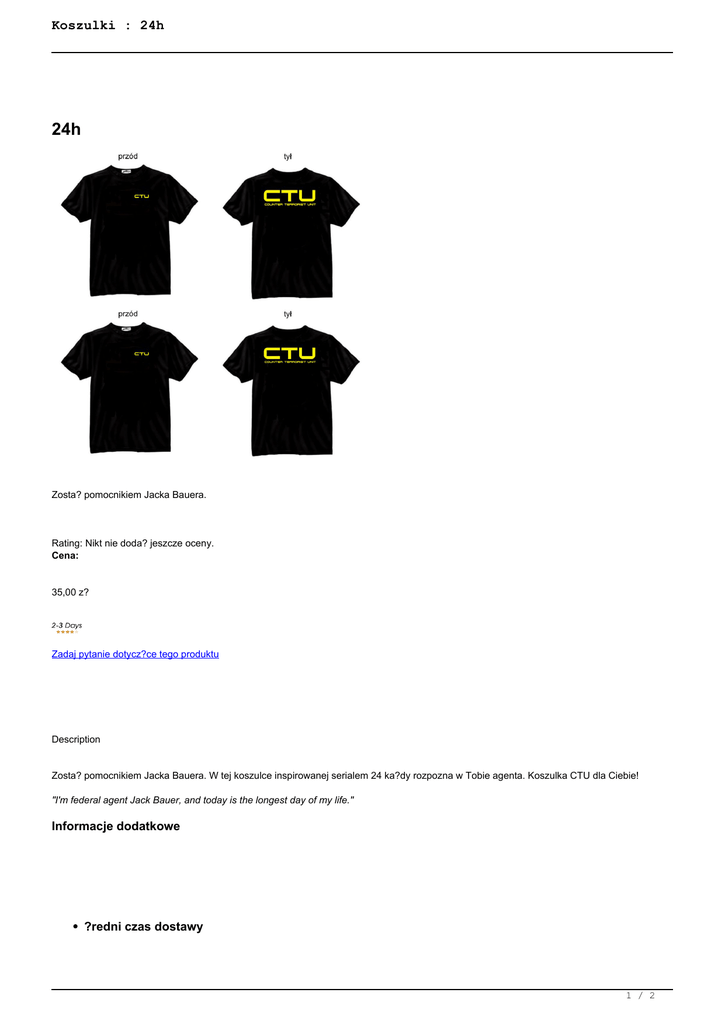 Koszulki : 24h 24h Zosta? pomocnikiem Jacka Bauera. Rating: Nikt nie doda? jeszcze oceny. Cena: 35,00 z? Zadaj pytanie dotycz?ce tego produktu Description Zosta? pomocnikiem Jacka Bauera. W tej koszulce inspirowanej serialem 24 ka?dy rozpozna w Tobie agenta. Koszulka CTU dla Ciebie! "I'm federal agent Jack Bauer, and today is the longest day of my life." Informacje dodatkowe ?redni czas dostawy 1 / 2 Koszulki : 24h 2-3 dni Dost?pne kolory: tylko czarny Zwroty i reklamacja Wed?ug regulaminu sklepu Dost?pno?? Na terenie Polski Dost?pne ?rodki p?atno?ci Przedp?ata na konto / p?atno?ci elektroniczne online 2 / 2 Powered by TCPDF (www.tcpdf.org)