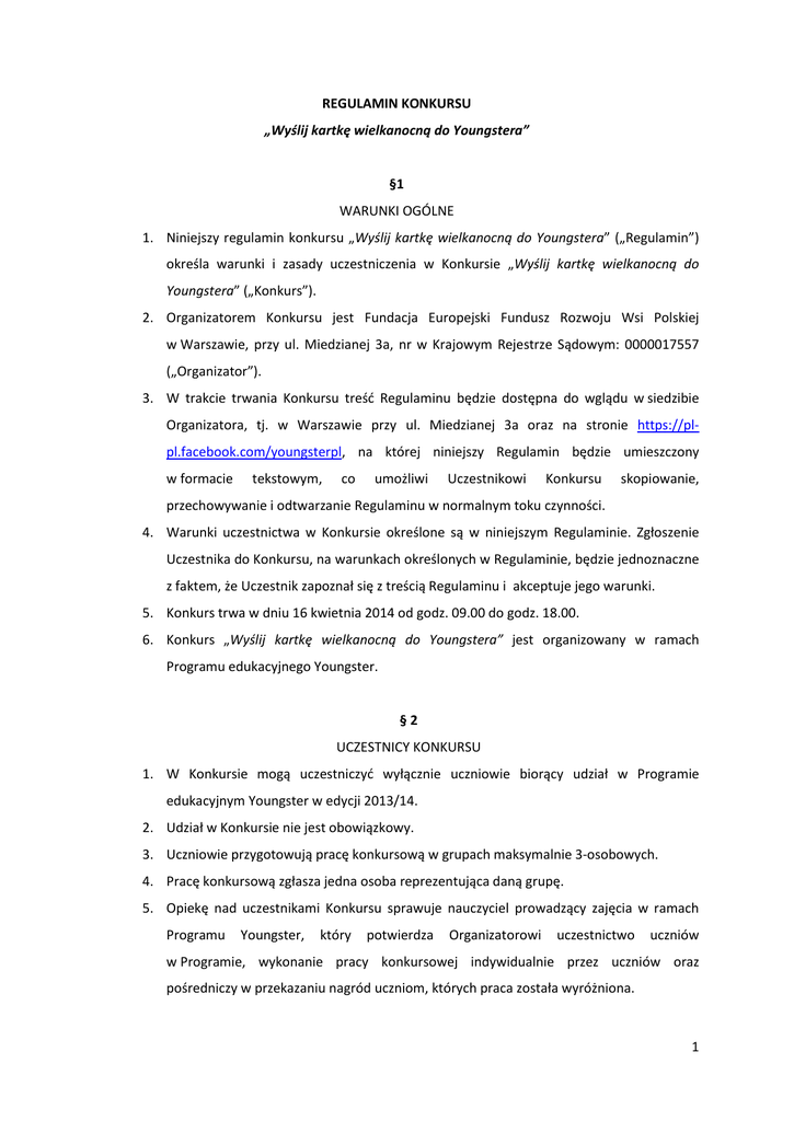 REGULAMIN KONKURSU „Wyślij kartkę wielkanocną do Youngstera” §1 WARUNKI OGÓLNE 1. Niniejszy regulamin konkursu „Wyślij kartkę wielkanocną do Youngstera” („Regulamin”) określa warunki i zasady uczestniczenia w Konkursie „Wyślij kartkę wielkanocną do Youngstera” („Konkurs”). 2. Organizatorem Konkursu jest Fundacja Europejski Fundusz Rozwoju Wsi Polskiej w Warszawie, przy ul. Miedzianej 3a, nr w Krajowym Rejestrze Sądowym: 0000017557 („Organizator”). 3. W trakcie trwania Konkursu treść Regulaminu będzie dostępna do wglądu w siedzibie Organizatora, tj. w Warszawie przy ul. Miedzianej 3a oraz na stronie https://plpl.facebook.com/youngsterpl, na której niniejszy Regulamin będzie umieszczony w formacie tekstowym, co umożliwi Uczestnikowi Konkursu skopiowanie, przechowywanie i odtwarzanie Regulaminu w normalnym toku czynności. 4. Warunki uczestnictwa w Konkursie określone są w niniejszym Regulaminie. Zgłoszenie Uczestnika do Konkursu, na warunkach określonych w Regulaminie, będzie jednoznaczne z faktem, że Uczestnik zapoznał się z treścią Regulaminu i akceptuje jego warunki. 5. Konkurs trwa w dniu 16 kwietnia 2014 od godz. 09.00 do godz. 18.00. 6. Konkurs „Wyślij kartkę wielkanocną do Youngstera” jest organizowany w ramach Programu edukacyjnego Youngster. §2 UCZESTNICY KONKURSU 1. W Konkursie mogą uczestniczyć wyłącznie uczniowie biorący udział w Programie edukacyjnym Youngster w edycji 2013/14. 2. Udział w Konkursie nie jest obowiązkowy. 3. Uczniowie przygotowują pracę konkursową w grupach maksymalnie 3-osobowych. 4. Pracę konkursową zgłasza jedna osoba reprezentująca daną grupę. 5. Opiekę nad uczestnikami Konkursu sprawuje nauczyciel prowadzący zajęcia w ramach Programu Youngster, który potwierdza Organizatorowi uczestnictwo uczniów w Programie, wykonanie pracy konkursowej indywidualnie przez uczniów oraz pośredniczy w przekazaniu nagród uczniom, których praca została wyróżniona. 1 §3 ZASADY KONKURSU 1. Zadanie konkursowe polega na przygotowaniu kartki wielkanocnej (np. wierszyka lub krótkiego listu z życzeniami) skierowanej do Programu Youngster. 2. W kartce Uczniowie mają za zadanie napisać w języku angielskim życzenia z okazji Świąt Wielkanocnych (max. 500 znaków ze spacjami) i wkleić przygotowaną treść na profil Youngster na Facebooku (https://pl-pl.facebook.com/youngsterpl) w dniu 16 kwietnia 2014 od godz. 09.00 do godz. 18.00, w komentarzu pod wpisem konkursowym. 3. Uczestnik konkursu oświadcza, że publikowane przez niego treści są jego autorstwa i nie naruszają jakichkolwiek praw osób trzecich. Odpowiedzialność z tego tytułu ponosi Uczestnik. 4. Zgłoszenia dokonane przez osoby nie spełniające warunków uczestnictwa nie będą brane pod uwagę przy wyłanianiu zwycięzców. 5. Kartka musi być podpisana nazwą szkoły i grupy (np. Gimnazjum Gminne w Karolewie, KAROLEWO_13_A2_G2). 6. Organizator nie odpowiada za podanie nieprawdziwych danych przez Uczestnika lub za podanie danych innej osoby, a także za skutki takich działań Uczestnika. Wszystkie zgłoszenia, zawierające treści obraźliwe lub obelżywe, naruszające czyjeś prawa autorskie; zawierające treści erotyczne, niecenzuralne, ośmieszające, nieprzyzwoite, naruszające powszechnie akceptowane zasady moralności, naruszające godność osobistą, nawiązania do symboli religijnych, etnicznych lub rasowych, zostaną usunięte przez Organizatora. 7. Nad zgłoszonymi pracami konkursowymi obradować będzie jury składające się przedstawicieli Organizatora. 8. Jury przyzna trzy nagrody dla grup Uczniów, których prace konkursowe zostaną uznane przez jury, za najbardziej kreatywne. 9. Wyniki Konkursu zostaną ogłoszone na profilu Programu Youngster na Facebooku https://pl-pl.facebook.com/youngsterpl. 10. Organizator skontaktuje się z nauczycielem prowadzącym daną grupę, w celu potwierdzenia spełnienia warunków uczestnictwa w Konkursie oraz ustalenia zasad przekazania nagrody. 11. W Konkursie wezmą udział wyłącznie prace, które zostaną wgrane na Facebook w dniu 16 kwietnia 2014 od godz. 09.00 do godz. 18.00, spełniające warunki Regulaminu. 2 12. Wpływ pracy konkursowej rejestrowany jest przez portal Facebook. Data i godzina wpływu pracy konkursowej zostanie ustalona na podstawie daty i godziny zarejestrowanej przez portal Facebook. 13. Publikując treść kartki wielkanocnej Uczestnik Konkursu akceptuje treść niniejszego Regulaminu. §4 PRZETWARZANIE DANYCH OSOBOWYCH 1. Administratorem danych osobowych uczestników Programu Youngster w tym uczestników niniejszego Konkursu jest Fundacja Europejski Fundusz Rozwoju Wsi Polskiej. 2. Uczestnicy mają prawo wglądu w swoje dane, prawo ich poprawiania oraz żądania usunięcia. §5 NAGRODY 1. Nagrodami w konkursie będą kubki z logotypem Programu Youngster o wartości 10 zł brutto każdy. Liczba nagród zależna jest od liczebności trzech zwycięskich grup. Będzie to maksymalnie 9 kubków. Nagrody nie podlegają wymianie na inne nagrody lub ekwiwalent pieniężny. 2. Nagrody o wartości do 760 zł brutto korzystają ze zwolnienia z podatku dochodowego od osób fizycznych, zgodnie z art. 21 ust. 1 pkt. 68 Ustawy o podatku dochodowym od osób fizycznych z dnia 26 lipca 1991r (tekst jednolity Dz. U. Nr 14, poz.176). 3. Laureaci tracą prawo do nagrody i staje się ona własnością Organizatora w przypadku odmowy jej przyjęcia przez nauczyciela prowadzącego lub niezgłoszenia się w celu weryfikacji warunków uczestnictwa w konkursie i ustalenia zasad odebrania nagrody przez nauczyciela prowadzącego w terminie do 30.04.2014 r. 4. Decyzja Organizatora w kwestii wyboru laureatów i przyznania nagród jest wiążąca, ostateczna i nie podlega odwołaniu. §6 POSTANOWIENIA DODATKOWE 1. Organizator informuje, że Konkurs nie jest w żadnym zakresie sponsorowany, wspierany, administrowany, ani stowarzyszony z portalem www.facebook.com. Facebook jes