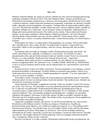 MY I TY Właśnie zastanawialiśmy się, kiedy się zjawisz. Minęło już tyle czasu od naszego pierwszego spotkania, pamiętasz? Kiedy to było? Ach, tak! Piętnasty lipiec. Gorąca, pochmurna noc. Siedziałeś na przystanku autobusowym z dziwnie zwieszoną głową. Rozbawił nas twój widok i zasmucił zarazem; miałeś śmiesznie przekręcony kręgosłup, wspierając się skronią o ściankę budki, zdawałeś się być kompletnie wyczerpany. Tamtego dnia nie pracowałeś jednak ciężko, czyż nie? Wstałeś koło południa, wziąłeś zimny prysznic i jeszcze całkiem mokry zszedłeś na śniadanie. Minąłeś się z rodzicami; wyszli do pracy zanim się obudziłeś. Zaplanowałeś to. Długo piłeś kawę przed telewizorem. Nie miałeś na nic ochoty. Potem zadzwonił Konrad. Spytał, czy do niego wpadniesz. Robił imprezę. Miało być ciekawie. Ale zaraz! Konrad mieszka daleko od przystanku, jak więc się tam znalazłeś? Twoja mama wraca o piątej, wyszedłeś więc z domu o czwartej czterdzieści pięć i zostawiłeś jej kartkę, że wrócisz późno i kochasz. Podeszliśmy do ciebie, a ty dalej spałeś. Potrząsnęliśmy cię za ramię. Otworzyłeś jedno oko i spytałeś przez zęby, czego chcemy. Na odpowiedź, że pomóc, zazgrzytałeś coś bezczelnie. Mimo to nie zrezygnowaliśmy, sami nie wiemy, dlaczego tak nam na tobie zależało. Szesnastego nikt nie mógł cię ściągnąć z łóżka. Postanowiłeś przespać cały dzień. Ale wtedy zadzwoniła ona i zapytała, czy pójdziesz z nią do baru. Nie chciała iść sama i przypomniała sobie, jak już kiedyś proponowałeś jej wspólny wypad. Nawet się ucieszyłeś. Wiemy, co o niej myślałeś. Pisałeś jej imię większą literą niż inne - Agnieszka. Usiedliśmy obok ciebie na ławce i zastanawialiśmy się, jak nakłonić cię do przyjęcia naszej wyciągniętej dłoni. Nie spieszyło ci się. A matka czekała. Martwiła się. Wiedzieliśmy o tym i to jeszcze bardziej motywowano nas do odnalezienia cię i sprowadzenia z powrotem do domu. Konrad otworzył ci drzwi już lekko wstawiony. Nie przeszkadzało ci nic; bałagan, za który przepraszał każdego wchodzącego, świńskie plakaty na ścianach jego pokoju i nawet ta na wpół naga dziewczyna na korytarzu. Zadałeś gospodarzowi pytanie: "Czy jest Agnieszka?", a on na to, że może wpadnie. Czekałeś. Wyszedłeś z domu i niemalże biegłeś do jej mieszkania na jedenastym piętrze. Poprosiła, żebyś poczekał i jeszcze na dziesięć minut weszła do łazienki. Ona miała tę moc. Zmienić cię. Ale było już troszeczkę za późno. Zanim dotarłeś do Konrada, wstąpiłeś do kościoła. Tylko na chwilkę. Czemu? Do tej pory nie wiesz. Nie wierzysz. Nie potrzebne ci są mity jakichś prymitywów sprzed półtora tysiąca lat. Z zakrystii wyszedł ksiądz. Przykucnął przed ołtarzem, pomachał prawą ręką na wysokości głowy i klatki piersiowej i wszedł konfesjonału. Po co? Myślałeś, że lubi słuchać cudzych smutków? Nie, zrozumiałeś; podejście psychologiczne- wypłakać się i przejdzie. Zabobony dla głupich. Nieważne, to był tylko epizod. Szybko wyszedłeś i dotarłeś na plac. Patrzyłeś, jak twoi koledzy grają w piłkę. Nie miałeś ochoty się przyłączyć. Potem plątałeś się jeszcze trochę i poszedłeś na imprezę. Agnieszka wyglądała świetnie; jak zawsze. To nie był wstyd pokazać się z nią na ulicy. Przeszliście tylko kilkaset metrów i byliście na miejscu. Chciała piwo. Kupiłeś jej. Rozmawialiście przez dłuższy czas i nadal nie mogłeś jej rozgryźć. Co w niej takiego było? Potem przyszli koledzy. Nie chciałeś tego, lecz nie miałeś wyjścia. Koło wpół do dwunastej odprowadziłeś ją do domu. Była pijana, ty trochę też. Nim weszła na klatkę schodową, odwróciła się do ciebie i zarzuciła ci swoje ręce na ramiona. Czemu nie byłeś pewny? Zaczęła cię całować. Jak mogłeś odmówić? Potem poprosiła, żebyś na następny dzień przyszedł do niej z szampanem. Miało nie być rodziców. Wszyscy się bawili, a ty tylko czekałeś. Momentami próbowałeś trochę się pokołysać, ale podświadomie ciągle jej wypatrywałeś. Kiedy jej koleżanka powiedziała, że Aga nie przyjdzie, zmartwiłeś się. Nie miałeś już ochoty na balowanie. Mimo to zostałeś. Gdy nieco wytrzeźwiałeś, znów spróbowaliśmy nawiązać z tobą kontakt. Spojrzałeś na nas tępym wzrokiem i udając, że nas nie ma, ruszyłeś w dalszą drogę. Niepostrzeżenie podążaliśmy za tobą. Nie odezwałeś się do nas ani słowem. Piętnaście minut po północy postanowiłeś opuścić imprezę. Jakiś znajomy jechał w kierunku twojego domu. Zabrałeś się z nim. Wysadził cię na przystanku. To było jeszcze tak daleko, a ty taki zmęczony. Postanowiłeś się troszkę zdrzemnąć. Tak cię znaleźliśmy. Wykąpałeś się porządnie i wtarłeś w siebie tą super drogą wodę kolońską. Miała czynić cuda! Wziąłeś ze sobą trochę pieniędzy i poszedłeś do sklepu. Kupiłeś szampana. Włożyłeś do papierowej torby i poszedłeś do niej. Zdziwiłeś się tymi samochodami policyjnymi i karetką. Przyspieszyłeś. Chyba nie od razu uświadomiłeś sobie, co się stało. Stanąłeś w pewnej odległości i spytałeś pierwszego lepszego człowieka, co się stało. - "Ta dziwka z jedenastego wyskoczyła dziś z okna. Szkoda, że nie przyszedłem do niej wcześniej, może by co jeszcze dała. Tak to nic się więcej nie przysłuży."- padła odpowiedź. W rozpaczy chwyciłeś butelkę w prawą dłoń i roztrzaskałeś ją na głowie owego człowieka. Zacząłeś tępo, mechanicznie okładać go, na ziemię opadały coraz mniejsze szklane klejnoty. Kiedy skończyłeś, nie dużo różnił się od Agnieszki. Wszyscy widzieli. Odwiedzaliśmy cię regularnie. Matka zobaczyła cię dopiero na drugi dzień w więzieniu. Żałowałeś. Cały czas to powtarzałeś. Mówiłeś, że nie wiesz czemu. Może 
