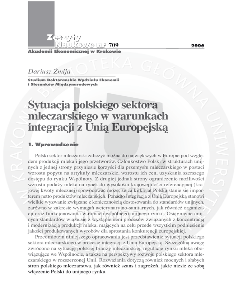 Zeszyty Naukowe nr 709 Akademii Ekonomicznej w Krakowie 2006 Dariusz Żmija Studium Doktoranckie Wydziału Ekonomii i Stosunków Międzynarodowych Sytuacja polskiego sektora mleczarskiego w warunkach integracji z Unią Europejską 1. Wprowadzenie Polski sektor mleczarski zaliczyć można do największych w Europie pod względem produkcji mleka i jego przetworów. Członkostwo Polski w strukturach unijnych z jednej strony przyniesie korzyści dla przemysłu mleczarskiego w postaci wzrostu popytu na artykuły mleczarskie, wzrostu ich cen, uzyskania szerszego dostępu do rynku Wspólnoty. Z drugiej jednak strony ograniczenie możliwości wzrostu podaży mleka na rynek do wysokości krajowej ilości referencyjnej (krajowej kwoty mlecznej) spowodować może, że za kilka lat Polska stanie się importerem netto produktów mleczarskich. Ponadto integracja z Unią Europejską stanowi wielkie wyzwanie związane z koniecznością dostosowania do standardów unijnych, zarówno w zakresie wymagań weterynaryjno-sanitarnych, jak również organizacji oraz funkcjonowania w ramach wspólnego unijnego rynku. Osiągnięcie unijnych standardów wiąże się z wystąpieniem procesów związanych z koncentracją i modernizacją produkcji mleka, mających na celu przede wszystkim podniesienie jakości produkowanych wyrobów dla sprostania konkurencji europejskiej. Przedmiotem niniejszego opracowania jest przedstawienie sytuacji polskiego sektora mleczarskiego w procesie integracji z Unią Europejską. Szczególną uwagę zwrócono na sytuację polskiej branży mleczarskiej, regulacje rynku mleka obowiązujące we Wspólnocie, a także na perspektywy rozwoju polskiego sektora mleczarskiego w rozszerzonej Unii. Rozważania dotyczą również mocnych i słabych stron polskiego mleczarstwa, jak również szans i zagrożeń, jakie niesie ze sobą włączenie Polski do unijnego rynku. 126 Dariusz Żmija 2. Sytuacja branży mleczarskiej przed wstąpieniem Polski do Unii Europejskiej Chów bydła mlecznego należy do podstawowych gałęzi produkcji rolnej w Polsce. W latach 2000–2002 wartość rocznej produkcji mleka wynosiła 2,1–2,5 mld euro, stanowiąc około 17% produkcji globalnej i około 25% produkcji towarowej polskiego rolnictwa. Oznacza to, że co czwarta złotówka uzyskana z produkcji towarowej rolnictwa pochodzi właśnie z chowu bydła mlecznego. W latach 2000–2002 chowem bydła mlecznego zajmowało się w Polsce ok. 875 tys. gospodarstw rolnych, z czego ok. 376 tys. sprzedawało mleko do przemysłu mleczarskiego. Produkcja mleka jest zatem istotnym źródłem dochodu dla znacznej części rodzin rolniczych i angażuje ok. 30–35% zasobów siły roboczej zatrudnionej w rolnictwie. Ogólna wartość sprzedaży produktów przemysłu mleczarskiego w 2002 r. wynosiła 2,8 mld euro, stanowiąc około 15% sprzedaży całego przemysłu rolno-spożywczego. Na tle 15 państw Unii Europejskiej Polska z produkcją ok. 12 mln t mleka w latach 2000–2002 plasuje się na jednym z czołowych miejsc w Europie. Produkcja mleka w Polsce stanowi 10% produkcji mleka państw dotychczasowej „piętnastki”. Warto nadmienić, że Unia Europejska przed poszerzeniem miała status największego eksportera produktów mleczarskich na świecie, posiadając 35% udział w światowym eksporcie. Po akcesji Polski do Unii Europejskiej i poszerzeniu jej o kolejne 10 państw udział Unii Europejskiej w światowej produkcji mleka krowiego wzrósł z 21% do ok. 25%, natomiast produkcja mleka w 25 krajach UE wzrosła o ok. 21 mln ton do poziomu 143 mln t. Spośród wszystkich gałęzi sektora rolno-spożywczego branża mleczarska należy do stosunkowo dobrze przygotowanych do akcesji z Unią Europejską. Procesy związane z restrukturyzacją mleczarstwa rozpoczęły się już w 1998 r., co nie oznacza, że wszystkie działania dostosowawcze zostały w pełni zrealizowane. Spełnienie unijnych standardów leży w interesie nie tylko tych zakładów mleczarskich, które zamierzają funkcjonować na unijnym rynku, lecz także tych, które ograniczą swoją działalność do rynku polskiego. Zgodnie z obowiązującymi przepisami zakłady, które nie będą spełniać unijnych kryteriów, będą musiały oznaczać swoje produkty znakiem weterynaryjnym w postaci kwadratu, natomiast te, które spełniają europejskie standardy, znakiem owalnym. Z czasem pod wpływem negatywnej weryfikacji konsumentów na rynku pozostaną tylko najlepsi, najwięksi i najsilniejsi producenci. J. Seremak-Bulge, Przemysł mleczarski, Fundusz Współpracy, Warszawa 2004, s. 1–2. G. Garlińska, Trudne wyzwania, Dodatek specjalny do „Nowego Życia Gospodarczego” 2004, nr 13, s. 2. Sytuacja polskiego sektora mleczarskiego… 127 Wraz ze wzrostem konkurencji ze strony dużych zakładów krajowych i zagranicznych, nieduże zakłady stanęły w obliczu zagrożenia swojej działalności. Z tego powodu od pewnego czasu na rynku mleczarskim zauważyć można procesy konsolidacji podmiotów. Proces koncentracji kapitału i tworzenie przedsiębiorstw wielozakładowych odbywa się najczęściej poprzez łączenie się spółdzielni lub też wykupywanie podupadających podmiotów przez inne firmy. Działania takie mają przede wszystkim na celu pozyskanie dodatkowych dostawców mleka, powiększenie kwoty przerobu surowca mlecznego, a także zwiększenie rynków zbytu. W związku z tym część firm mleczarskich z województw posiadających nadwyżki surowca mlecznego wykupuje lub przyłącza obiekty mleczarskie nawet z terenów bardzo oddalonych od siebie. Zakłady mleczarskie, aby spełnić wymagania unijne, przeprowadziły wiele działań inwestycyjnych mających przede wszystkim na celu spełnienie wymagań sanitarno-weterynaryjnych, jak również poprawę standardów technologicznych. Nakłady inwestycyjne branży mleczarskiej, podobnie jak branży mięsnej, zaliczone zostały do najwyższych i wyniosły w 2002 r. 128,8 mln USD. Było to możliwe dzięki wsparci
