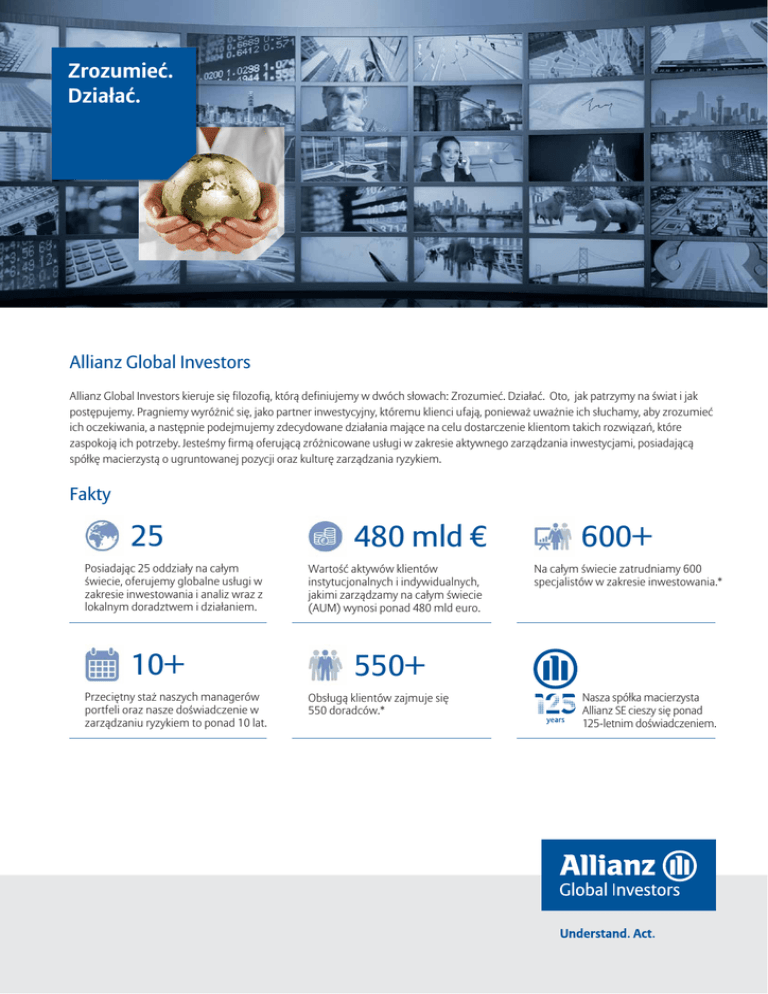 Zrozumieć. Działać. Allianz Global Investors Allianz Global Investors kieruje się filozofią, którą definiujemy w dwóch słowach: Zrozumieć. Działać. Oto, jak patrzymy na świat i jak postępujemy. Pragniemy wyróżnić się, jako partner inwestycyjny, któremu klienci ufają, ponieważ uważnie ich słuchamy, aby zrozumieć ich oczekiwania, a następnie podejmujemy zdecydowane działania mające na celu dostarczenie klientom takich rozwiązań, które zaspokoją ich potrzeby. Jesteśmy firmą oferującą zróżnicowane usługi w zakresie aktywnego zarządzania inwestycjami, posiadającą spółkę macierzystą o ugruntowanej pozycji oraz kulturę zarządzania ryzykiem. Fakty 25 Posiadając 25 oddziały na całym świecie, oferujemy globalne usługi w zakresie inwestowania i analiz wraz z lokalnym doradztwem i działaniem. 10+ Przeciętny staż naszych managerów portfeli oraz nasze doświadczenie w zarządzaniu ryzykiem to ponad 10 lat. 480 mld Wartość aktywów klientów instytucjonalnych i indywidualnych, jakimi zarządzamy na całym świecie (AUM) wynosi ponad 480 mld euro. 600+ Na całym świecie zatrudniamy 600 specjalistów w zakresie inwestowania.* 550+ Obsługą klientów zajmuje się 550 doradców.* Nasza spółka macierzysta Allianz SE cieszy się ponad 125-letnim doświadczeniem. Aktywne zarządzanie Naszym zadaniem jest aktywne inwestowanie w szerokim zakresie możliwości i stylów inwestycyjnych. Nasze wyróżniające się i przedsiębiorcze zespoły inwestycyjne posiadają dogłębną wiedzę na temat rynków, na których inwestują. Zespoły te zarządzają portfelami, które zostały tak skonstruowane, aby ich efekty uzyskane w wyniku realizacji przemyślanych i zdyscyplinowanych procesów inwestycyjnych spełniały oczekiwania klientów. AuM wg klas aktywów y ą Aktywne zarządzanie Instrumenty dlużne1 201 mld Akcje 143 mld AuM wg regionów 366 mld Europa Akcje Instrumenty dlużne USA 84 mld Azja-Pacyfik 30 mld Aktywa mieszane Aktywa mieszane 117 mld Aktywa alternatywne Aktywa alternatywne 19 mld Przewaga informacyjna dzięki GrassrootsSM Research2 Kolejnym źródłem wiedzy jest GrassrootsSM Research – nasz specjalistyczny dział informacji i badań rynkowych. Grassroots co roku publikuje ponad 350 analiz spółek i branż, wspierając decyzje inwestycyjne z myślą o przyszłości. 50+ 300+ 50.000+ Sprawozdawców Badaczy terenowych Kontaktów branżowych Ponad 60 lat doświadczeń Początki – niemiecki cud gospodarczy Ekspansja globalna – Utworzenie Allianz Global Investors /ADIG jako pierwszej firmy – Uwzględnienie aspektów społecznie odpowiedzialnego inwestycyjnej na rynku niemieckim (1949) inwestowania (SRI) we wszystkich kategoriach aktywów – Fondra (1950, najstarszy niemiecki fundusz wspólnego inwestowania) (2010) – Fondak (1950, pierwszy niemiecki fundusz akcyjny) – AllianzGI jest jedną z pierwszych firm zarządzających – Uruchomienie pierwszego w historii funduszu obligacyjnego w aktywami inwestujących w rozwiązania infrastrukturalne Niemczech (1966) (2012) 1949 – 1979 1980 – 1999 2000 dalej Rozwój – Uruchomienie pierwszego funduszu w ramach franczyzy Europe Equity Growth: Wachstum Europa (1986) – Uruchomienie cieszącego się powodzeniem rozwiązania obejmującego różne klasy aktywów: Kapital Plus (1994) Teraźniejszość Aktywne zarządzanie aktywami w oparciu o kulturę zarządzania ryzykiem Nasza zdywersyfikowana działalność obejmuje: strategie akcyjne, papierów dłużnych, inwestycje alternatywne i strategie wielu klas aktywów Dane wg. stanu na dzień 31 grudnia 2016 r. (*Dane wg. stanu na dzień 30 września 2016 r.). 1 Obejmuje rynek pieniężny. 2 GrassrootsSM Research jest działem Allianz Global Investors, który zleca wykonanie badań rynkowych dla specjalistów w zakresie zarządzania aktywami. IInwestycje wiążą się z ryzykiem. Wartość inwestycji i dochód z niej mogą zarówno spadać, jak i rosnąć, a inwestorzy mogą nie odzyskać całości zainwestowanych kwot. Poglądy i opinie wyrażone w niniejszym dokumencie, które mogą ulegać zmianie bez uprzedniego zawiadomienia, są poglądami i opiniami emitentów aktualnymi na dzień publikacji. Użyte dane pochodzą z różnych źródeł, przy czym zakłada się, że są one poprawne i rzetelne, choć nie podlegały niezależnej weryfikacji; nie gwarantuje się ich dokładności ani kompletności oraz nie przyjmuje się odpowiedzialności za żadne bezpośrednie ani wynikowe straty powstałe w związku z ich wykorzystaniem, chyba że spowodowane zostaną rażącym zaniedbaniem lub świadomą niewłaściwą realizacją obowiązków. Warunki bazowej oferty lub umowy, która mogła zostać lub zostanie złożona bądź zawarta, mają moc nadrzędną i obowiązującą. Niniejszy dokument ma charakter komunikatu marketingowego wydanego przez Allianz Global Investors GmbH, www.allianzgi.com, spółkę inwestycyjną z ograniczoną odpowiedzialnością, z siedzibą w Niemczech pod adresem Bockenheimer Landstrasse 42–44, 60323 Frankfurt nad Menem, wpisaną do rejestru prowadzonego przez sąd we Frankfurcie nad Menem pod numerem HRB 9340, posiadającą zezwolenie na prowadzenie działalności wydane przez Bundesanstalt für Finanzdienstleistungsaufsicht (www.bafin.de). Powielanie, publikowanie lub przekazywanie w jakiejkolwiek formie treści niniejszego dokumentu, bez względu na formę przekazu, jest zabronione.